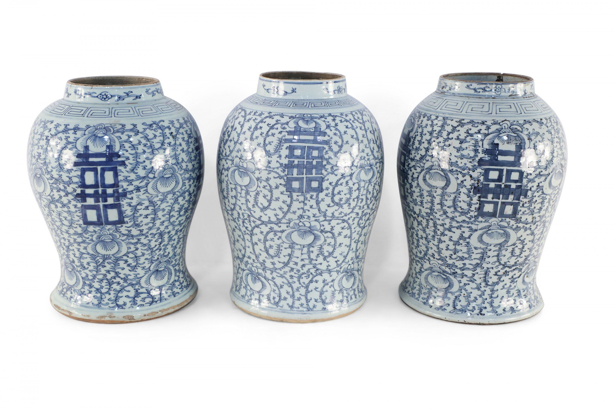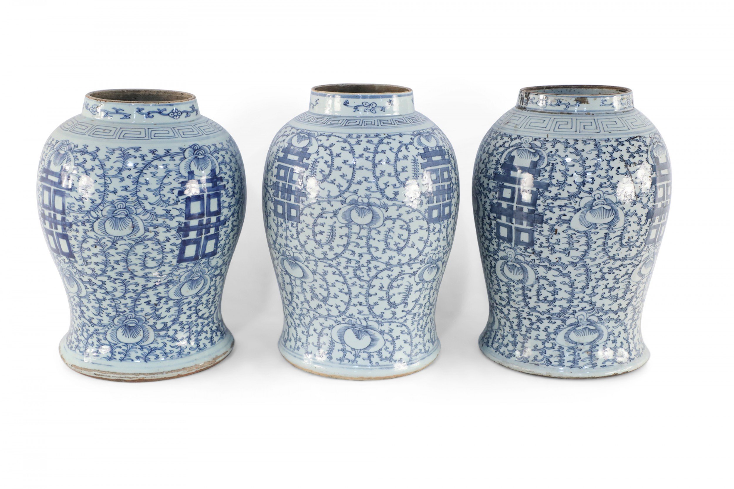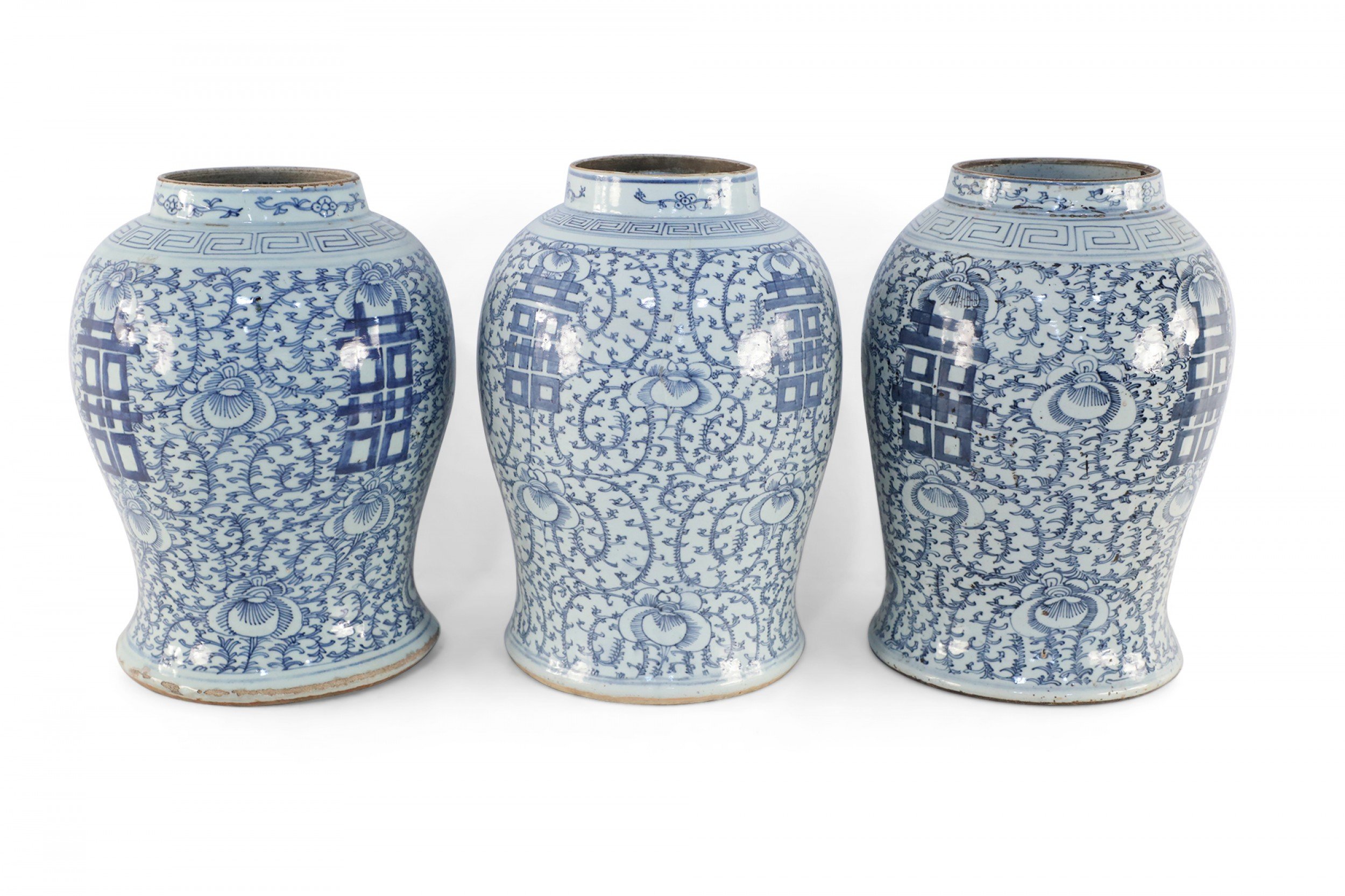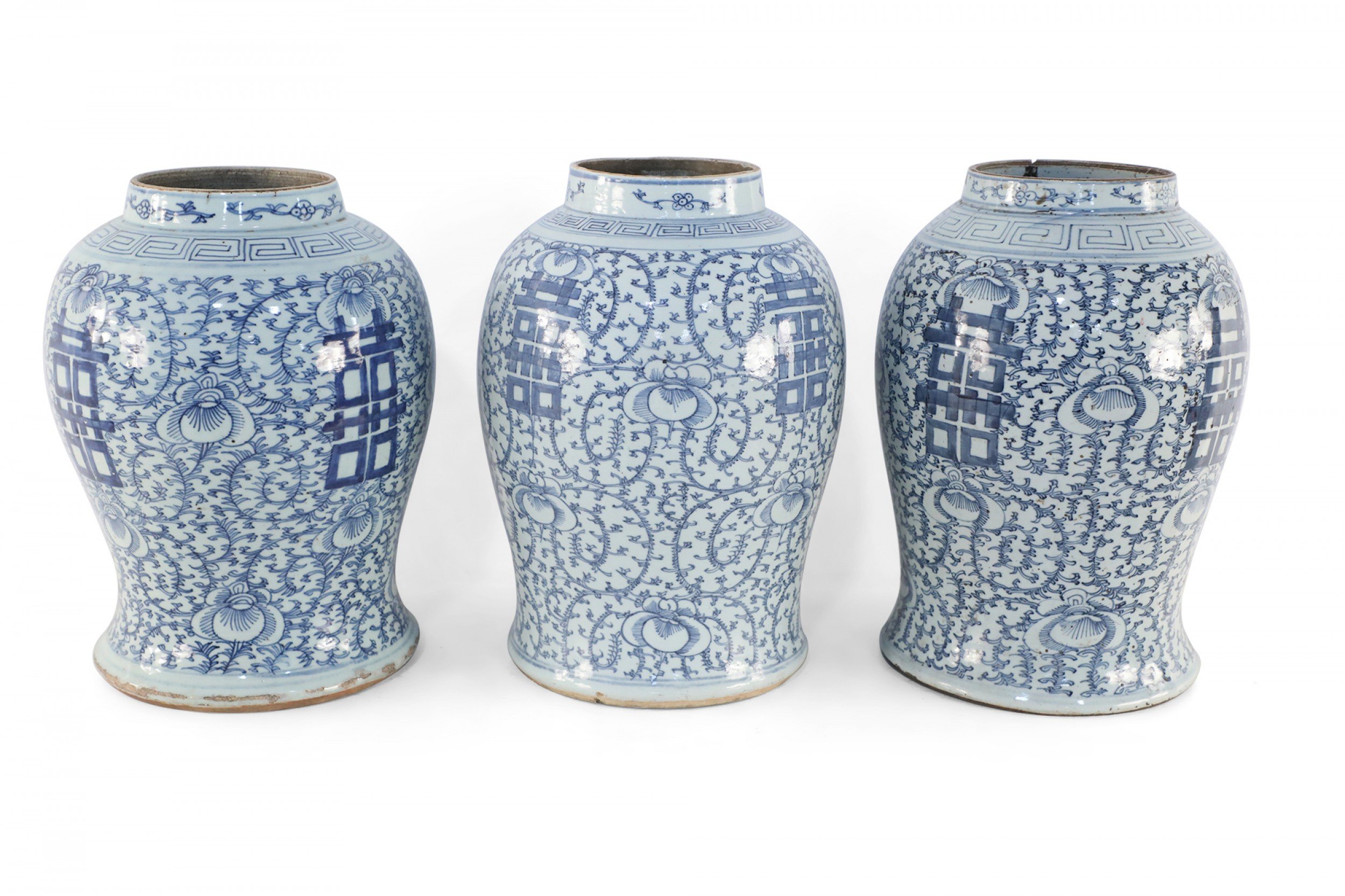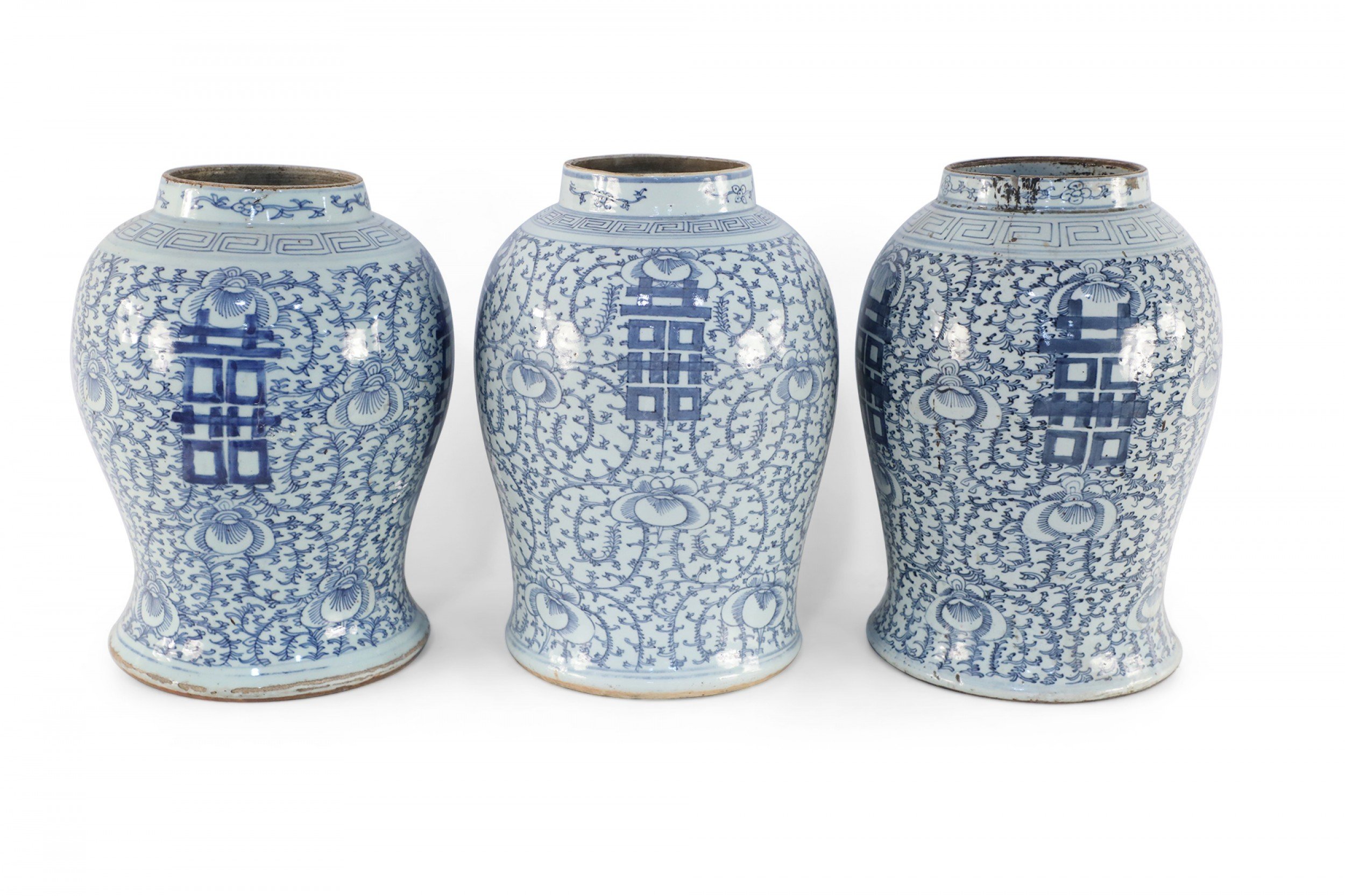 4 Similar antique Chinese (Early 20th Century) off-white ceramic vases with urn forms decorated in light blue, delicate vine and floral motifs and bold characters on 4 sides (jars vary slightly in size, pattern, and color)(PRICED EACH).