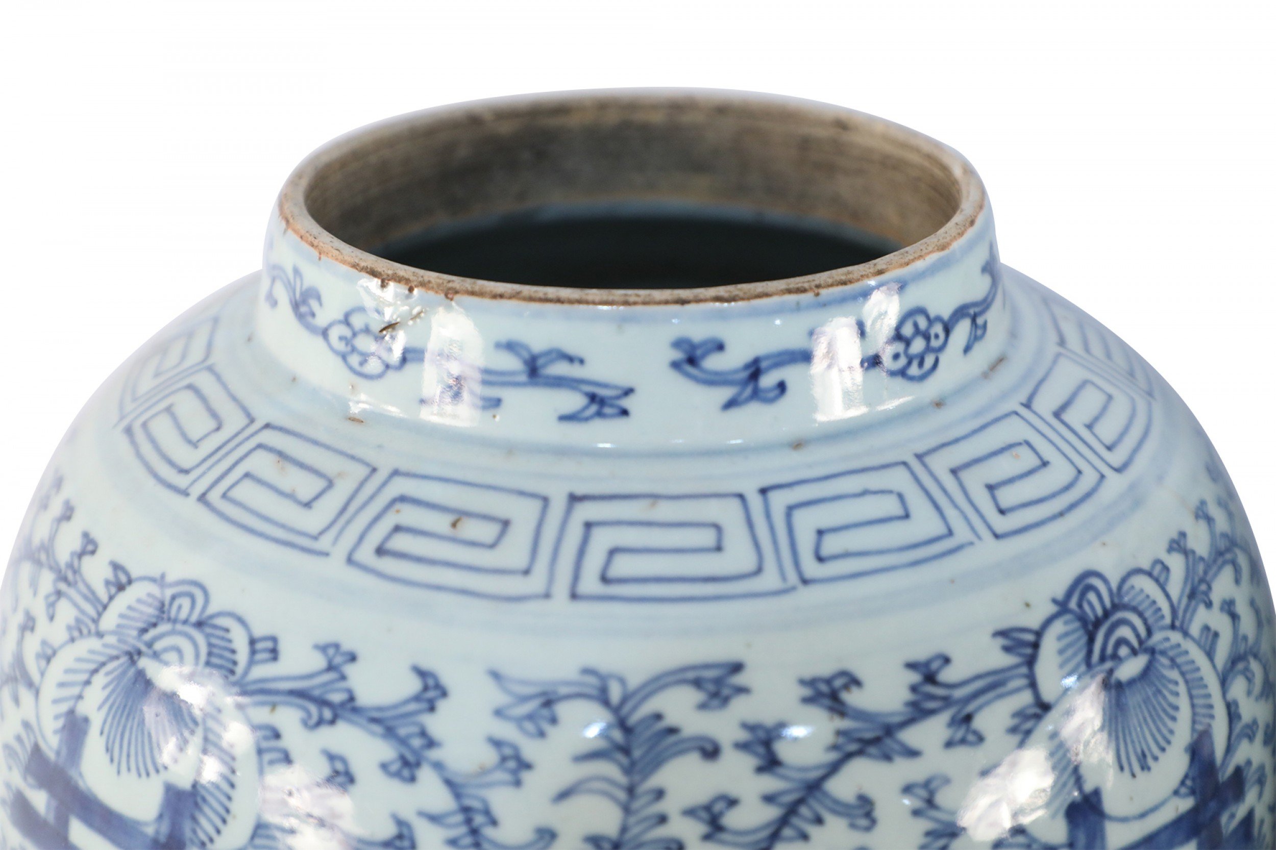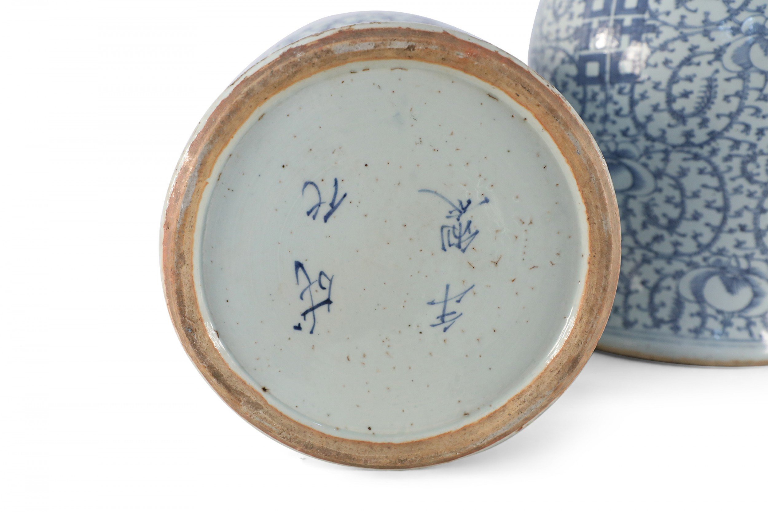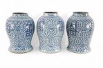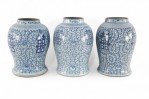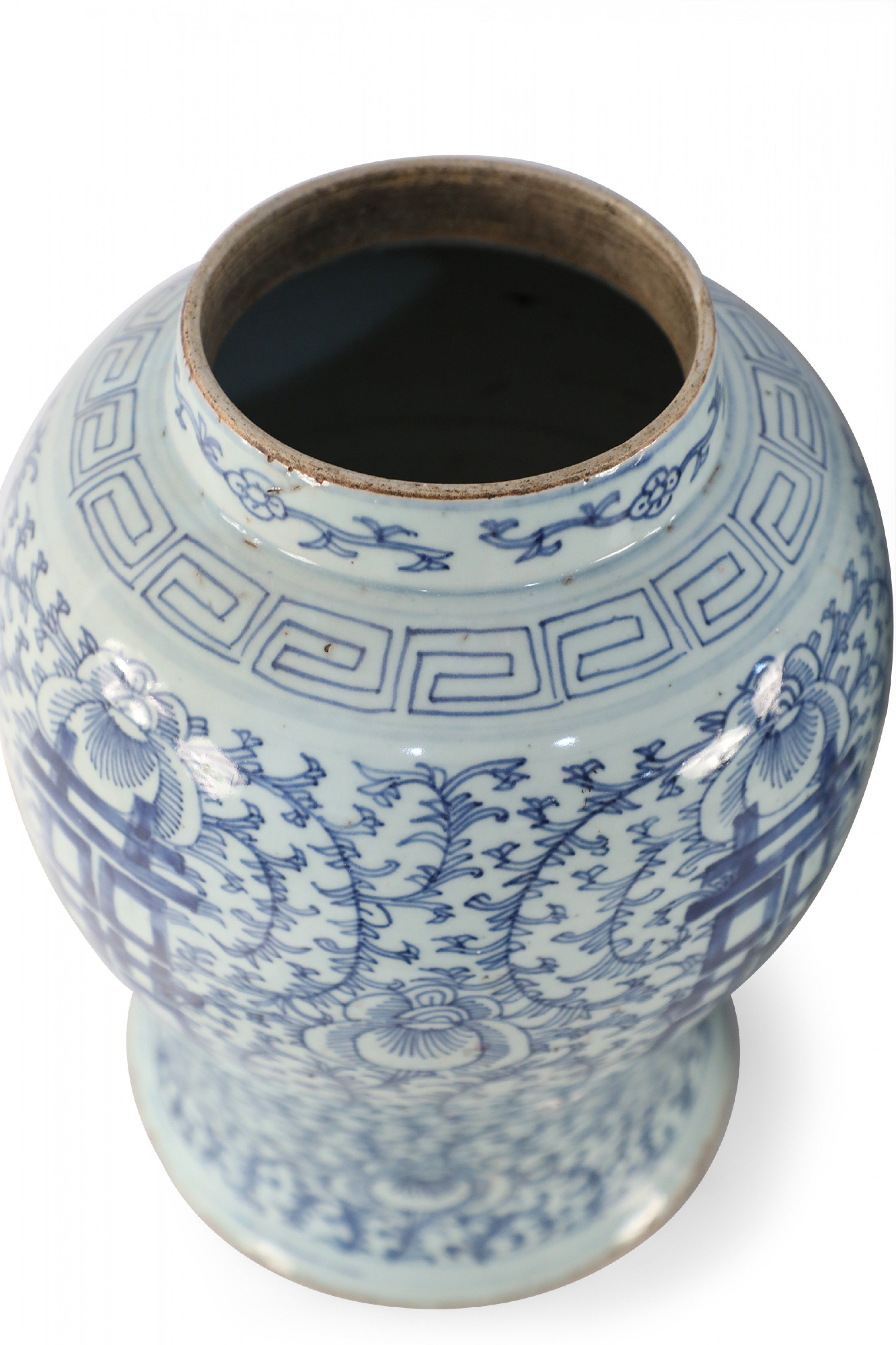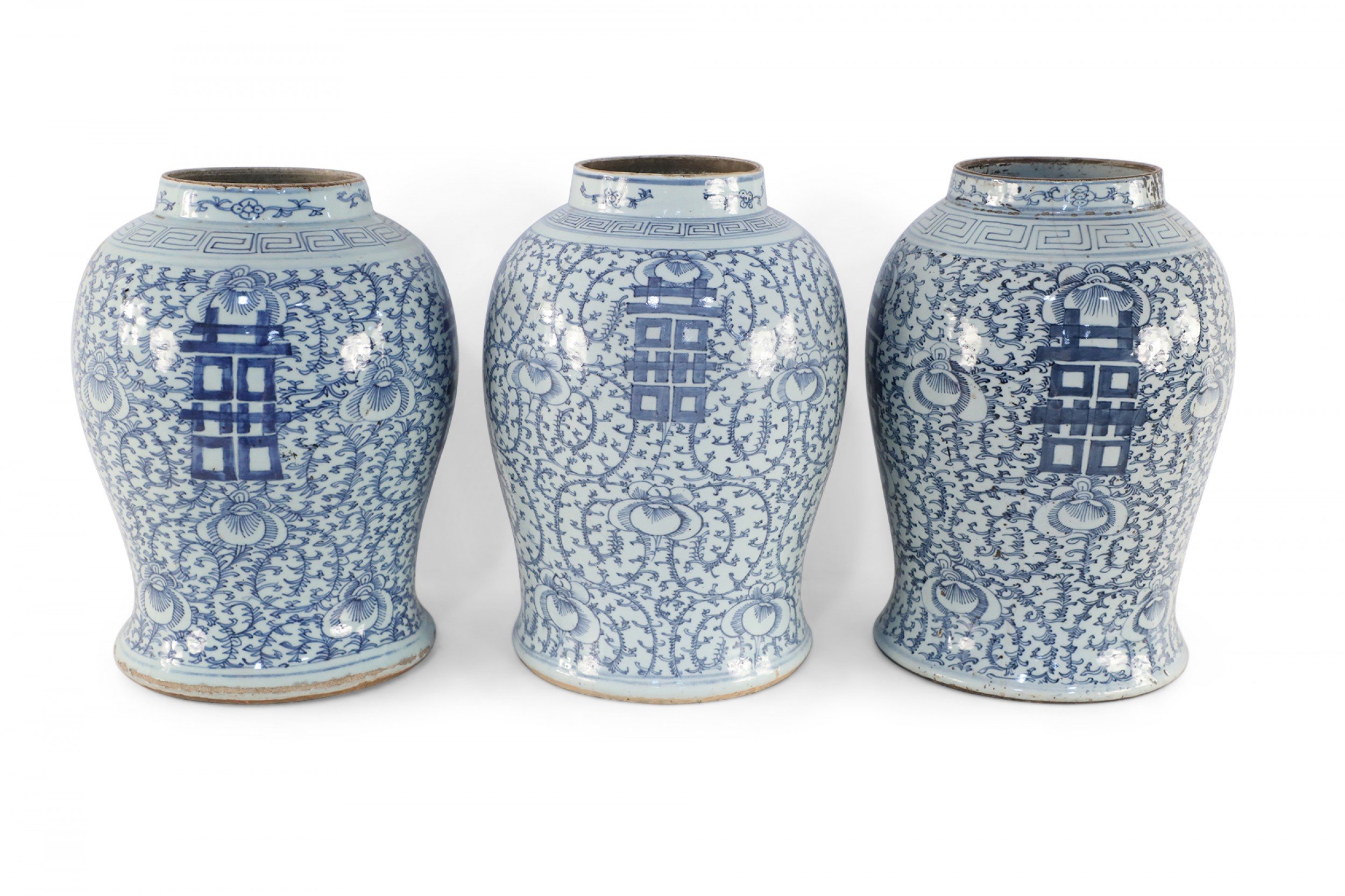 4 Similar antique Chinese (Early 20th Century) off-white ceramic vases with urn forms decorated in light blue, delicate vine and floral motifs and bold characters on 4 sides (jars vary slightly in size, pattern, and color)(PRICED EACH).