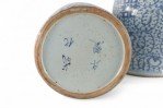 4 Similar antique Chinese (Early 20th Century) off-white ceramic vases with urn forms decorated in light blue, delicate vine and floral motifs and bold characters on 4 sides (jars vary slightly in size, pattern, and color)(PRICED EACH)