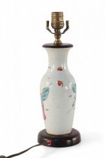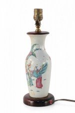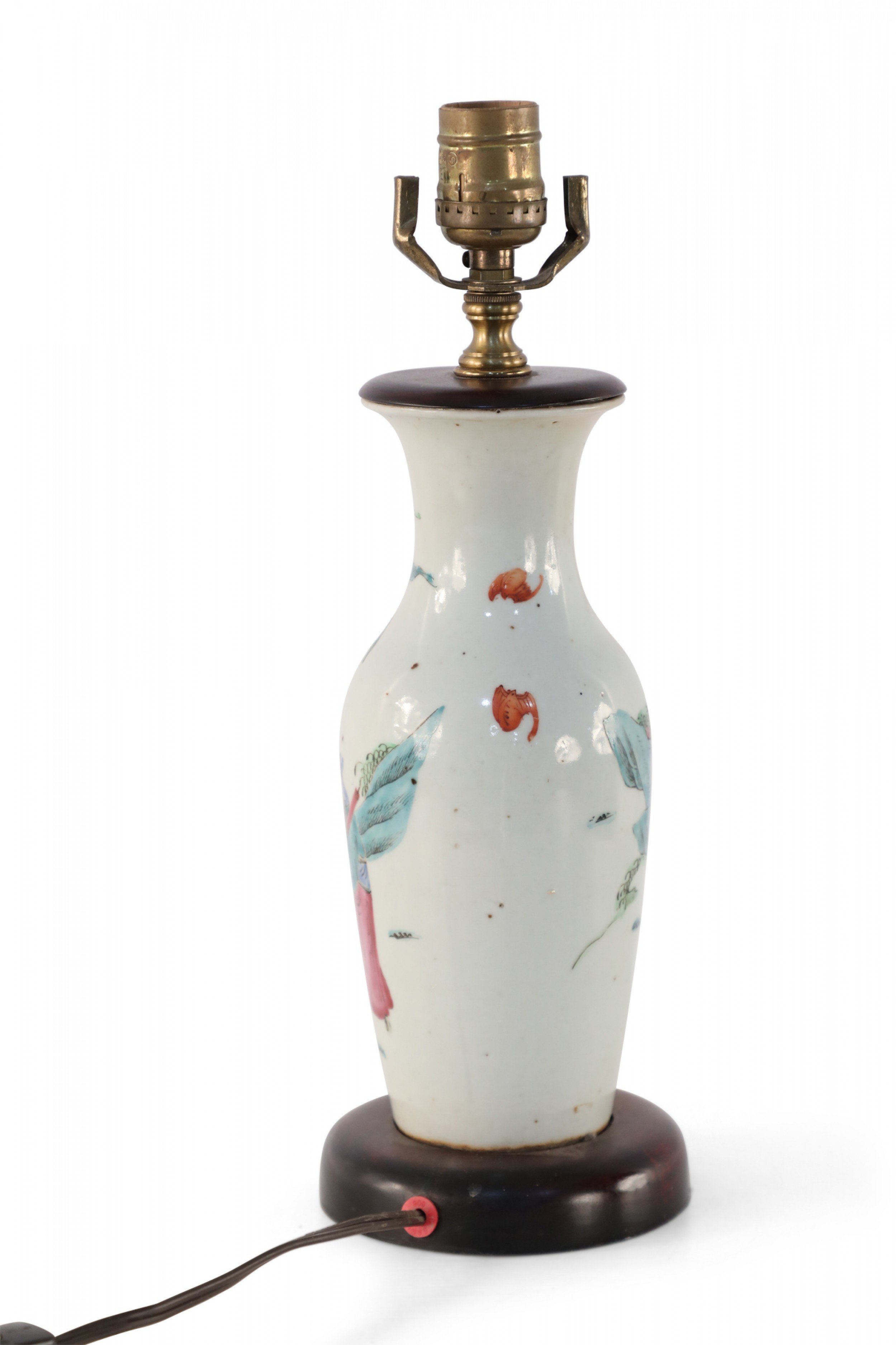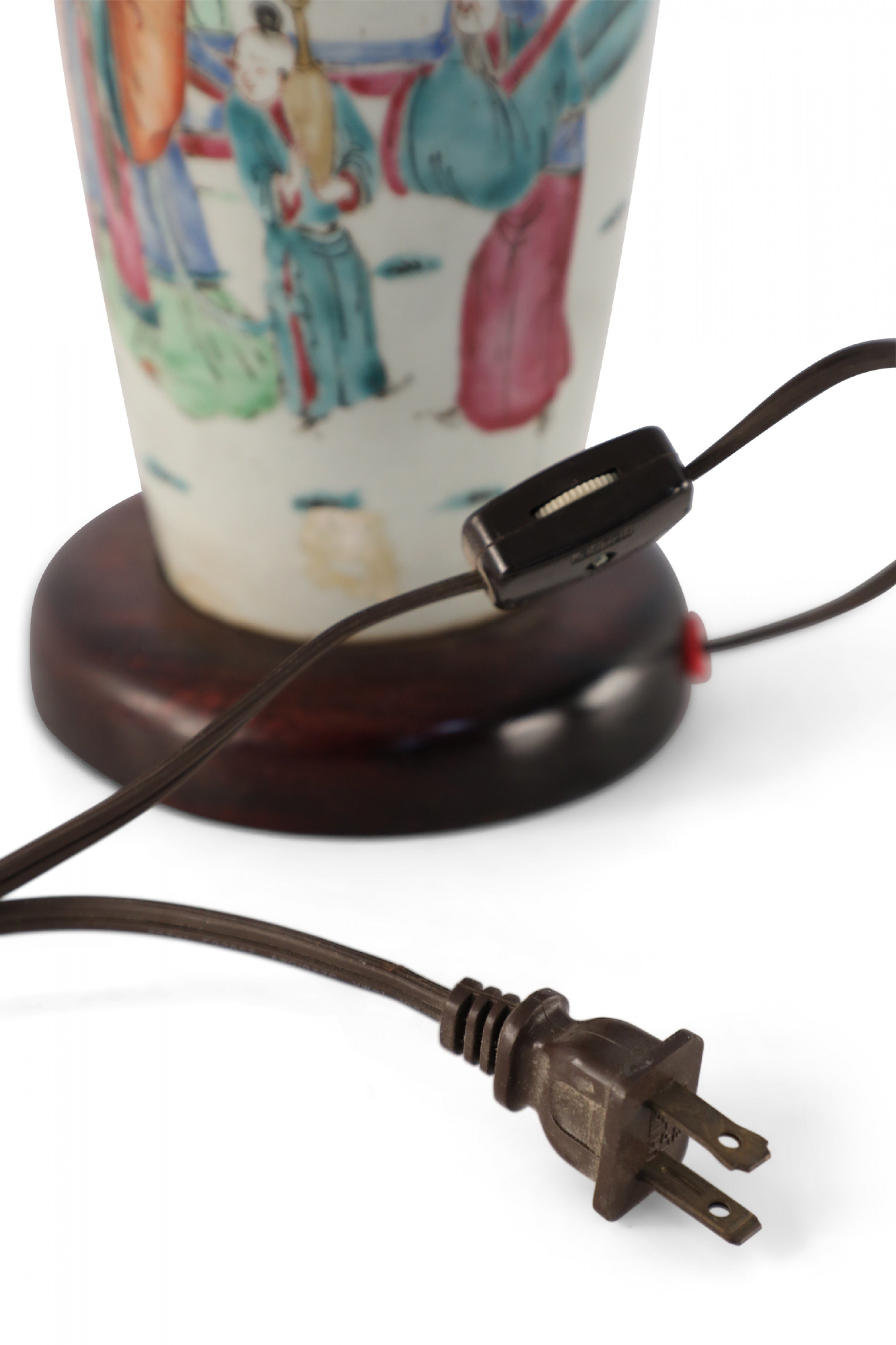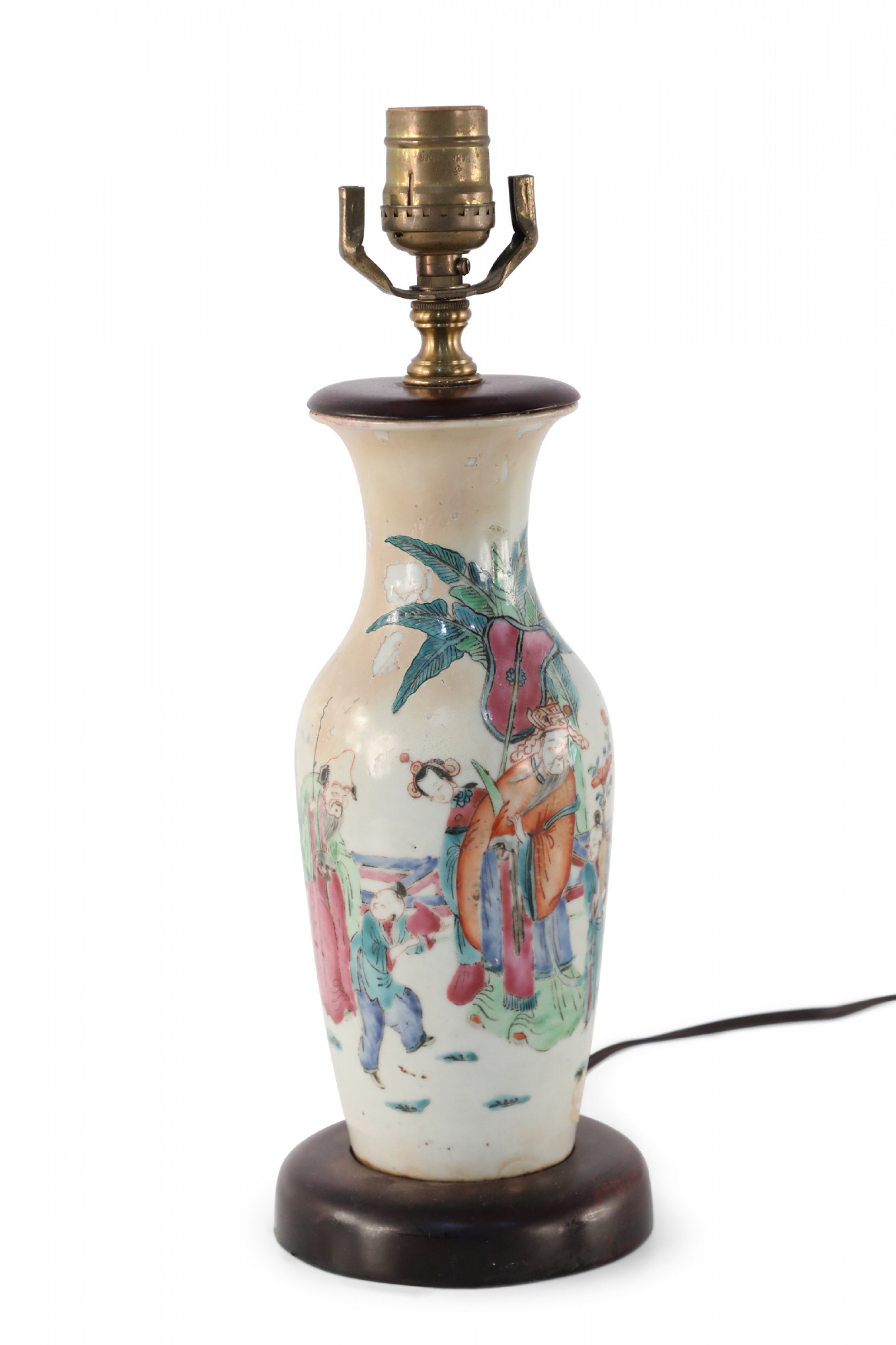 Antique Chinese (Late 19th Century) table lamp made from an off-white, urn-shaped, porcelain vase depicting a joyful scene of gift-bearing children greeting elders in a pastoral setting. The vase is mounted on a wooden base and fitted with brass hardware..