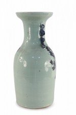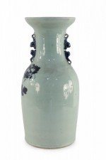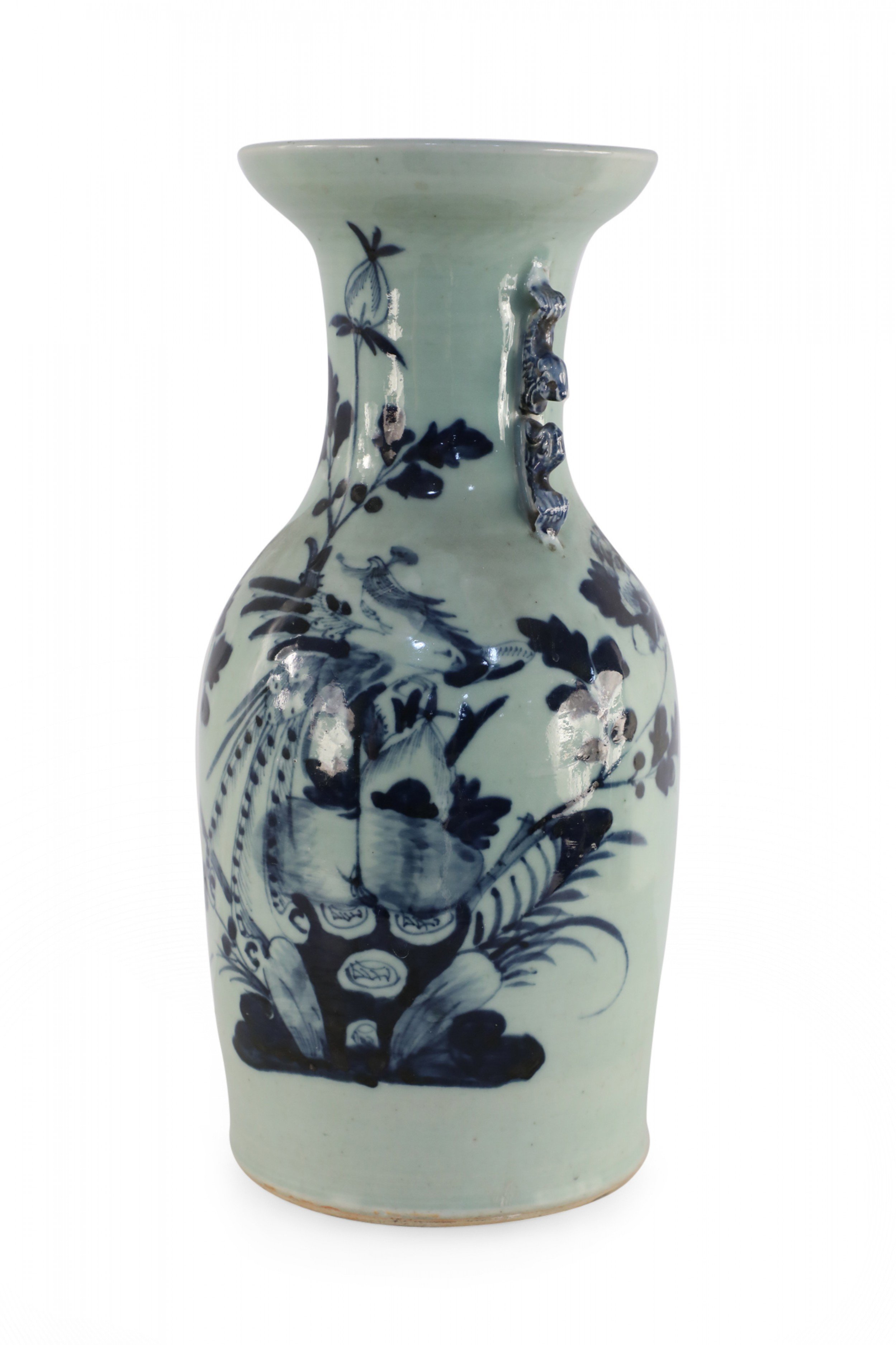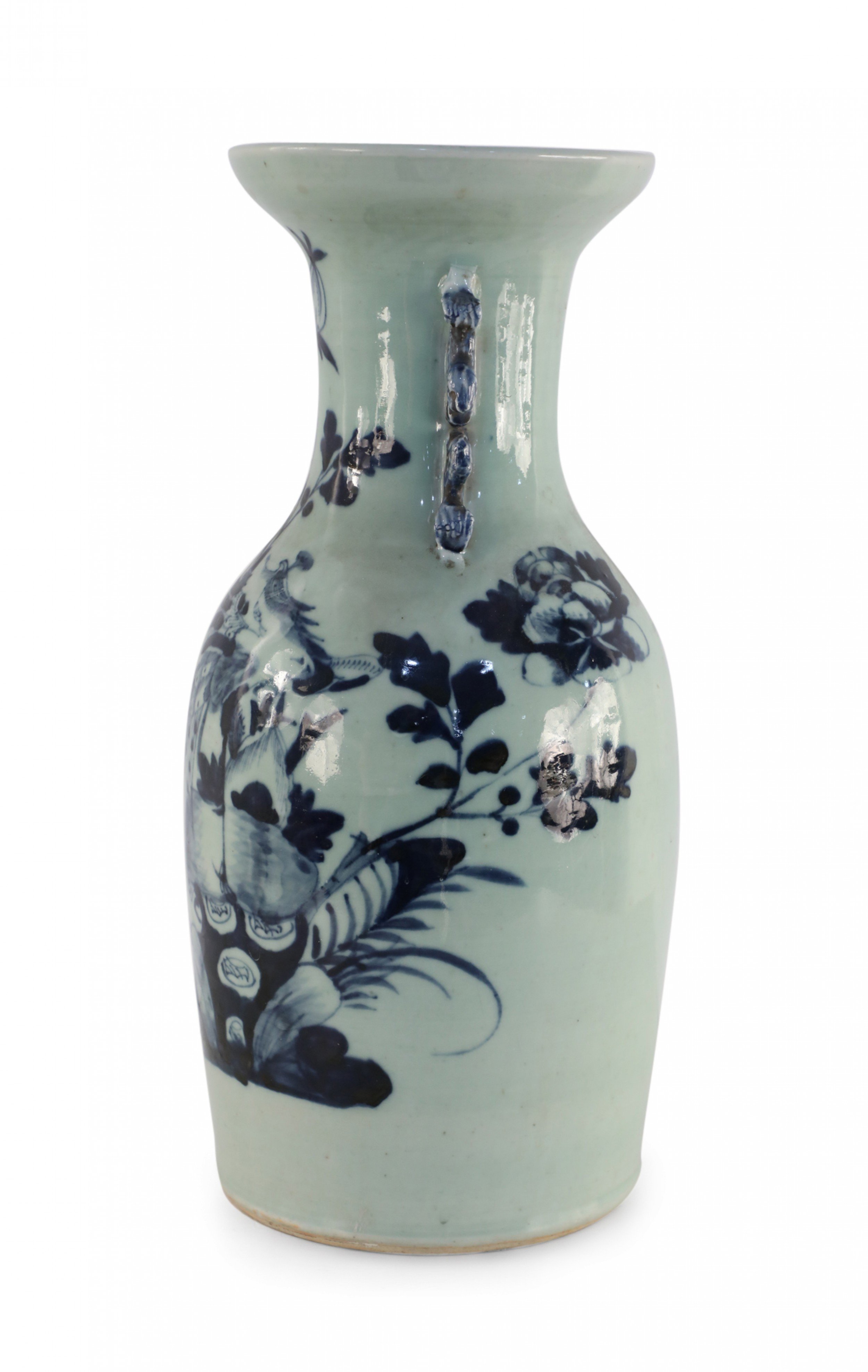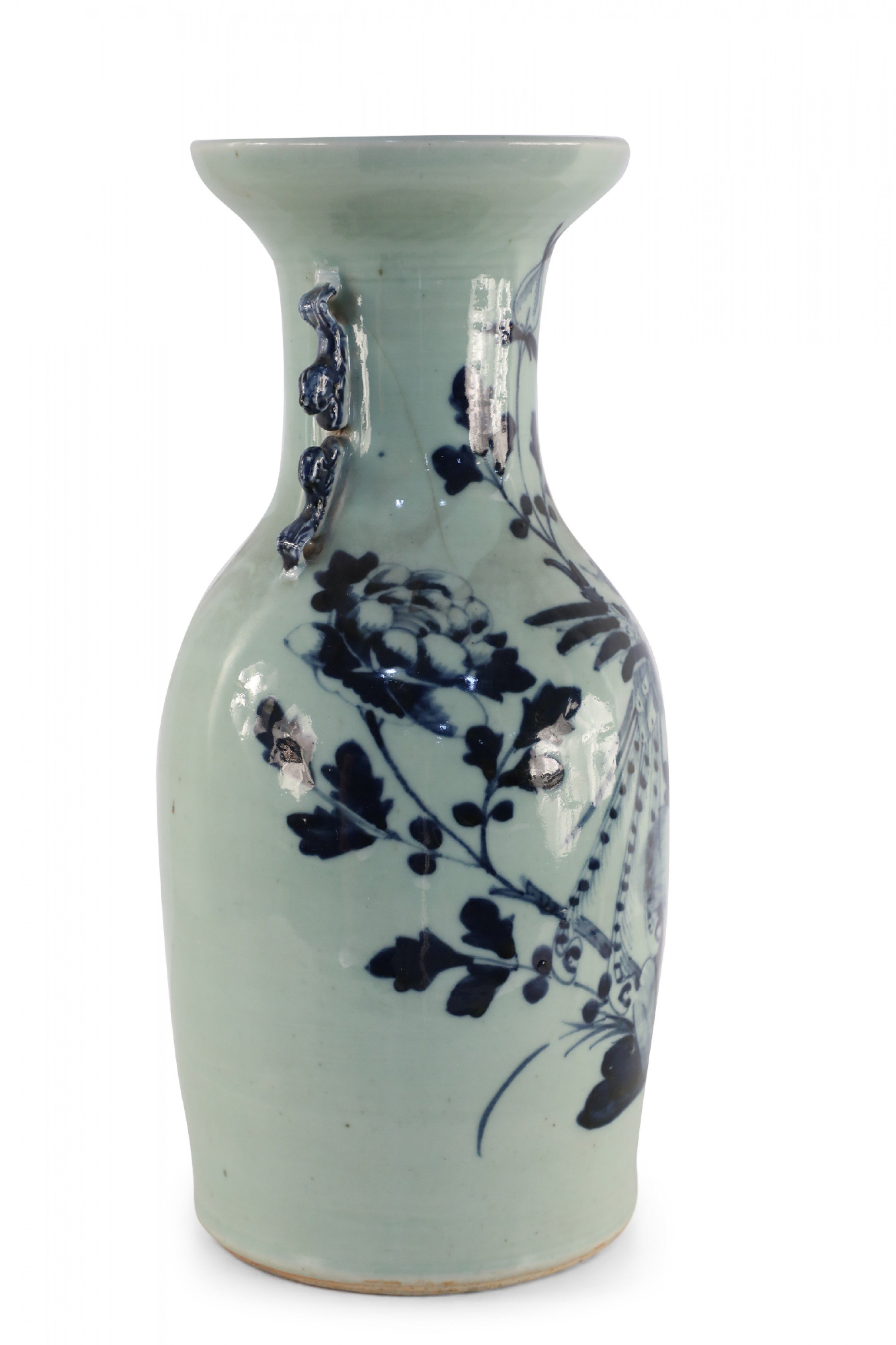 Antique Chinese (Late 19th Century) off-white, porcelain urn with a navy blue bird amid florals and two blue scrolled handles along the neck.