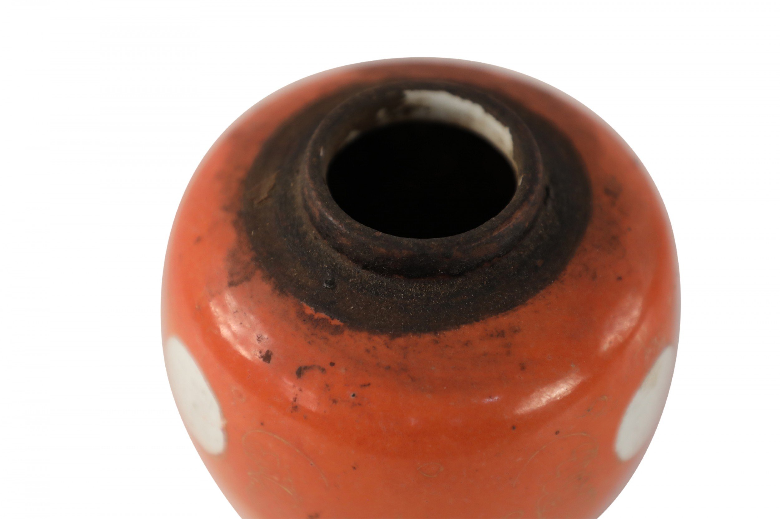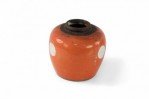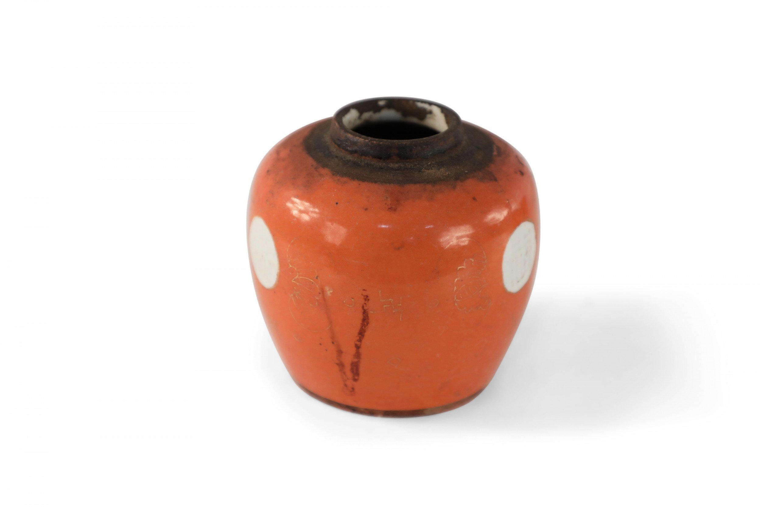 Chinese small, round orange porcelain vase with gold detailing surrounding white circular shapes and a brown band around the mouth opening.