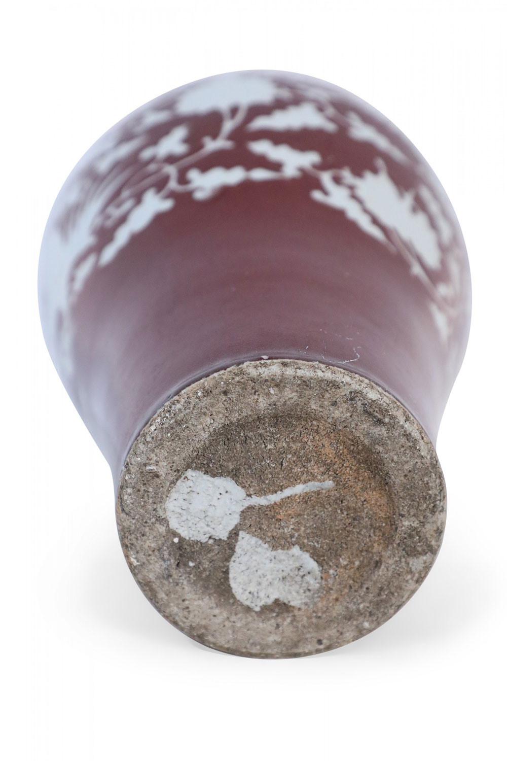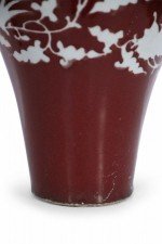 Chinese porcelain Meiping vase in a red oxblood hue decorated with a white natural motif capturing the silhouettes of birds, vines and leaves.