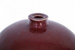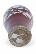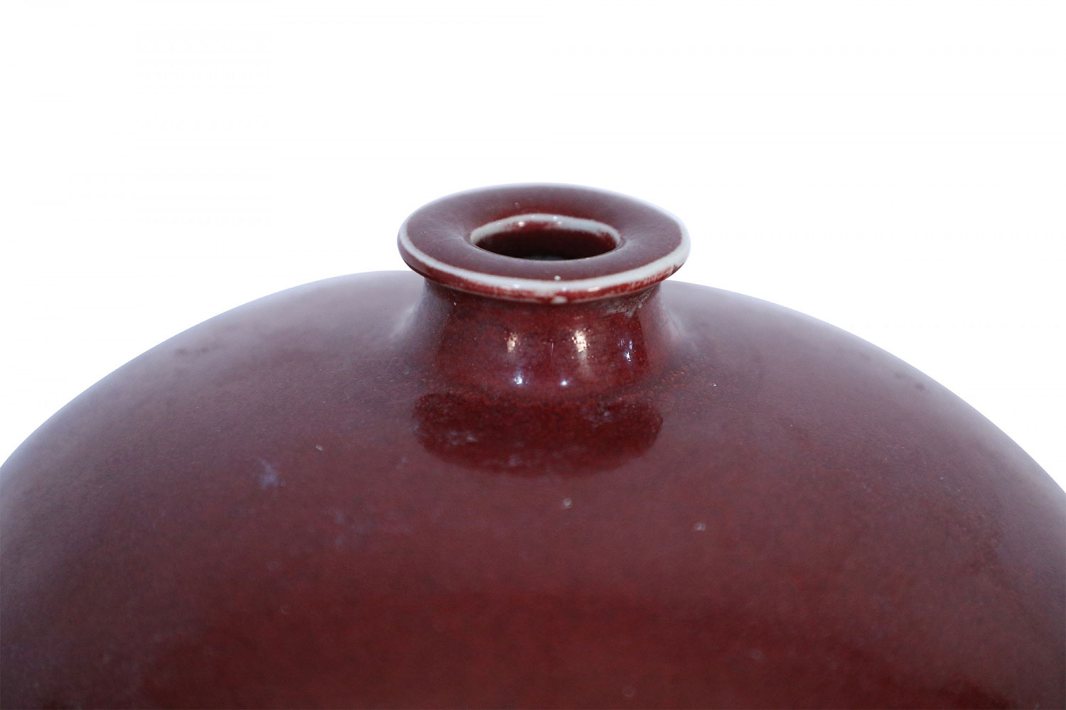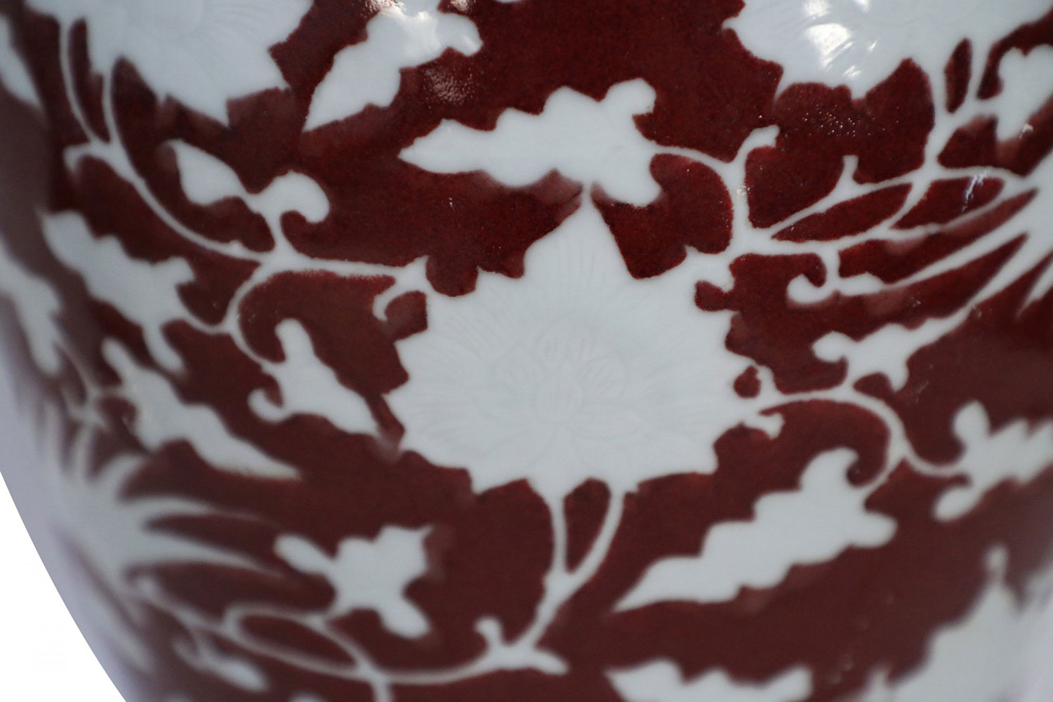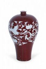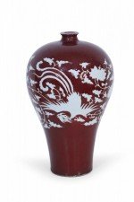 Chinese porcelain Meiping vase in a red oxblood hue decorated with a white natural motif capturing the silhouettes of birds, vines and leaves..