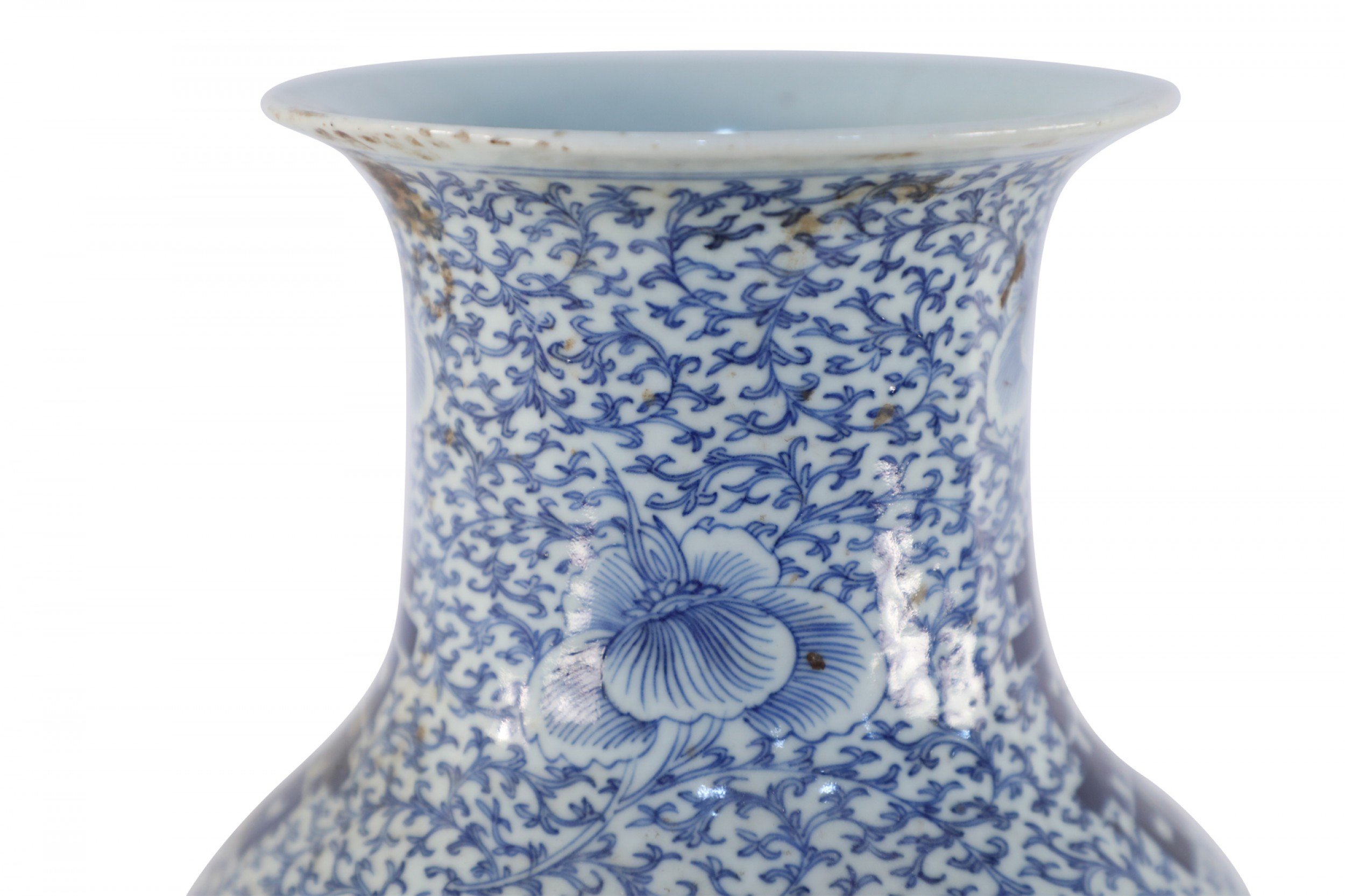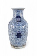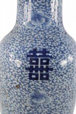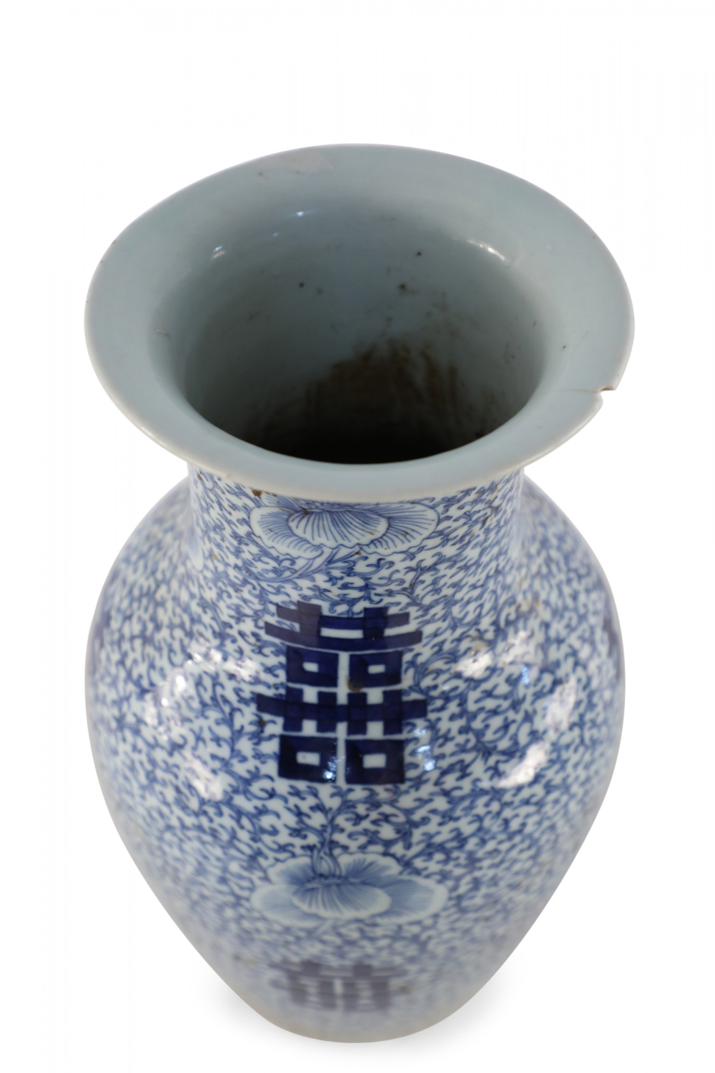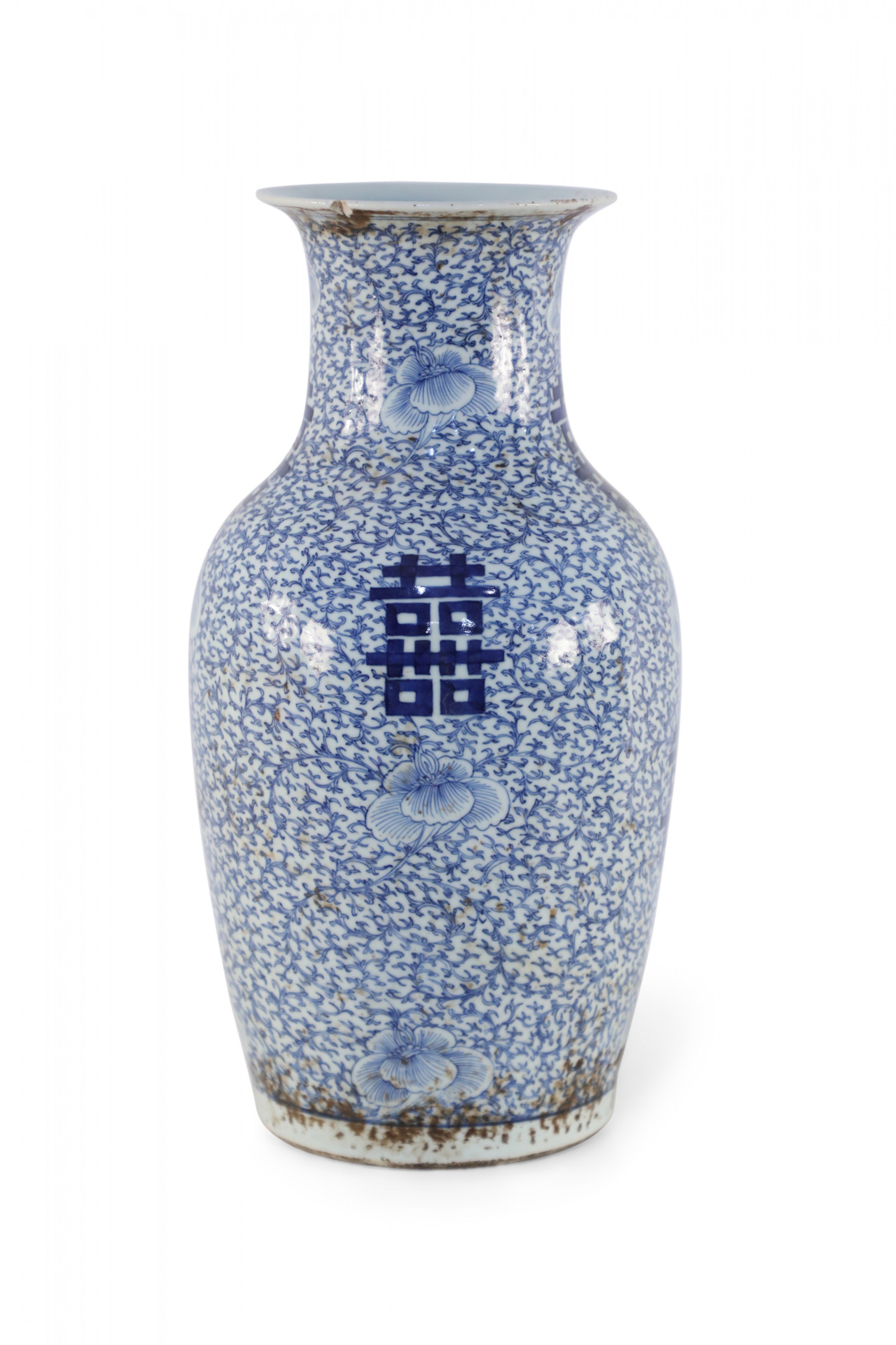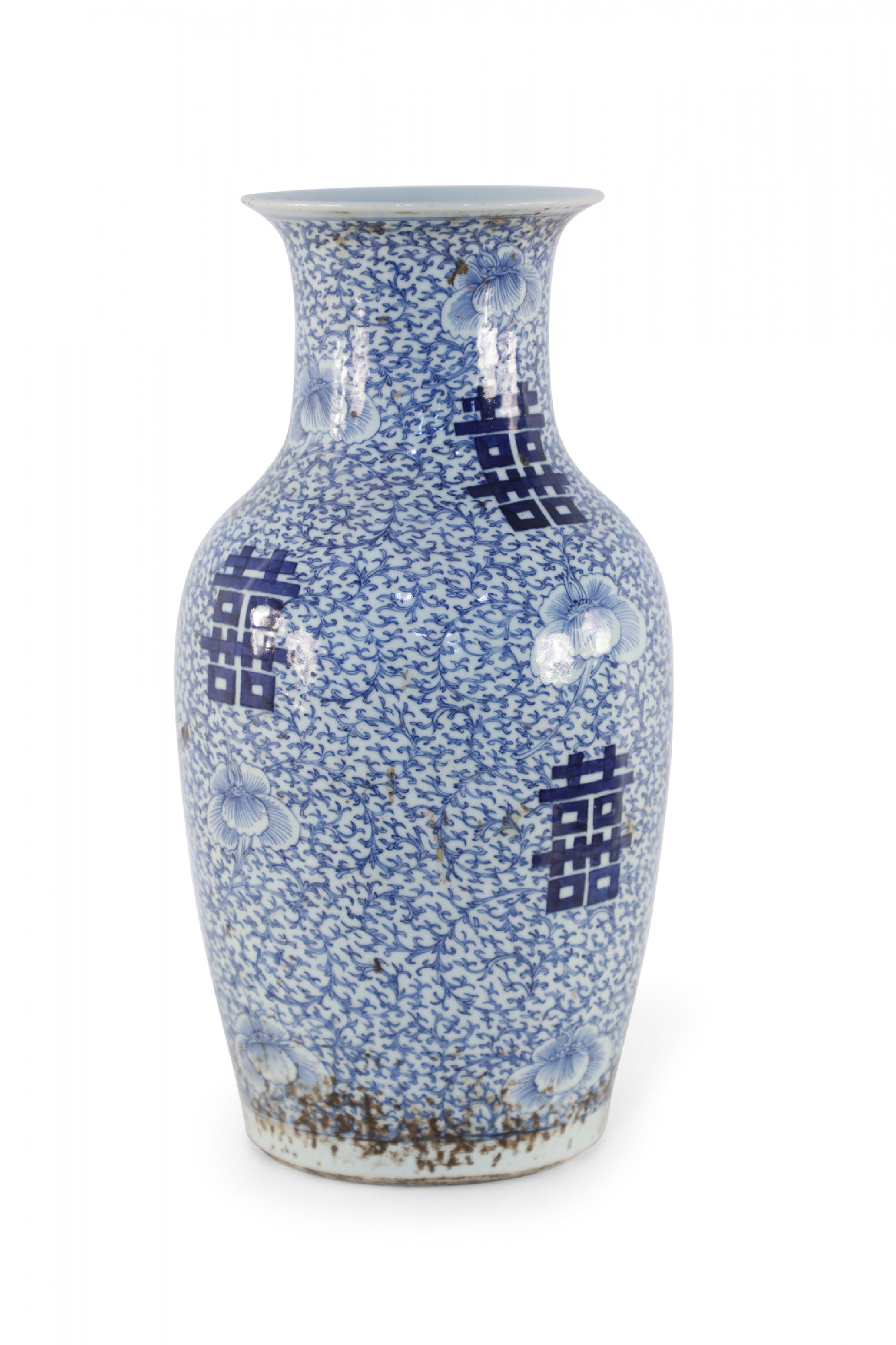 Antique Chinese (Early 20th Century) white porcelain urn decorated with an all-over blue vine and flower patterned ground, surrounding spaced bold, blue characters..