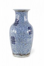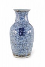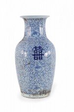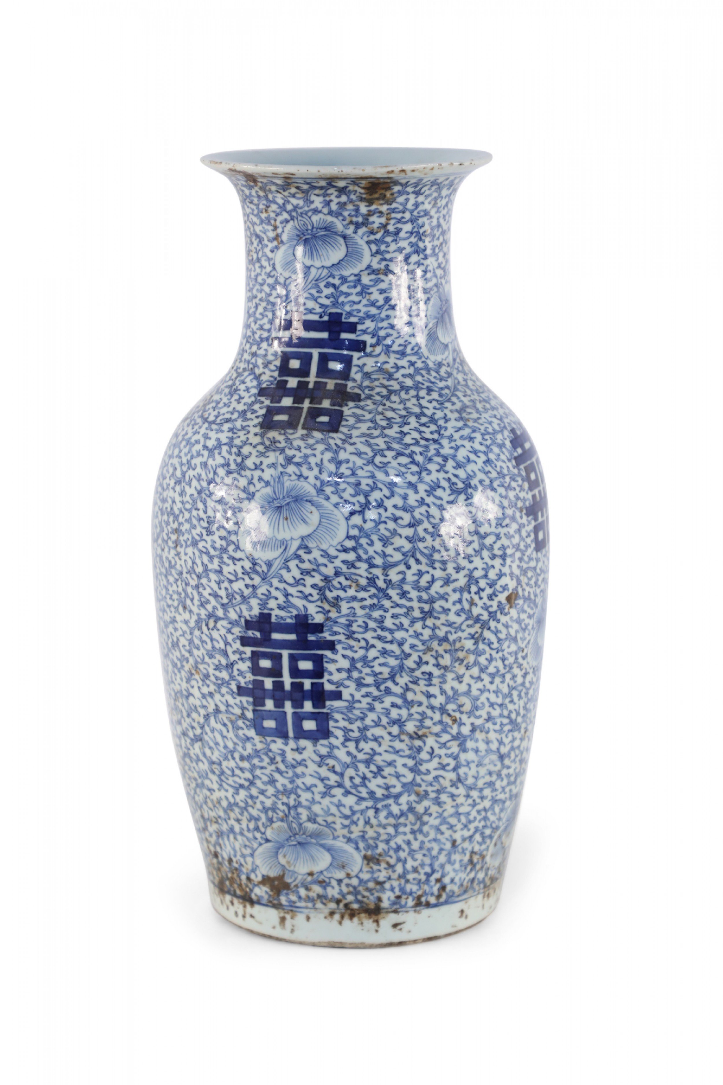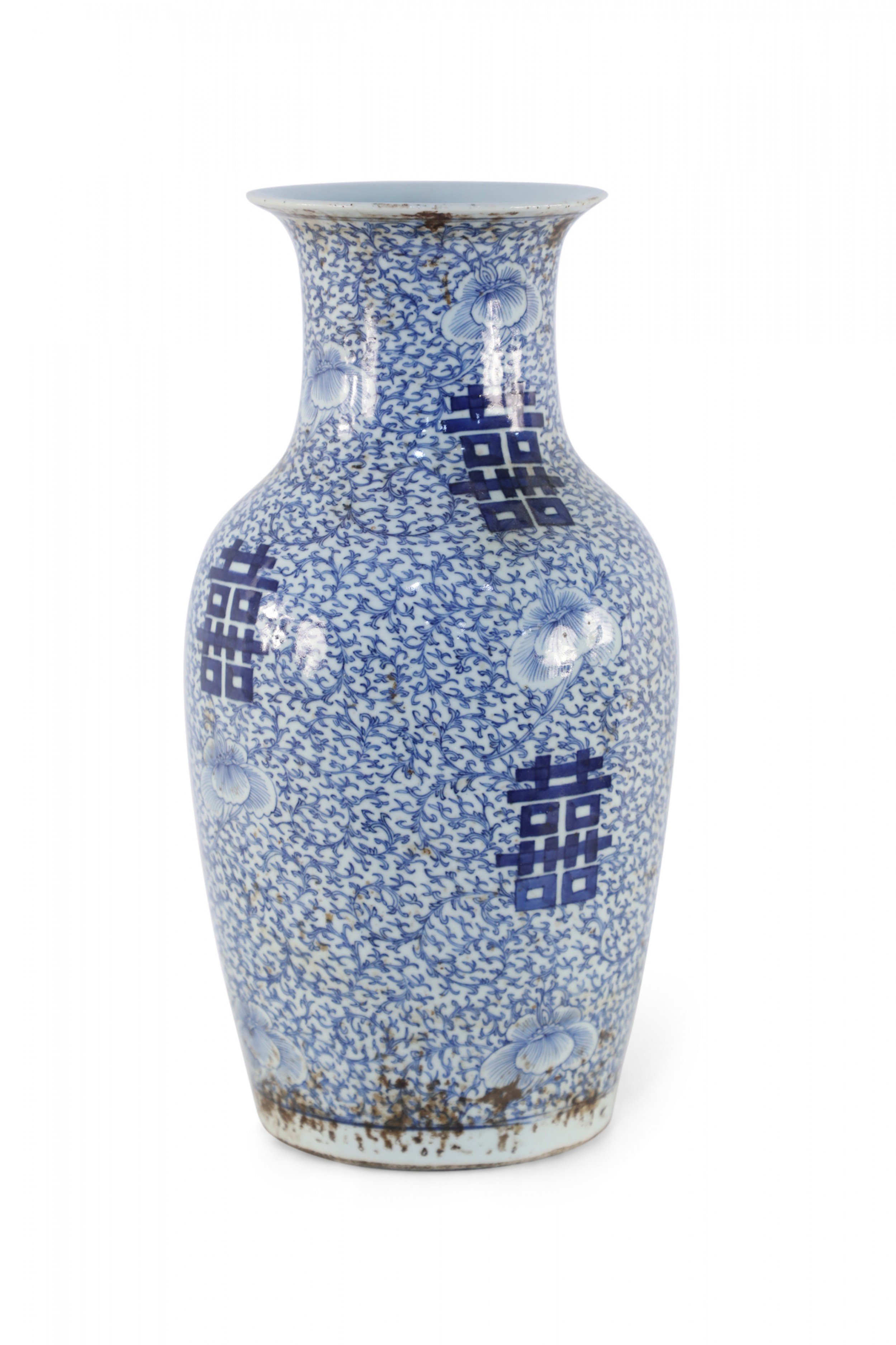 Antique Chinese (Early 20th Century) white porcelain urn decorated with an all-over blue vine and flower patterned ground, surrounding spaced bold, blue characters.