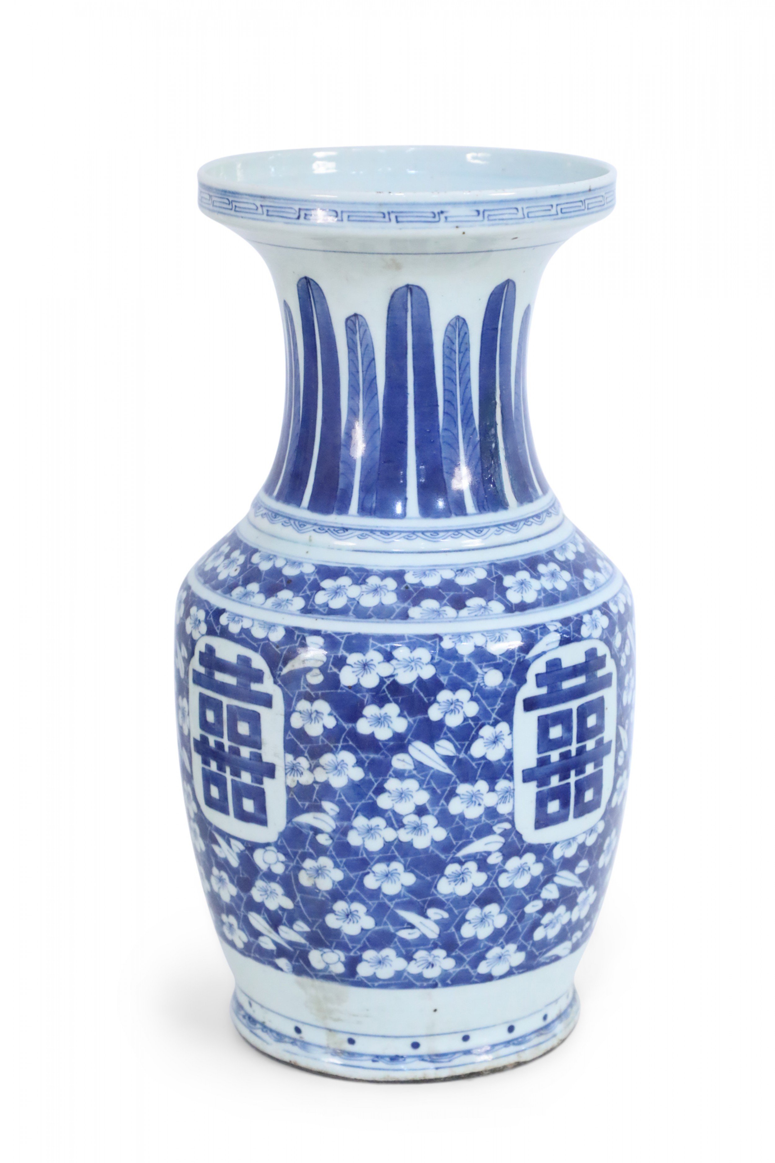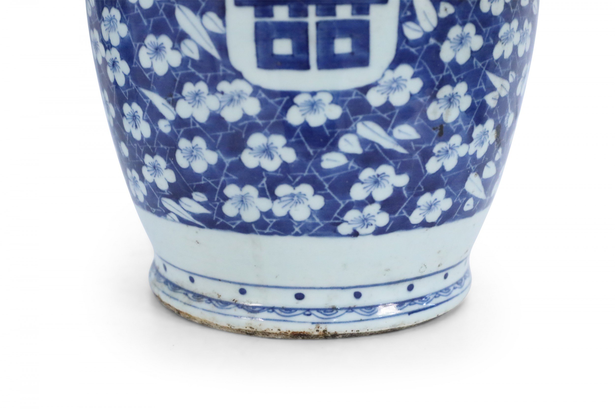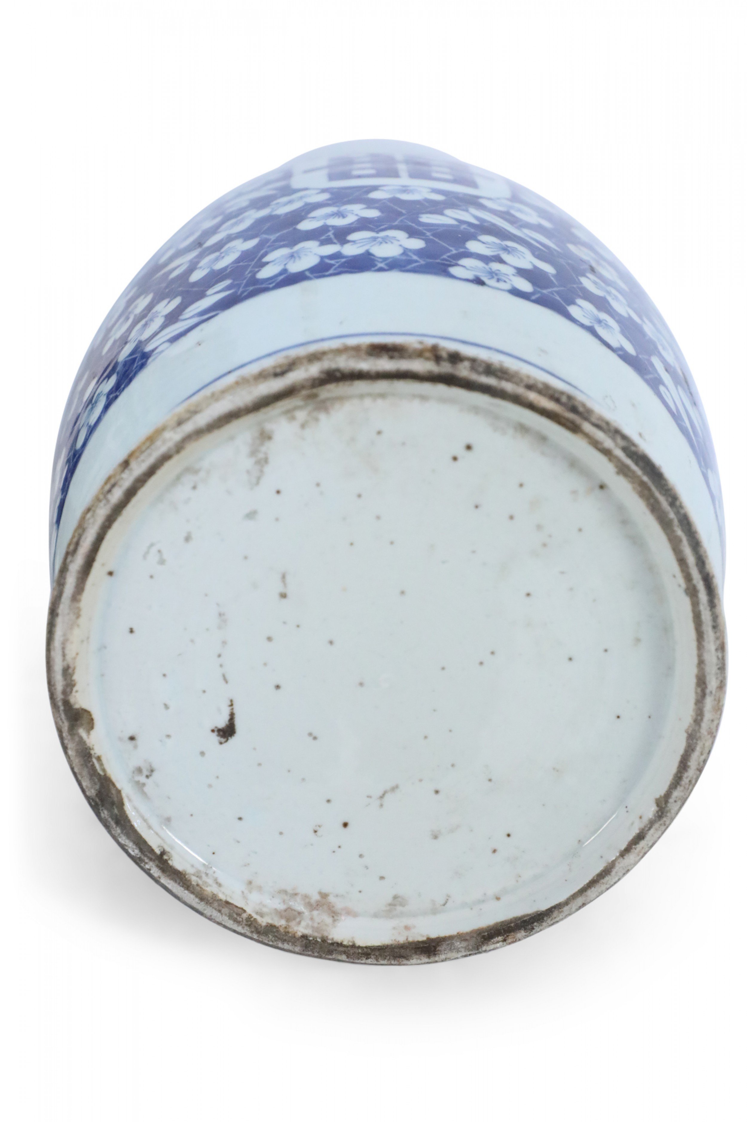 Chinese porcelain urn painted with a blue and white floral background surrounding a center white oval with bold markings, dark blue feathers along the neck, and geometric patterned bands at the top, middle and base..