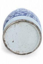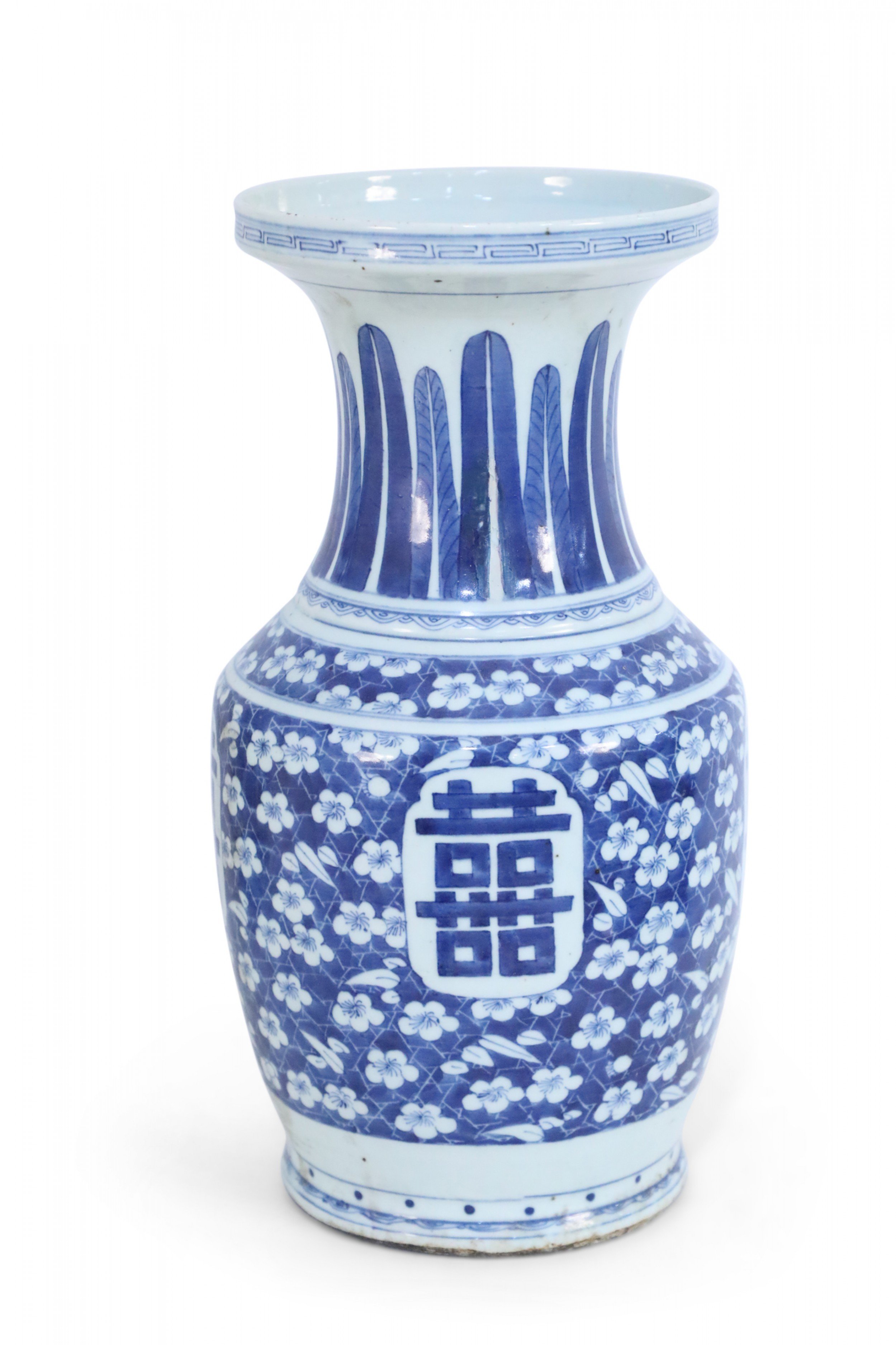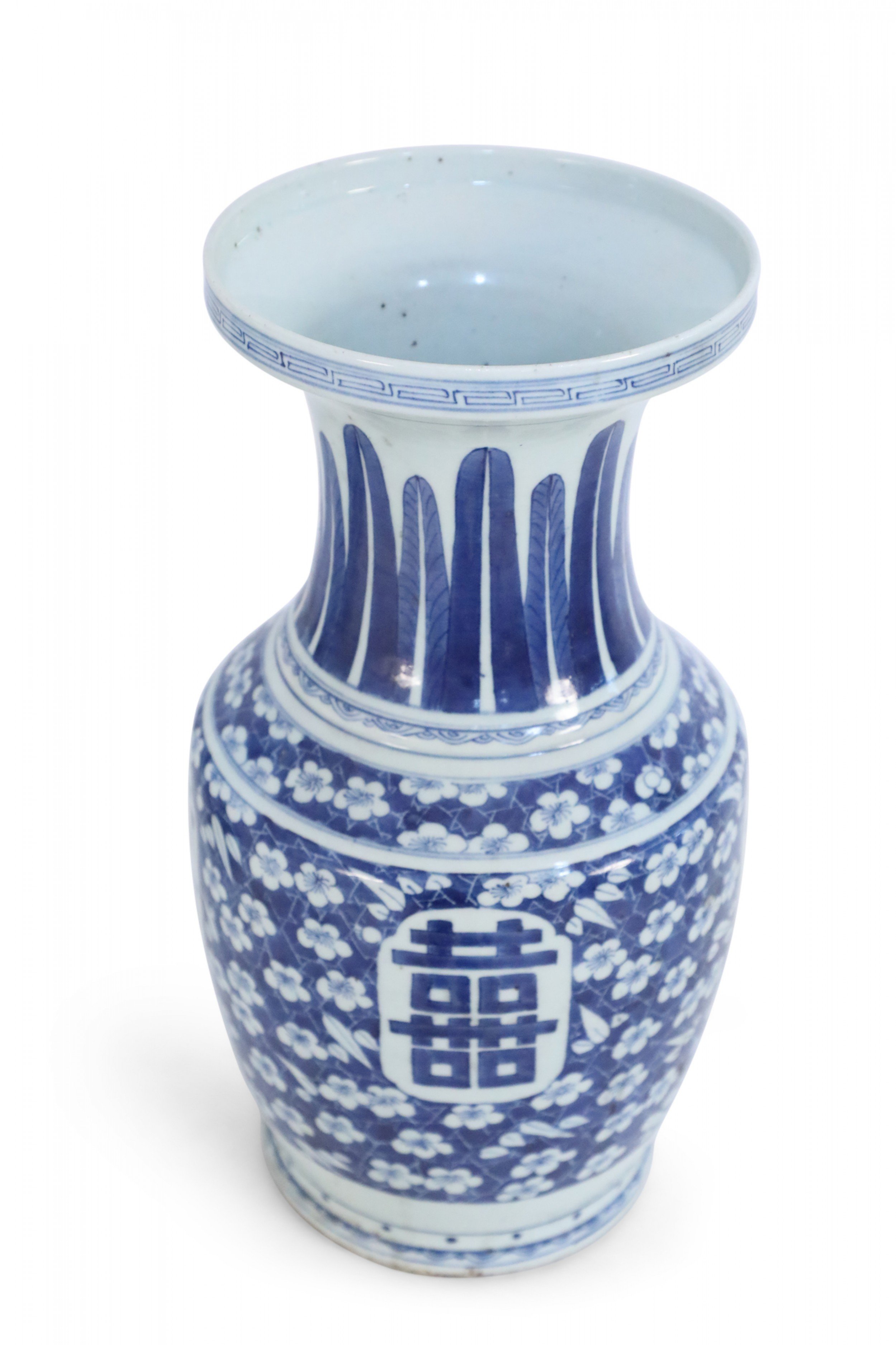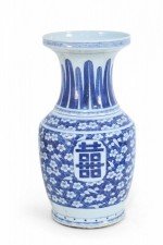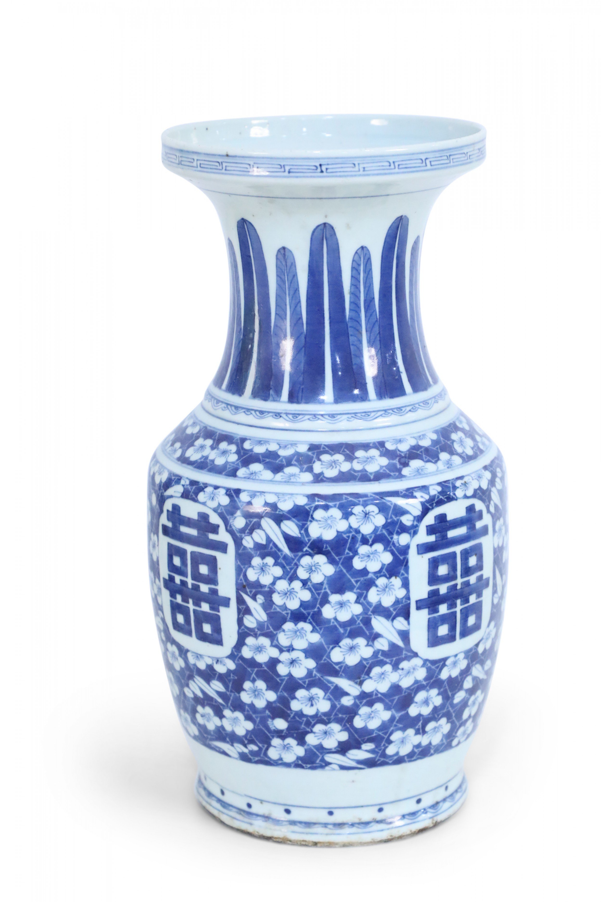 Chinese porcelain urn painted with a blue and white floral background surrounding a center white oval with bold markings, dark blue feathers along the neck, and geometric patterned bands at the top, middle and base..