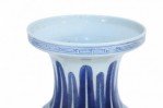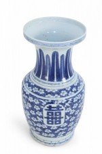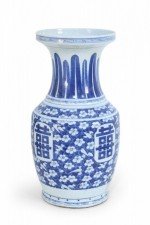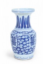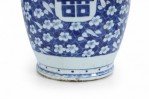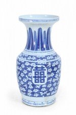Chinese porcelain urn painted with a blue and white floral background surrounding a center white oval with bold markings, dark blue feathers along the neck, and geometric patterned bands at the top, middle and base.
