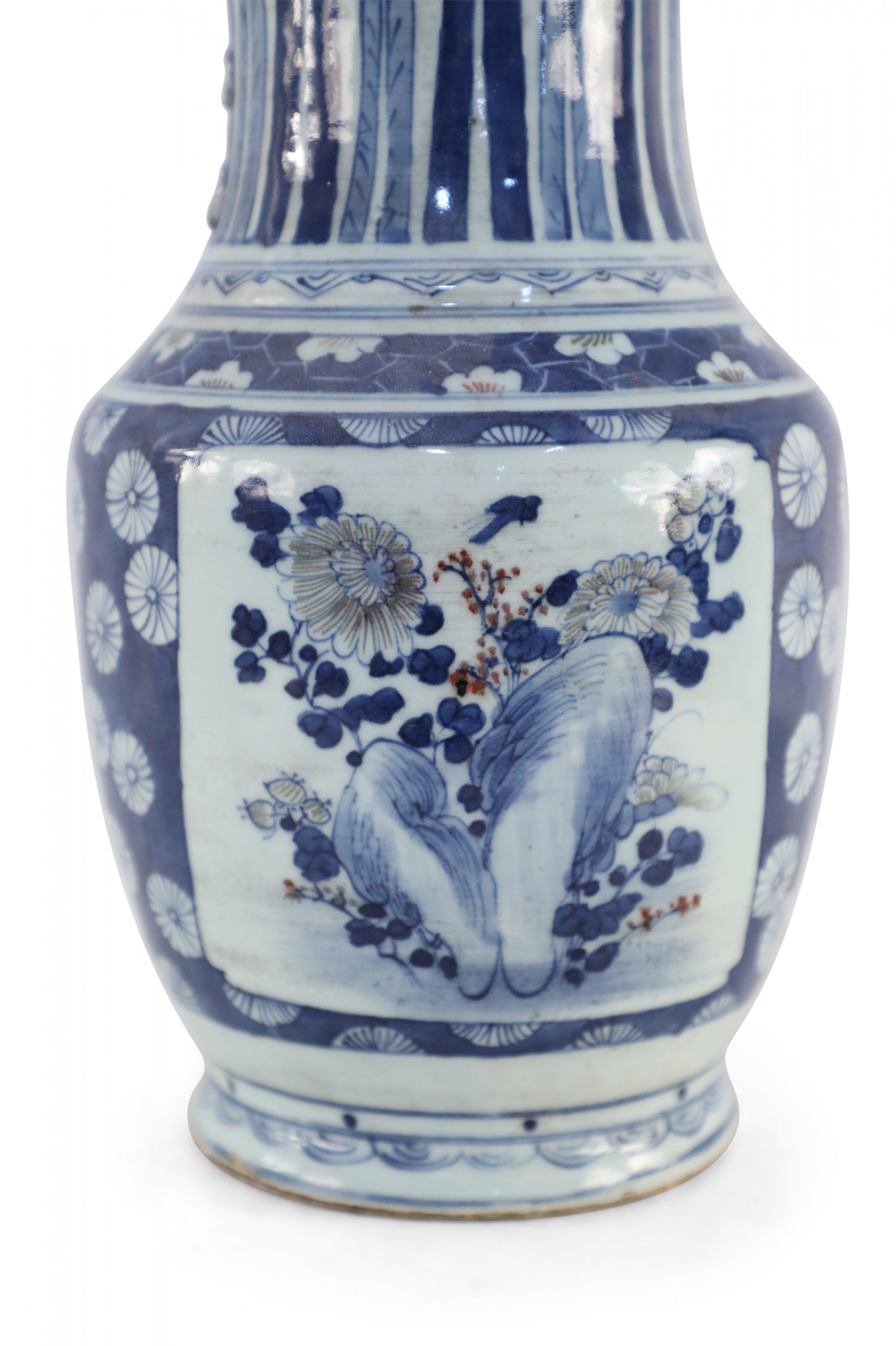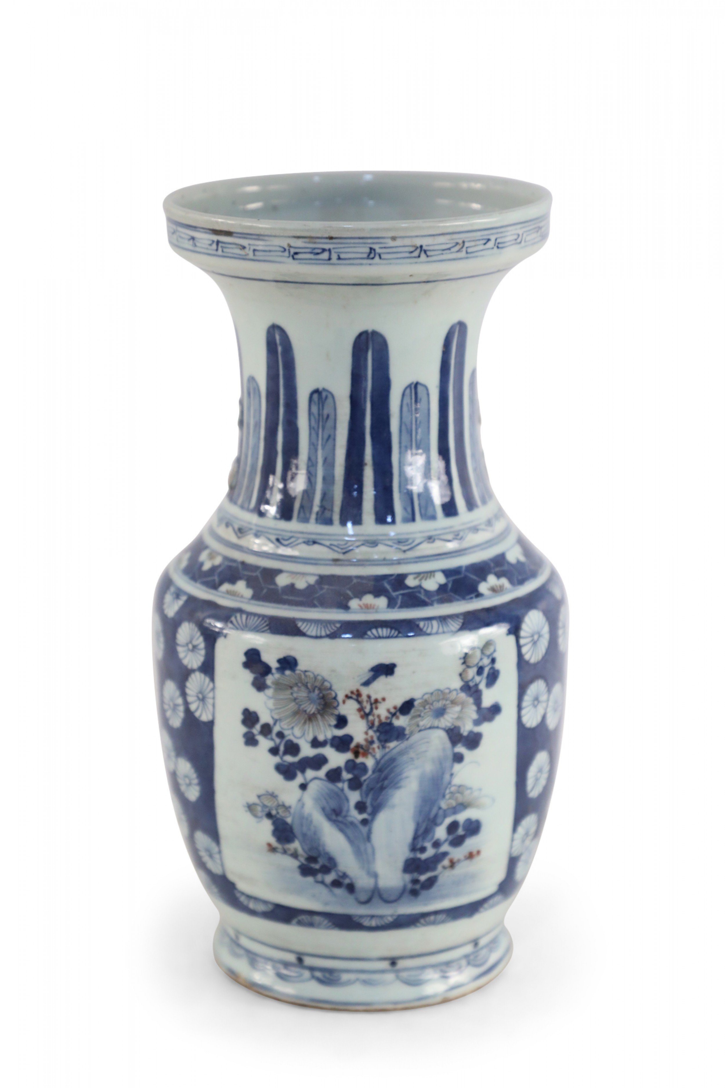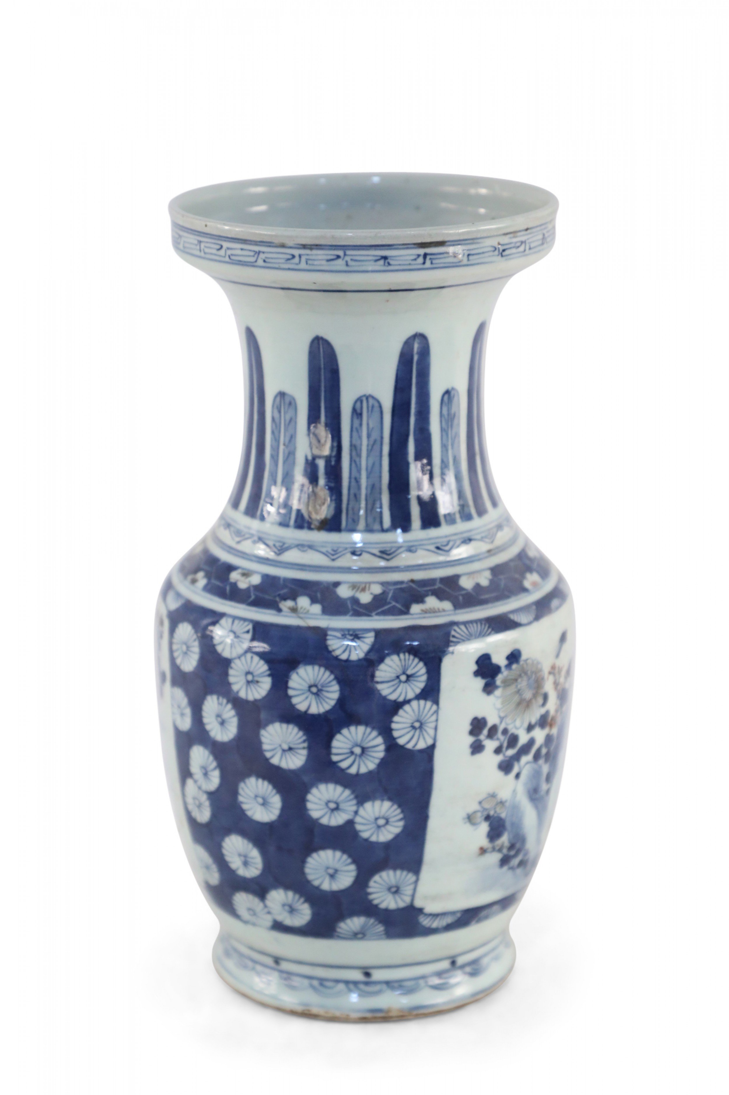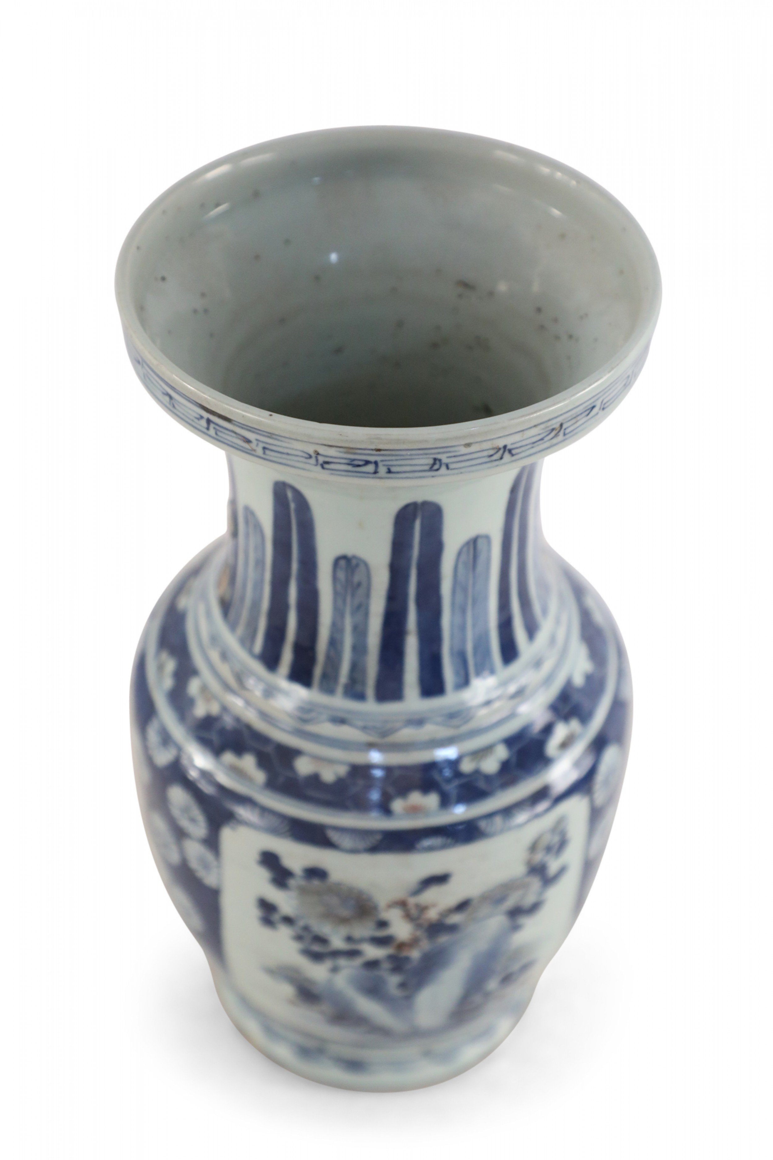 Chinese porcelain urn painted with a blue and white floral background surrounding a center square with a floral arrangement, feathers along the neck in varying shades of blue, and geometric patterned bands at the top, middle and base..