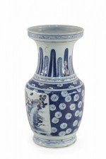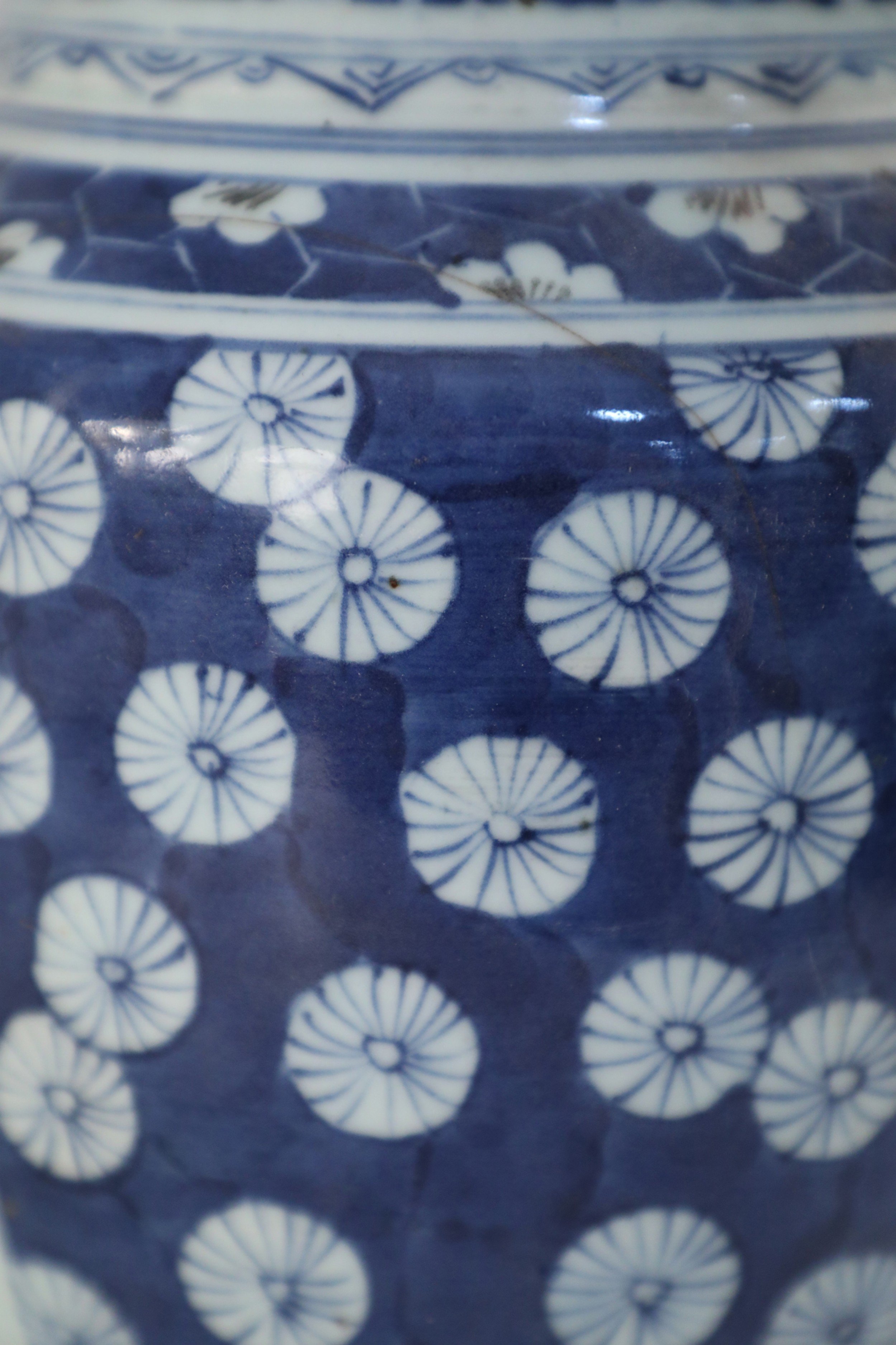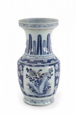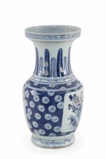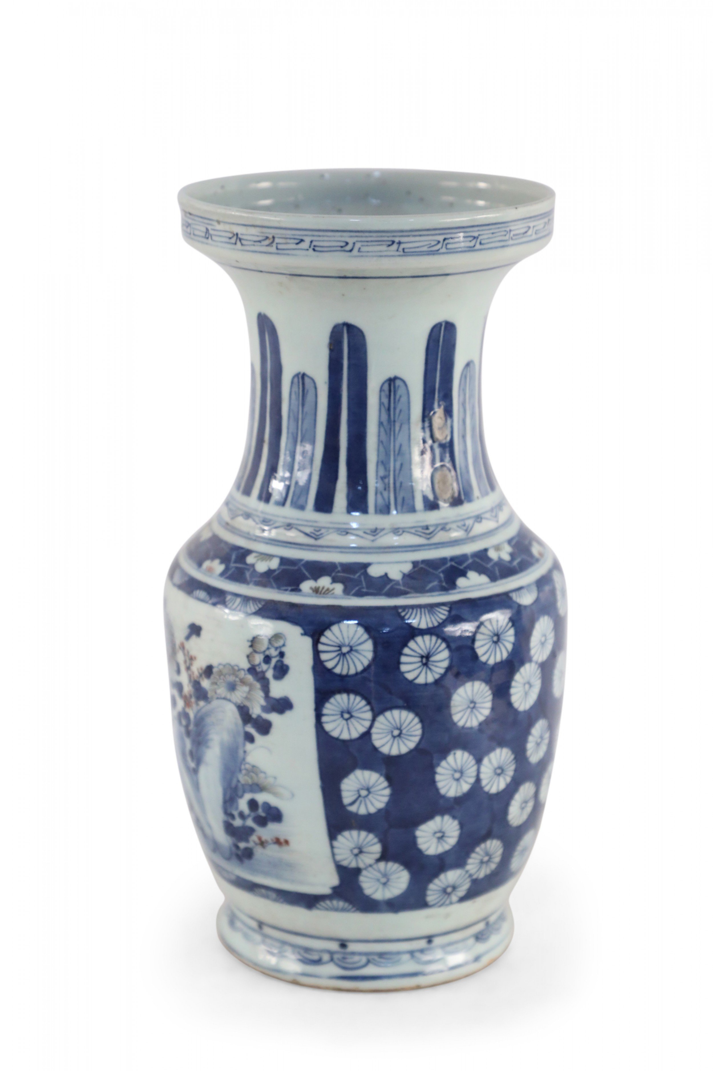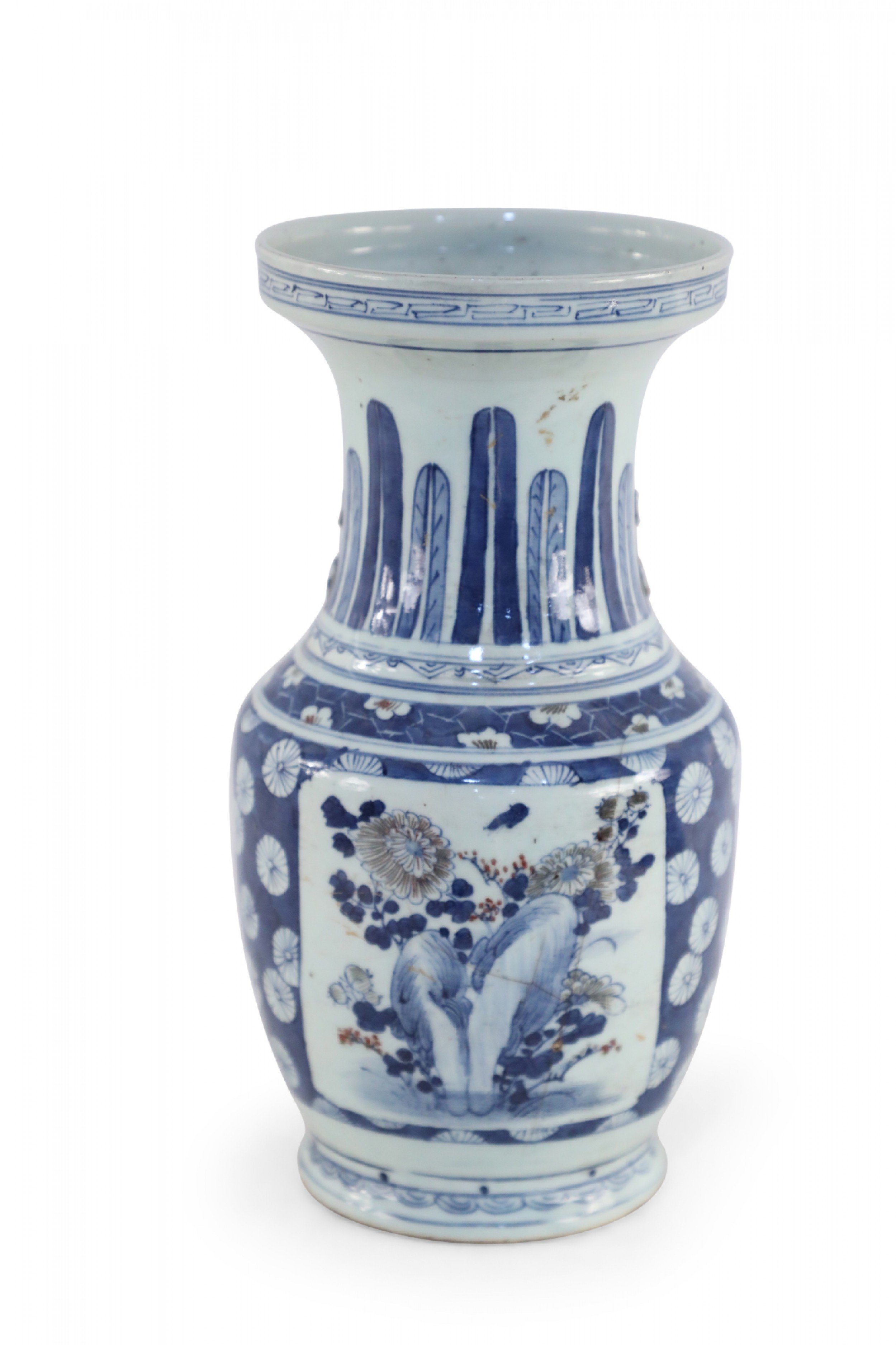 Chinese porcelain urn painted with a blue and white floral background surrounding a center square with a floral arrangement, feathers along the neck in varying shades of blue, and geometric patterned bands at the top, middle and base..