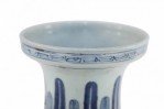 Chinese porcelain urn painted with a blue and white floral background surrounding a center square with a floral arrangement, feathers along the neck in varying shades of blue, and geometric patterned bands at the top, middle and base.