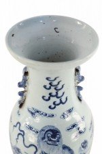 Antique Chinese (Late 19th Century) white porcelain urn decorated with blue foo dogs, clouds, and serpents, and accented in two pale blue scrolled handles along the neck..