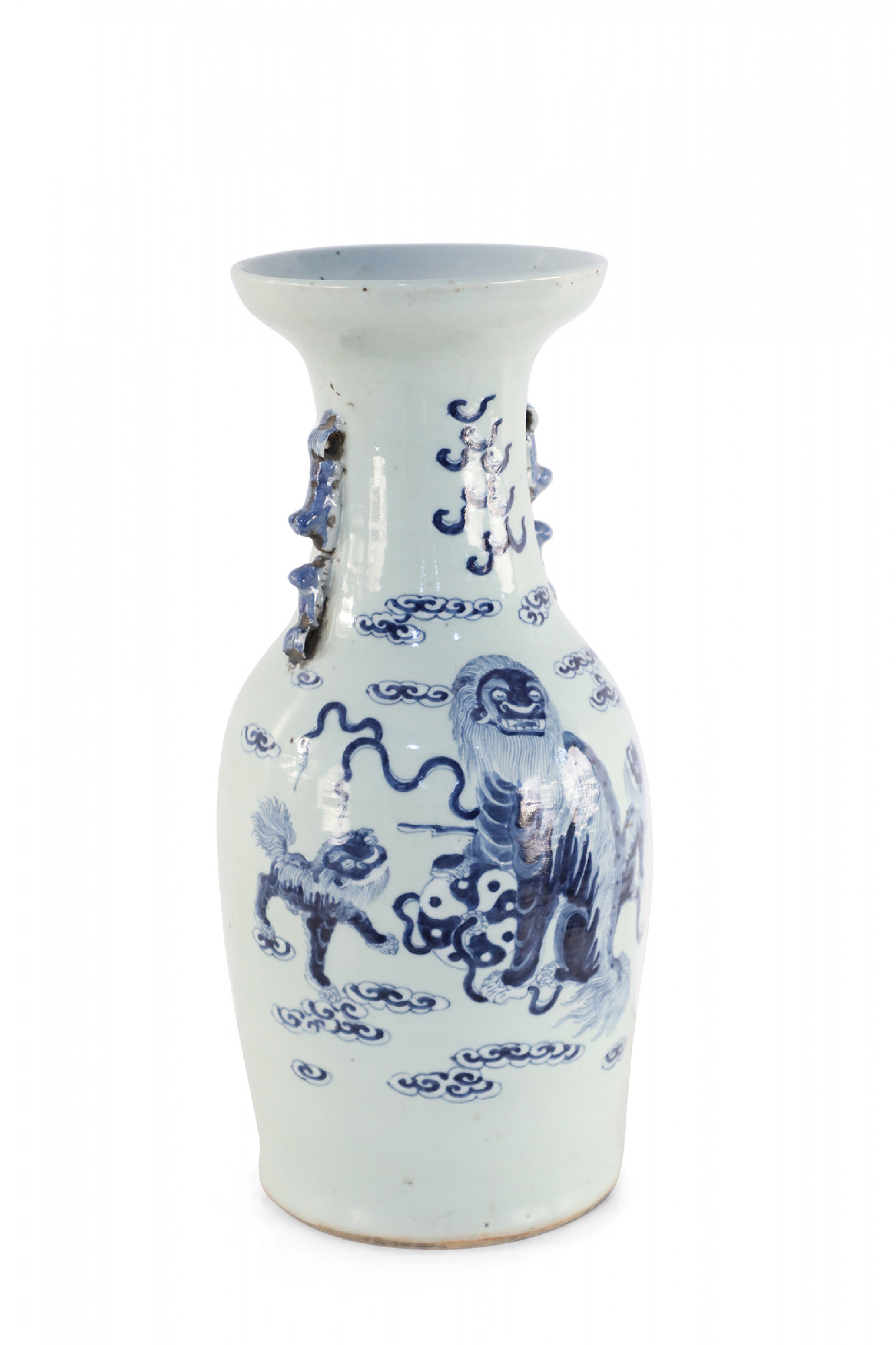 Antique Chinese (Late 19th Century) white porcelain urn decorated with blue foo dogs, clouds, and serpents, and accented in two pale blue scrolled handles along the neck.