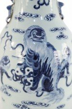 Chinese White and Blue Foo Dog and Serpent Design Porcelain Urn