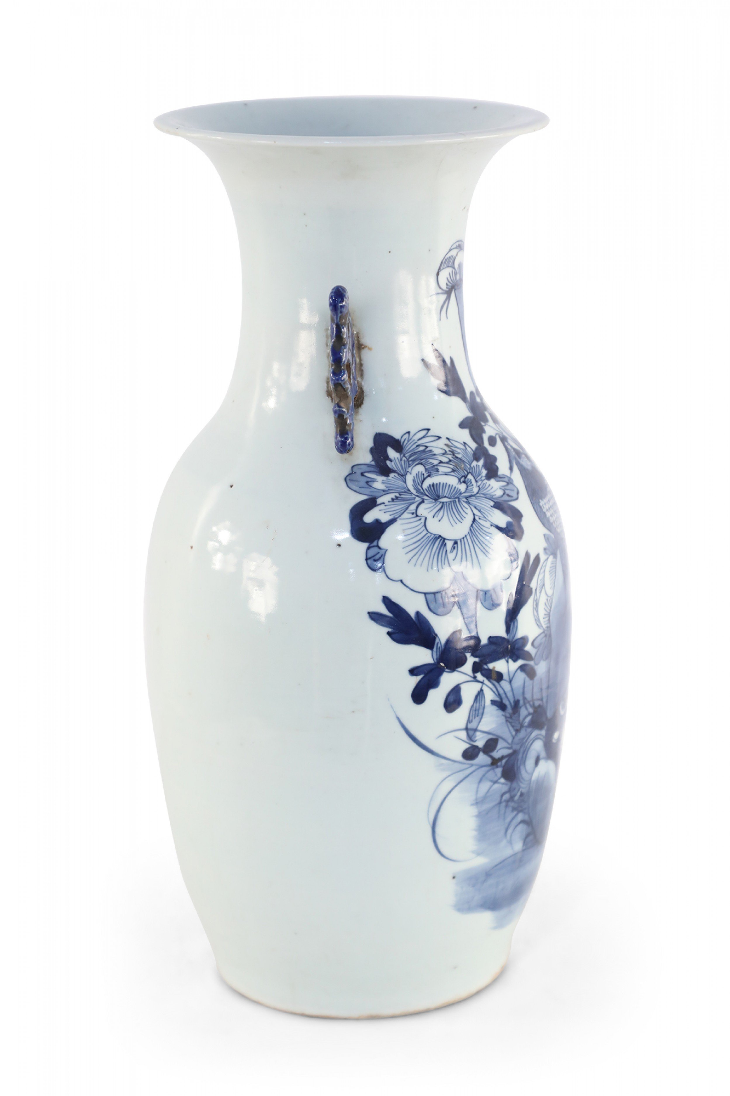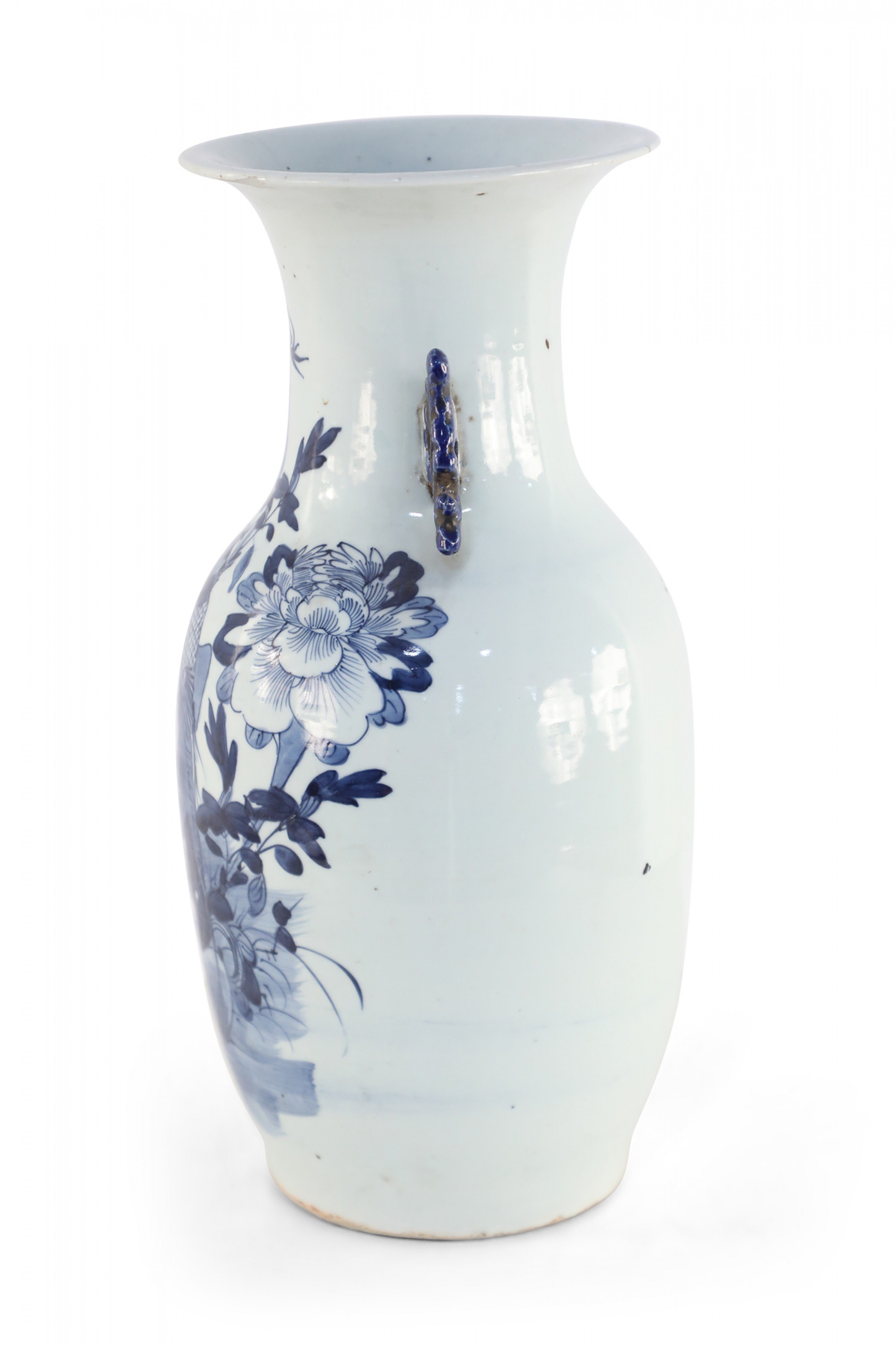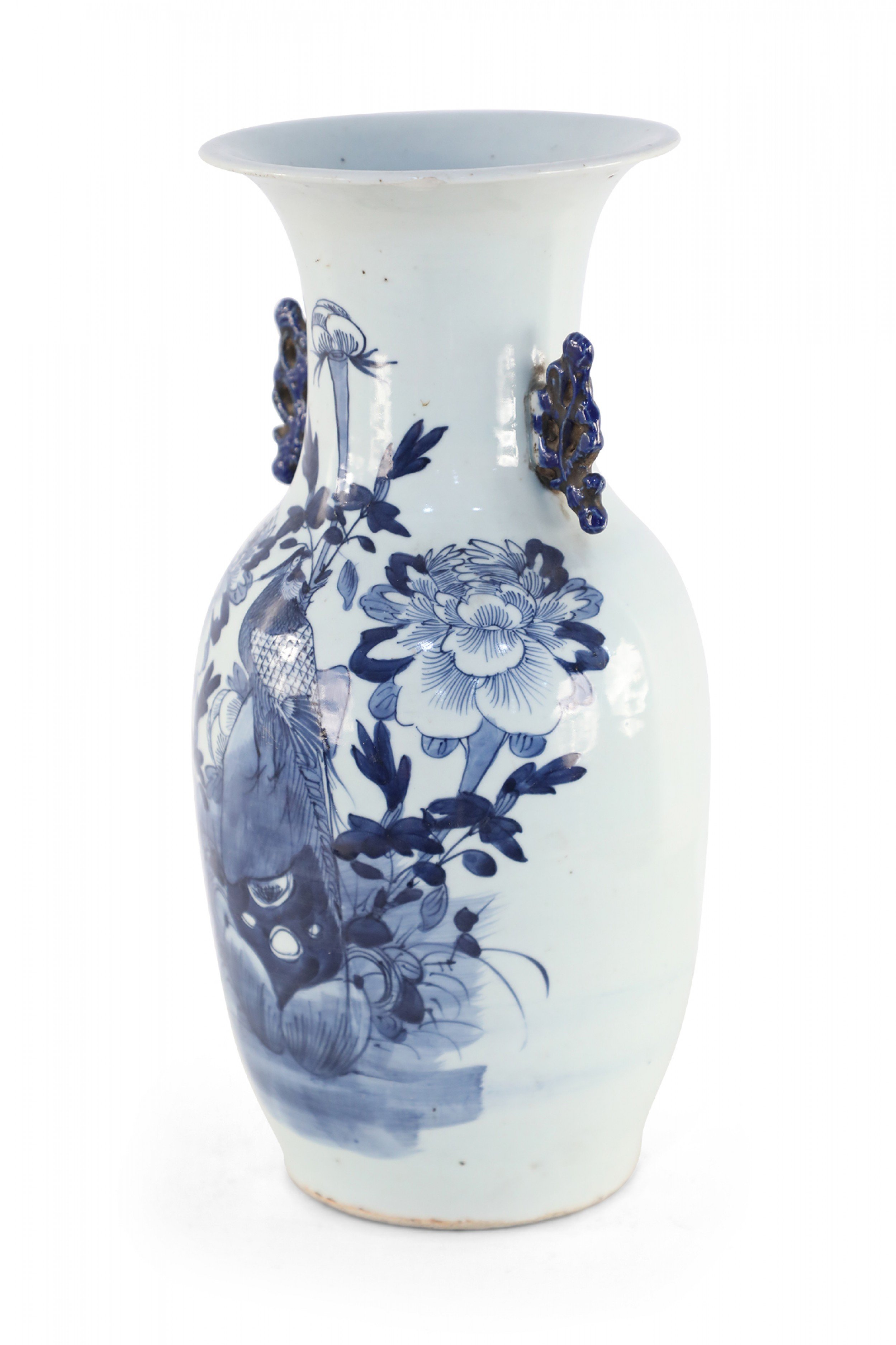 Antique Chinese (Late 19th Century) white and blue porcelain urn decorated with a bird amid a flowering garden, and accented in two navy scrolled handles along the neck..