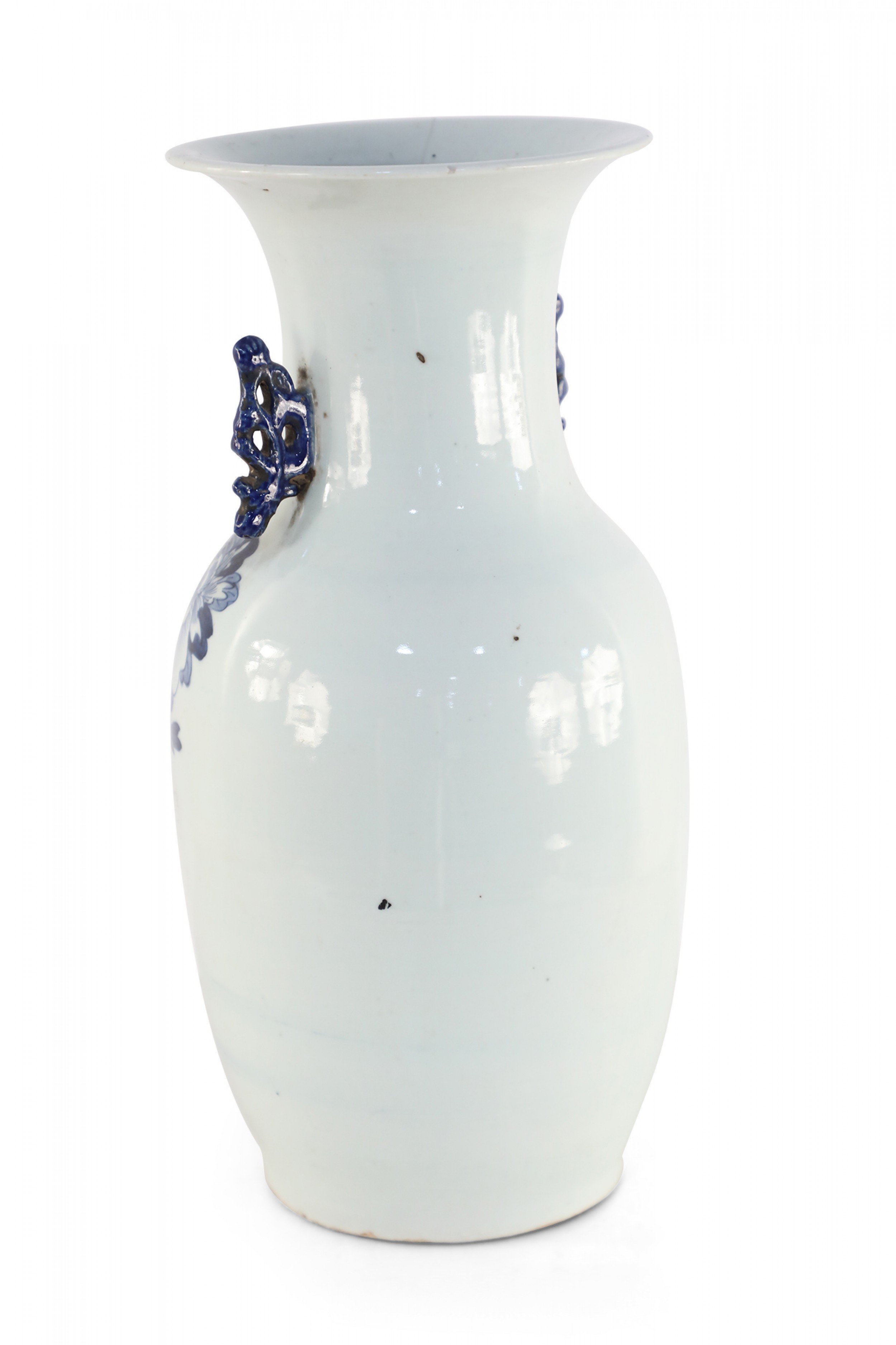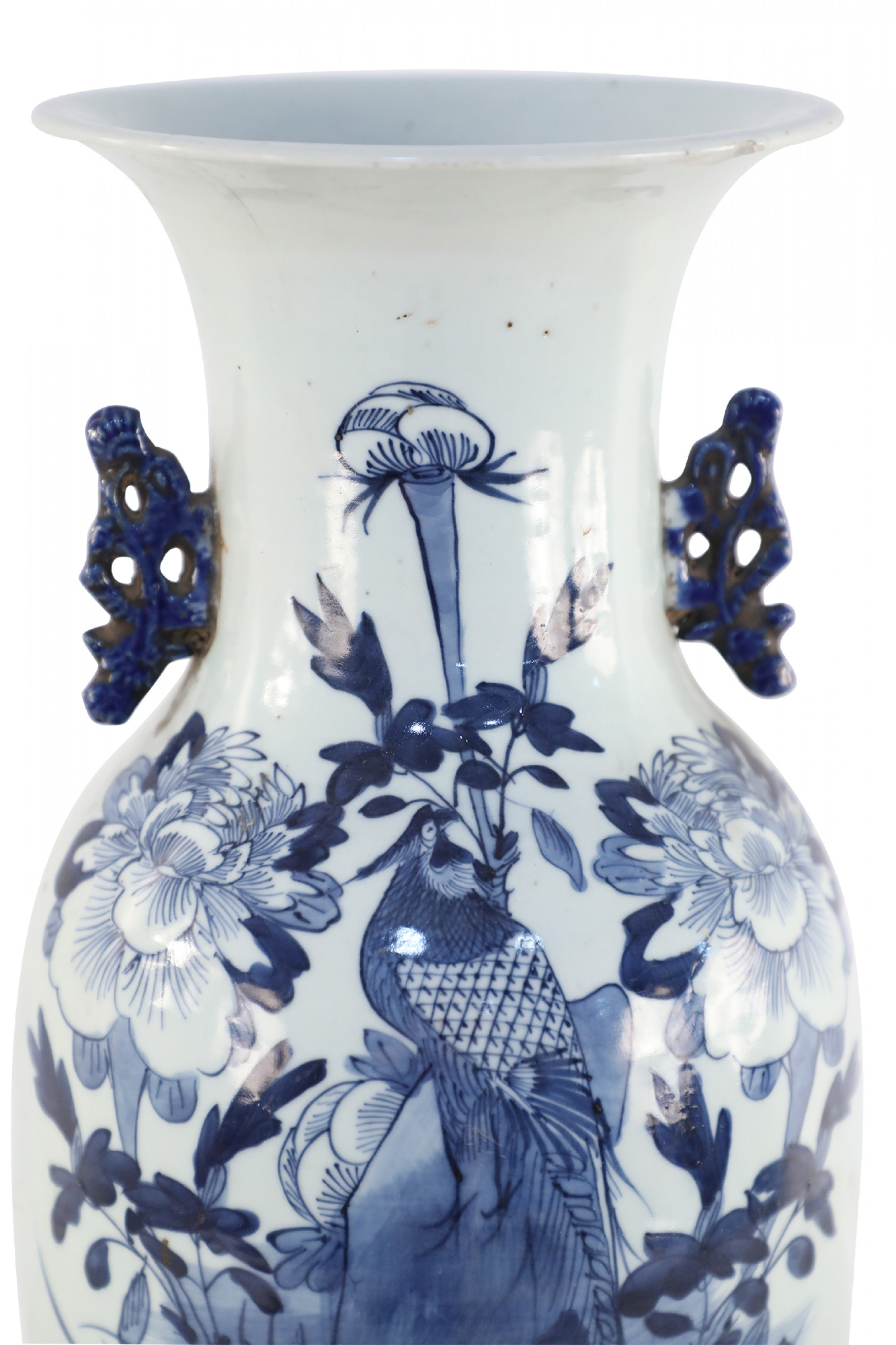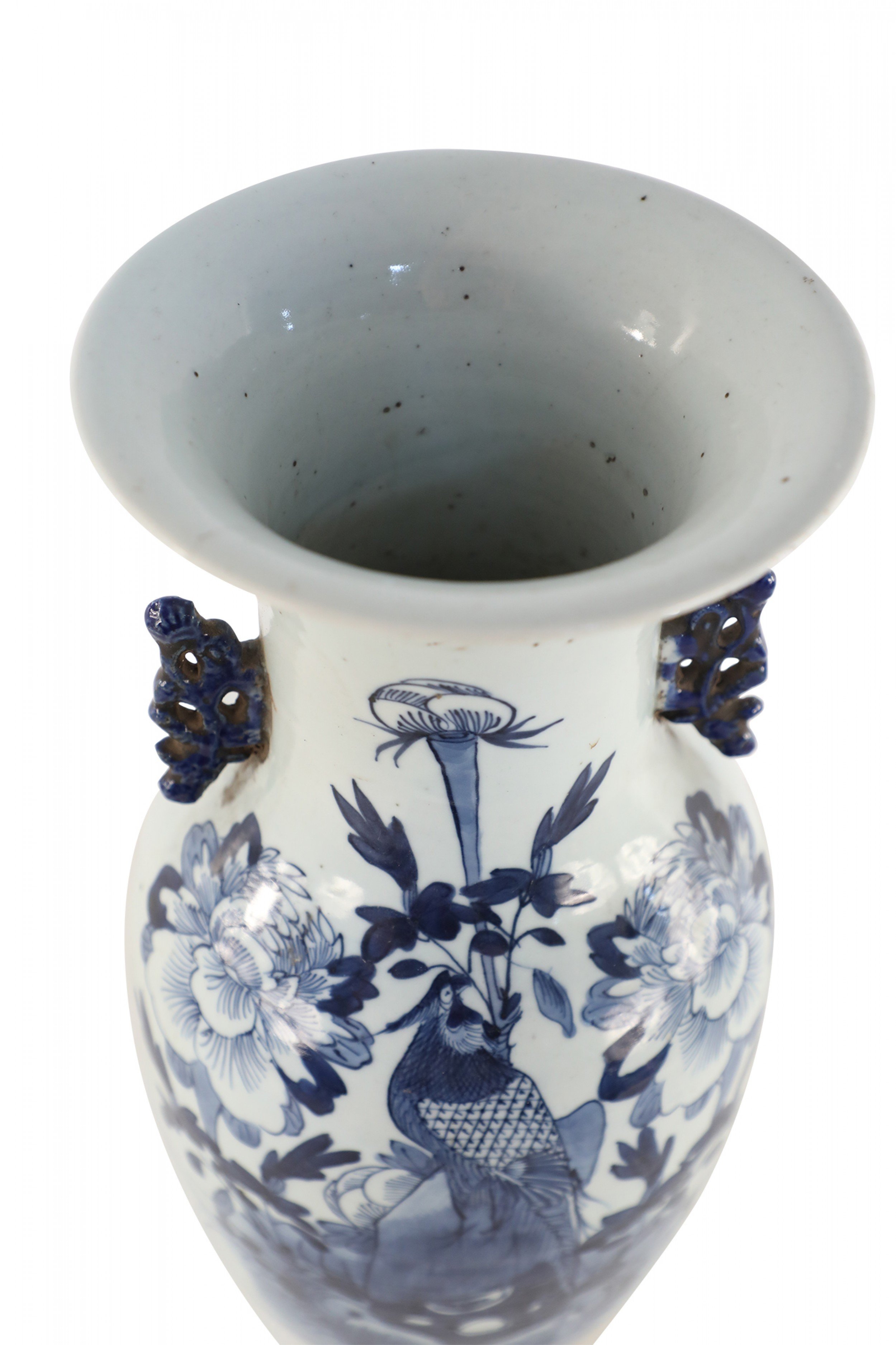 Antique Chinese (Late 19th Century) white and blue porcelain urn decorated with a bird amid a flowering garden, and accented in two navy scrolled handles along the neck..