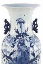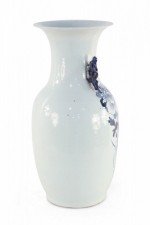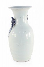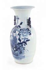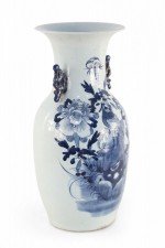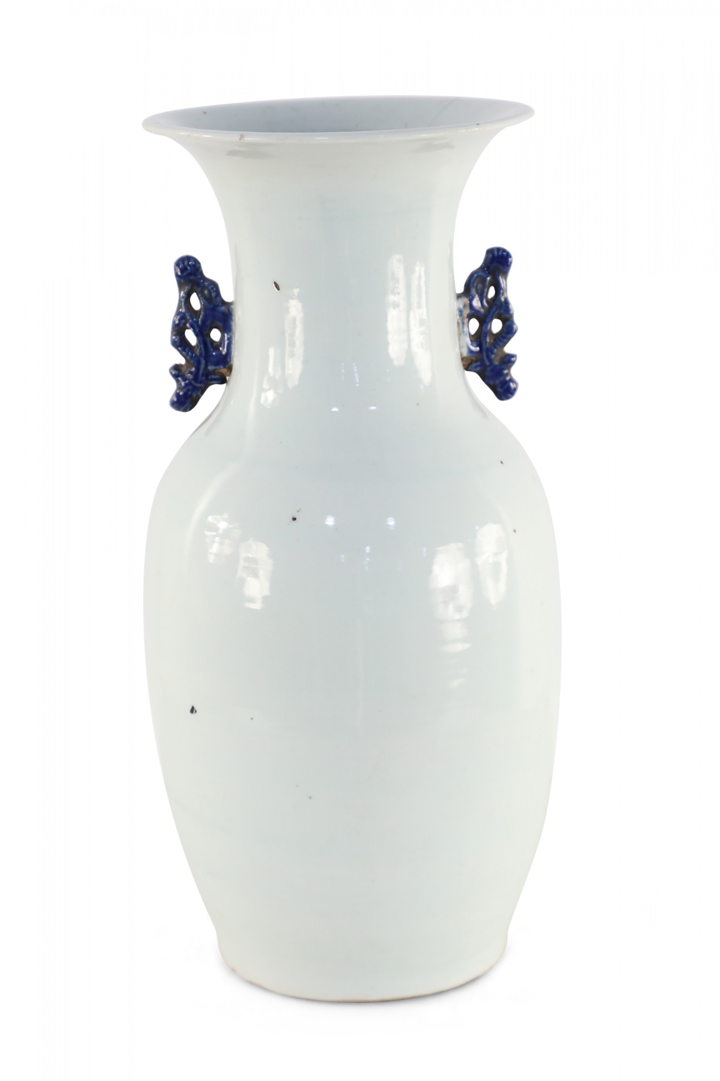 Antique Chinese (Late 19th Century) white and blue porcelain urn decorated with a bird amid a flowering garden, and accented in two navy scrolled handles along the neck.