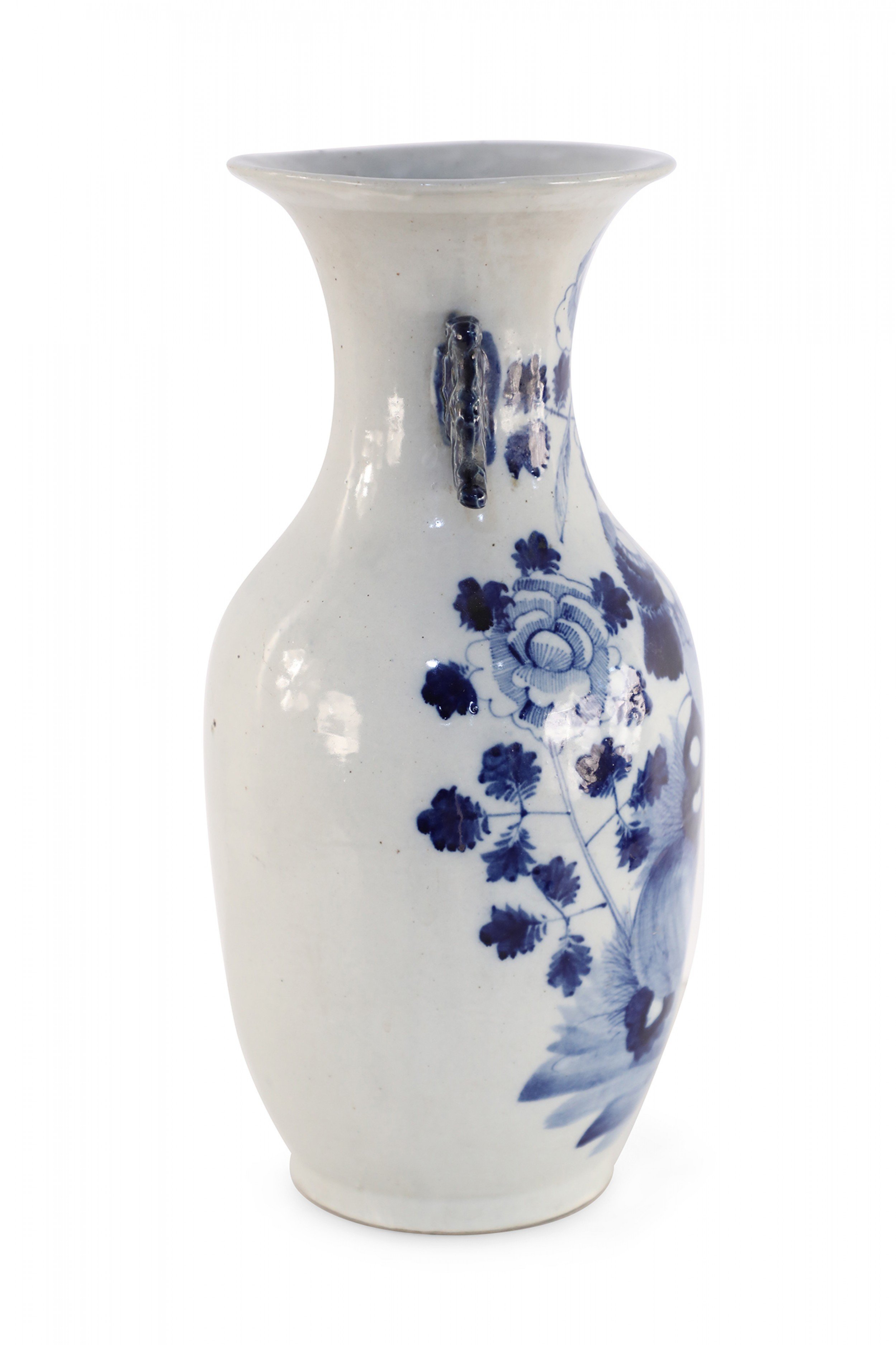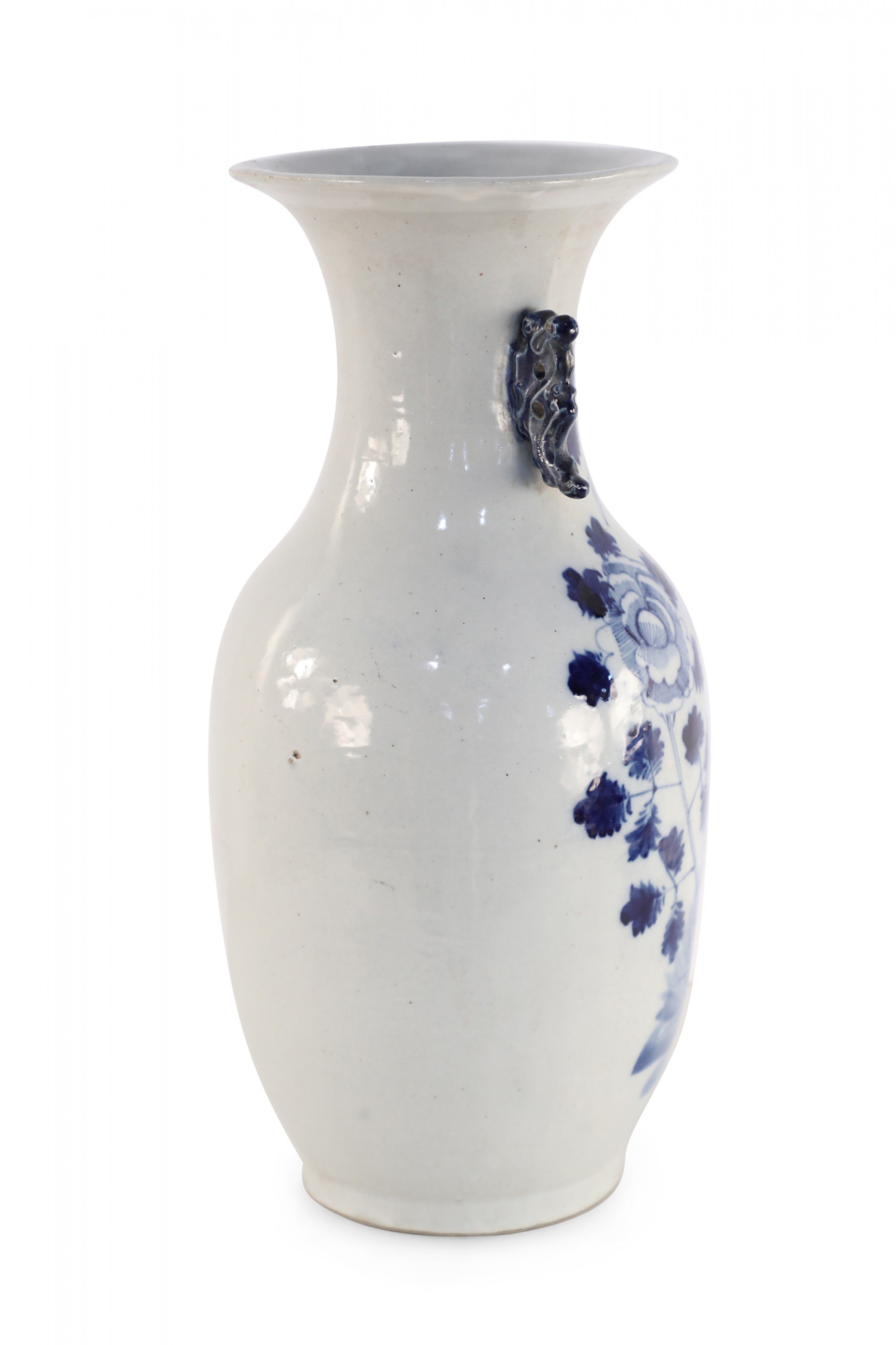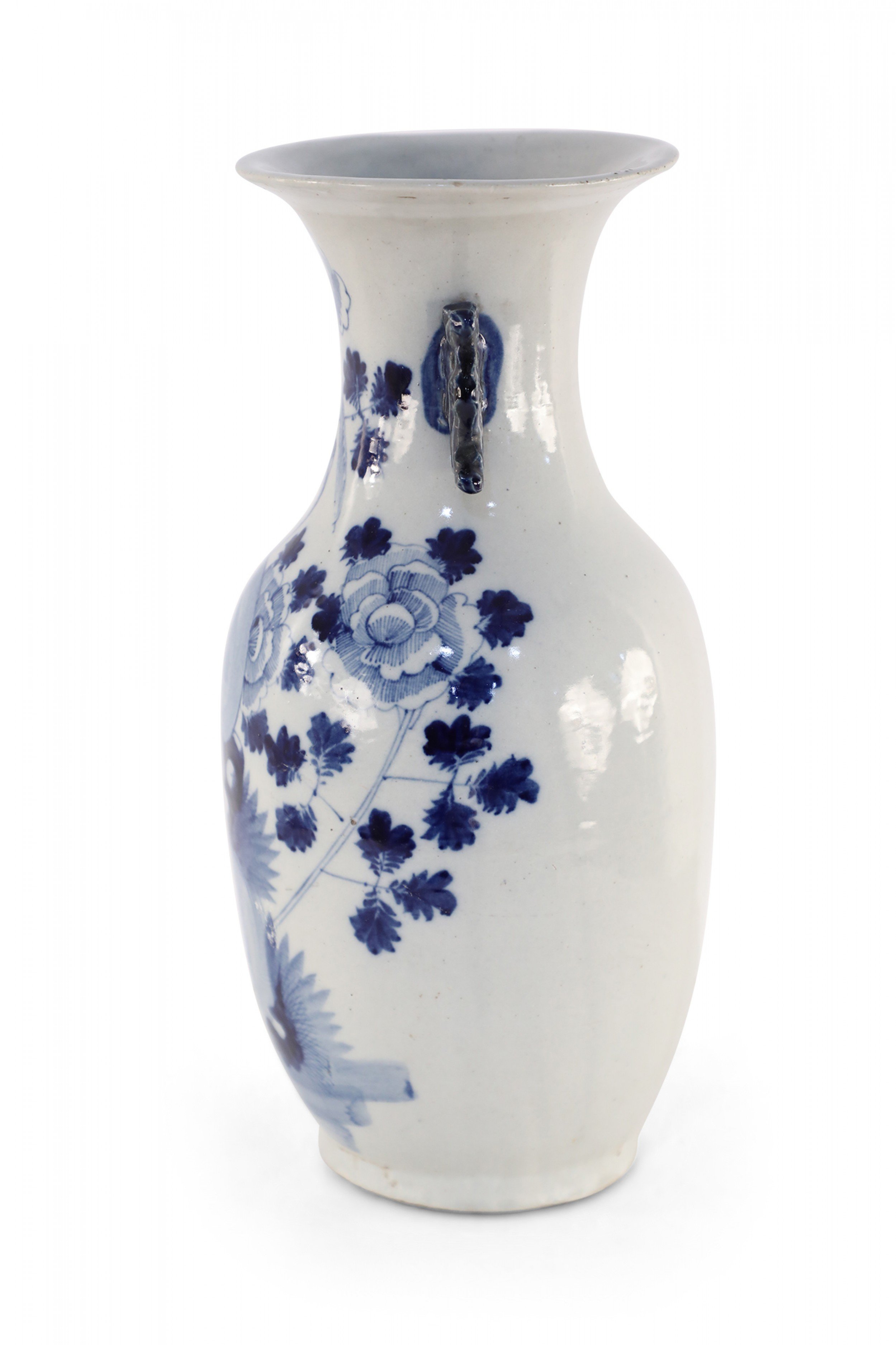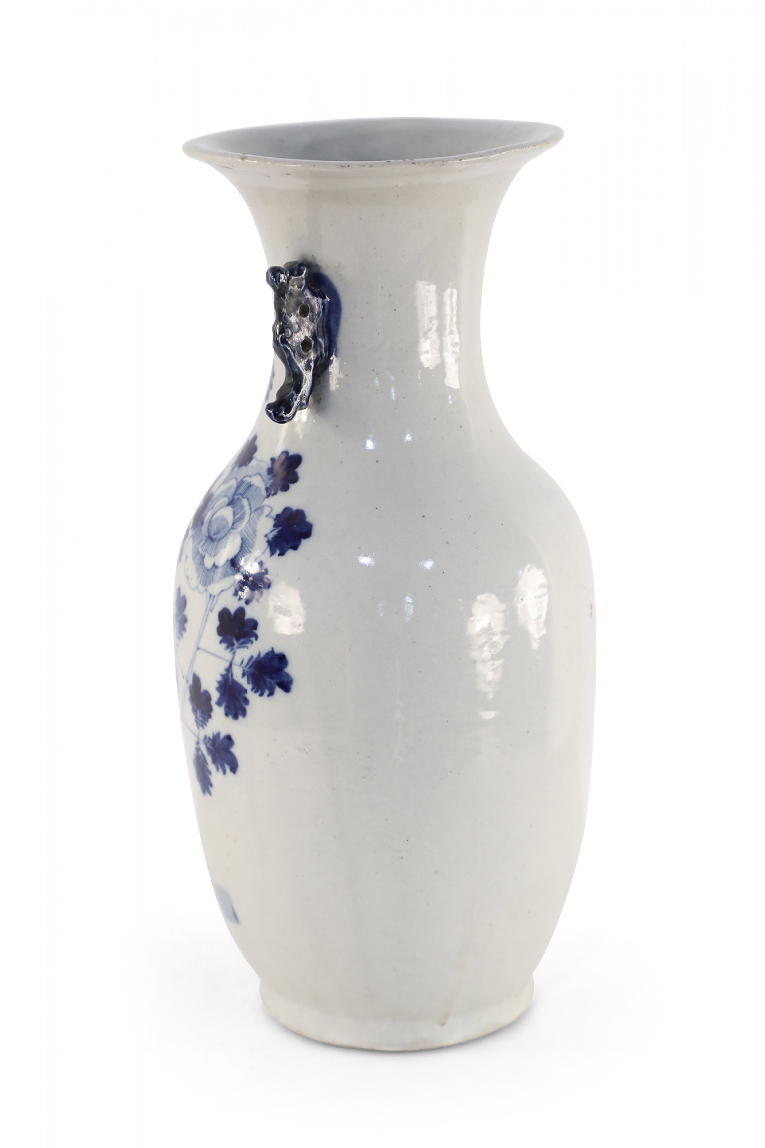 Antique Chinese (Late 19th Century) white and blue porcelain urn decorated with a lily pad and floral motif, and accented in two navy scrolled handles along the neck.