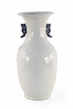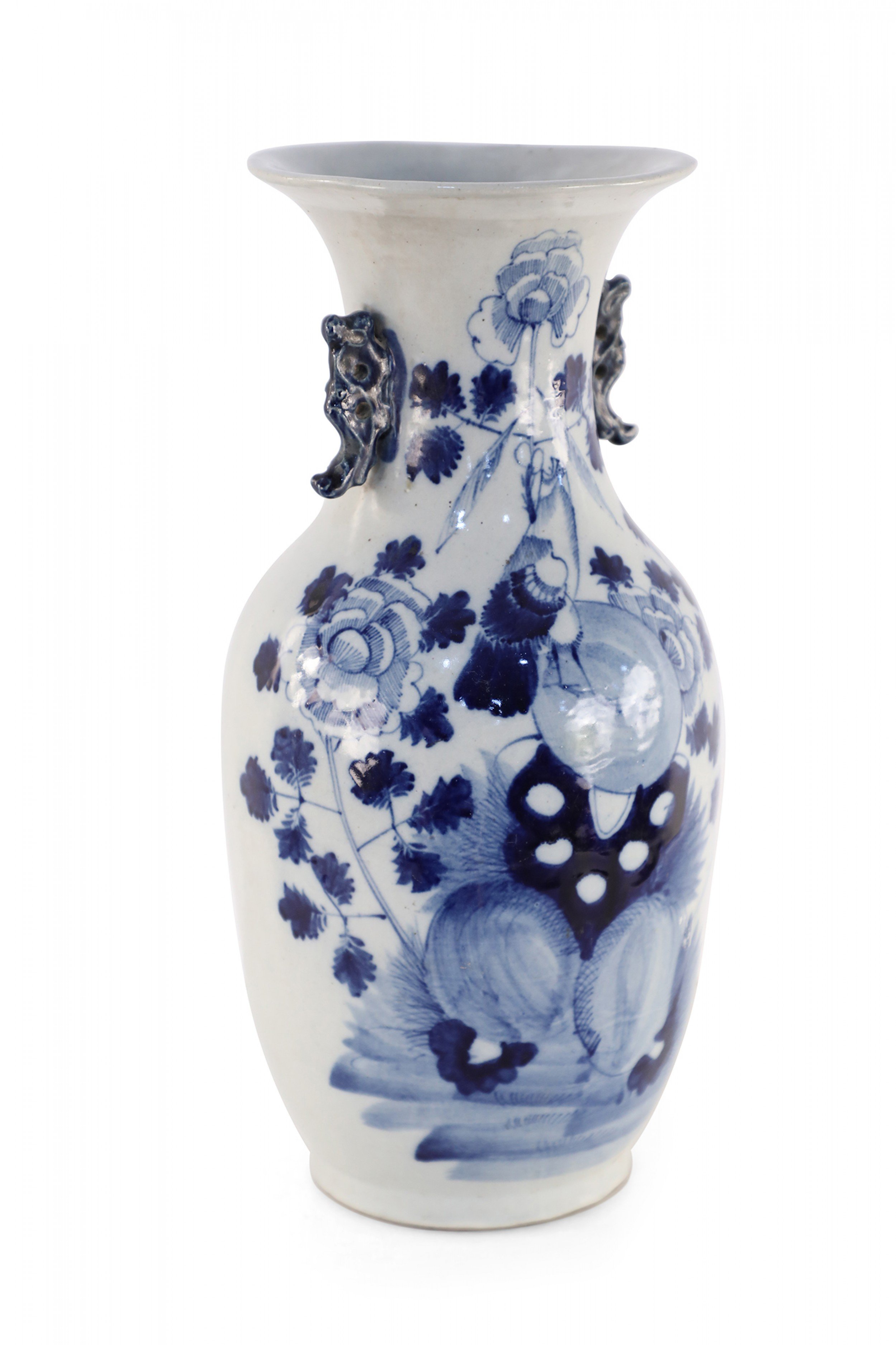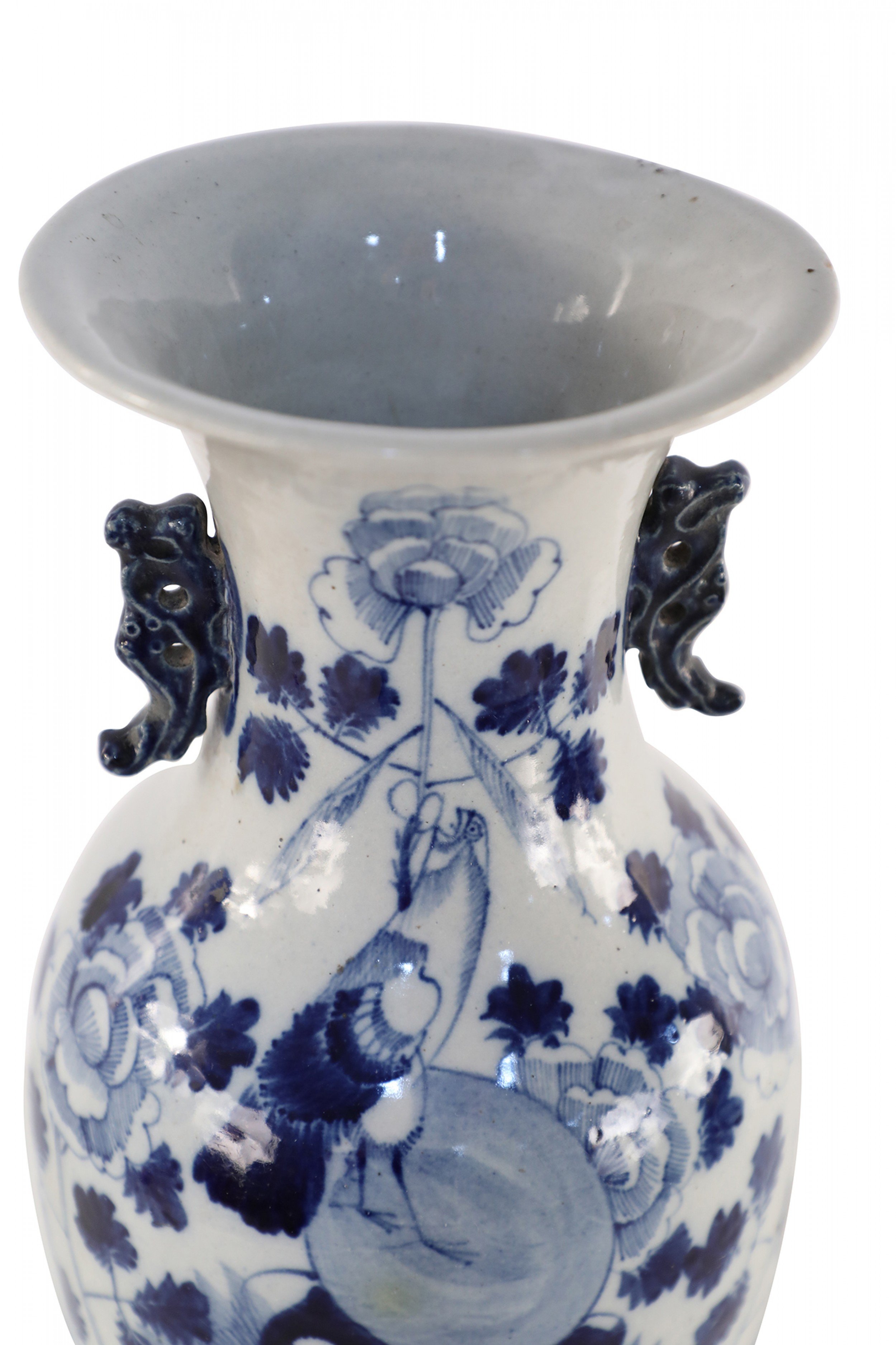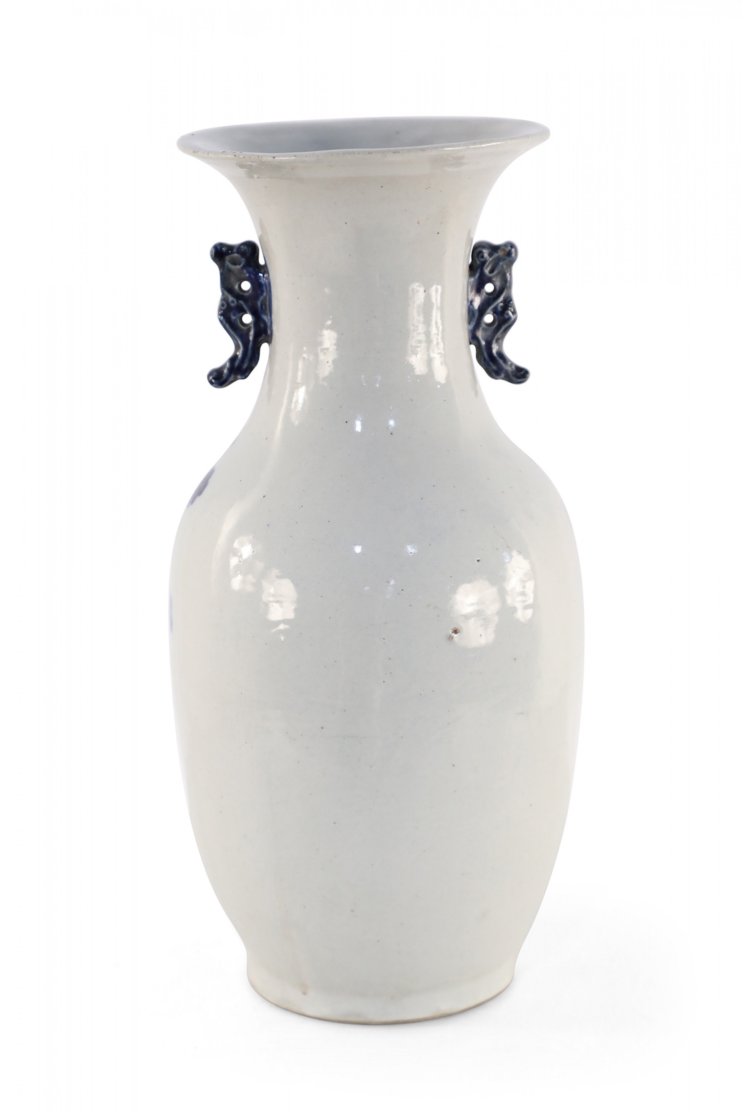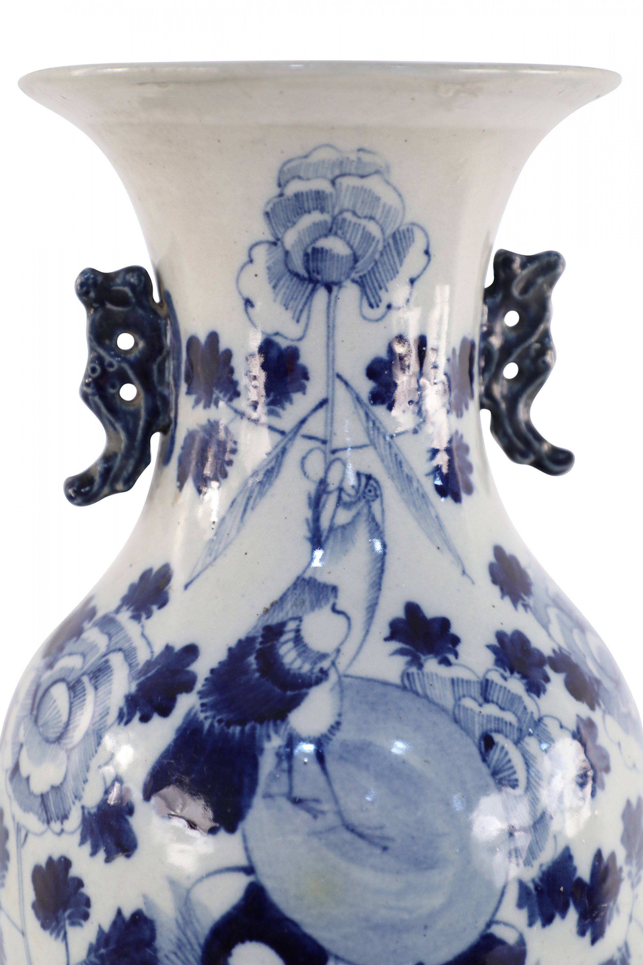 Antique Chinese (Late 19th Century) white and blue porcelain urn decorated with a lily pad and floral motif, and accented in two navy scrolled handles along the neck.