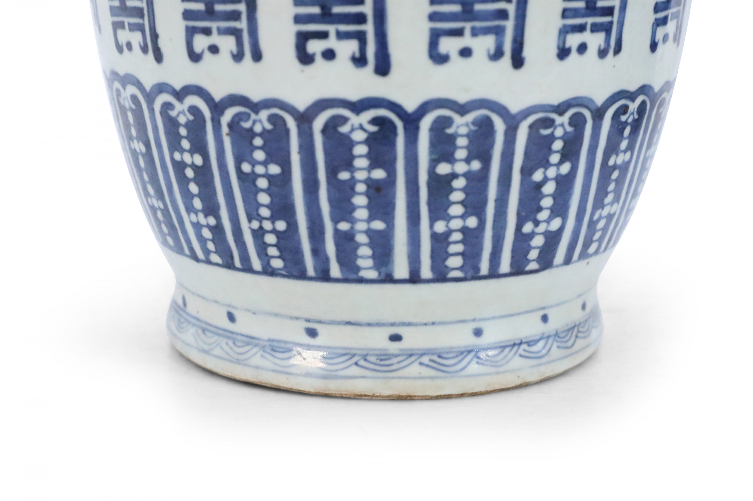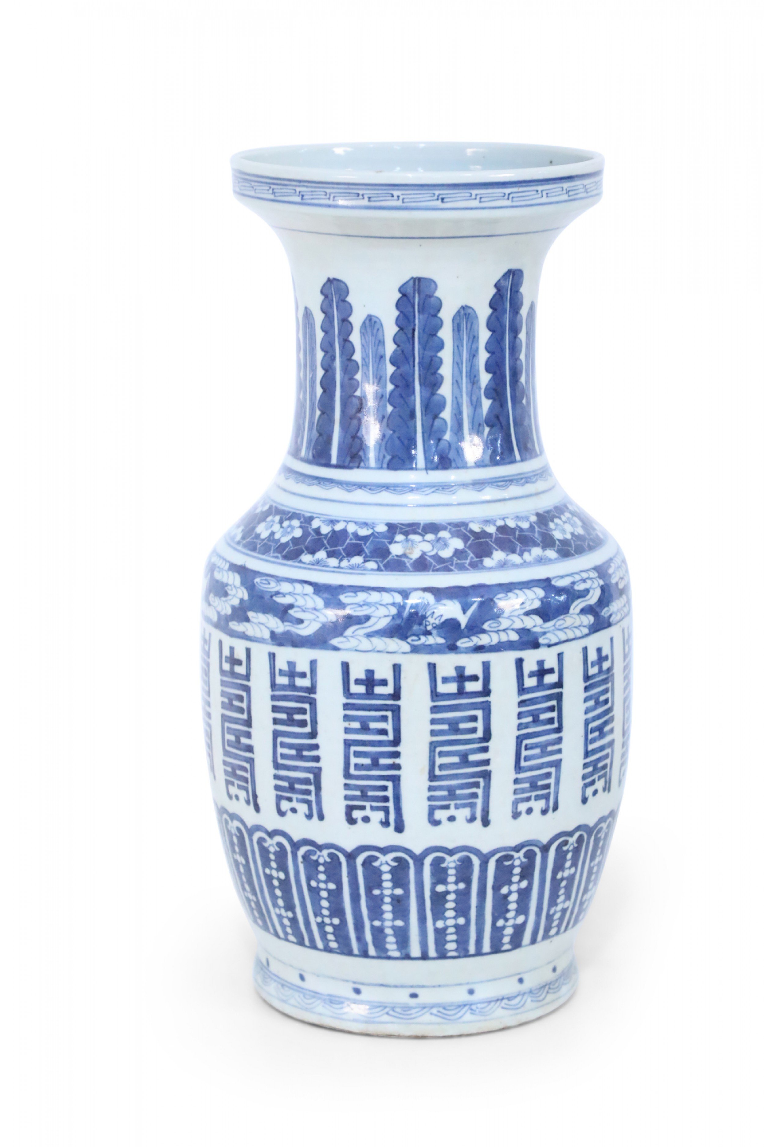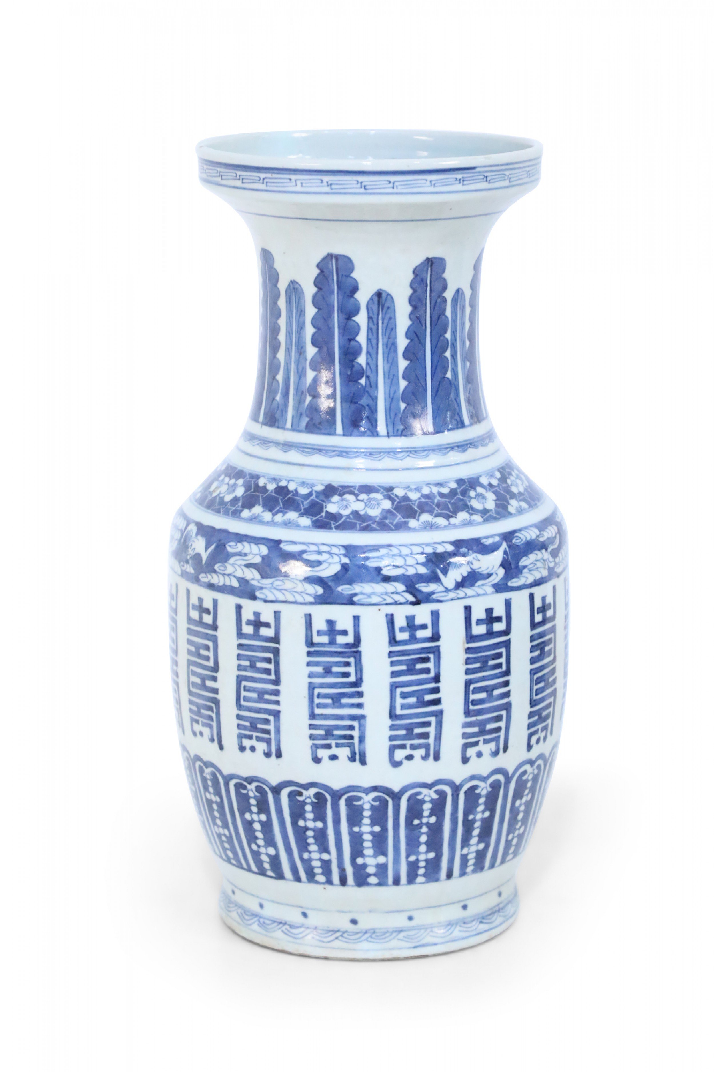 Chinese white porcelain urn painted with a variety of blue, decorative patterns, including feathers and bold vertical markings, that are proportionally balanced to create a harmonious design..
