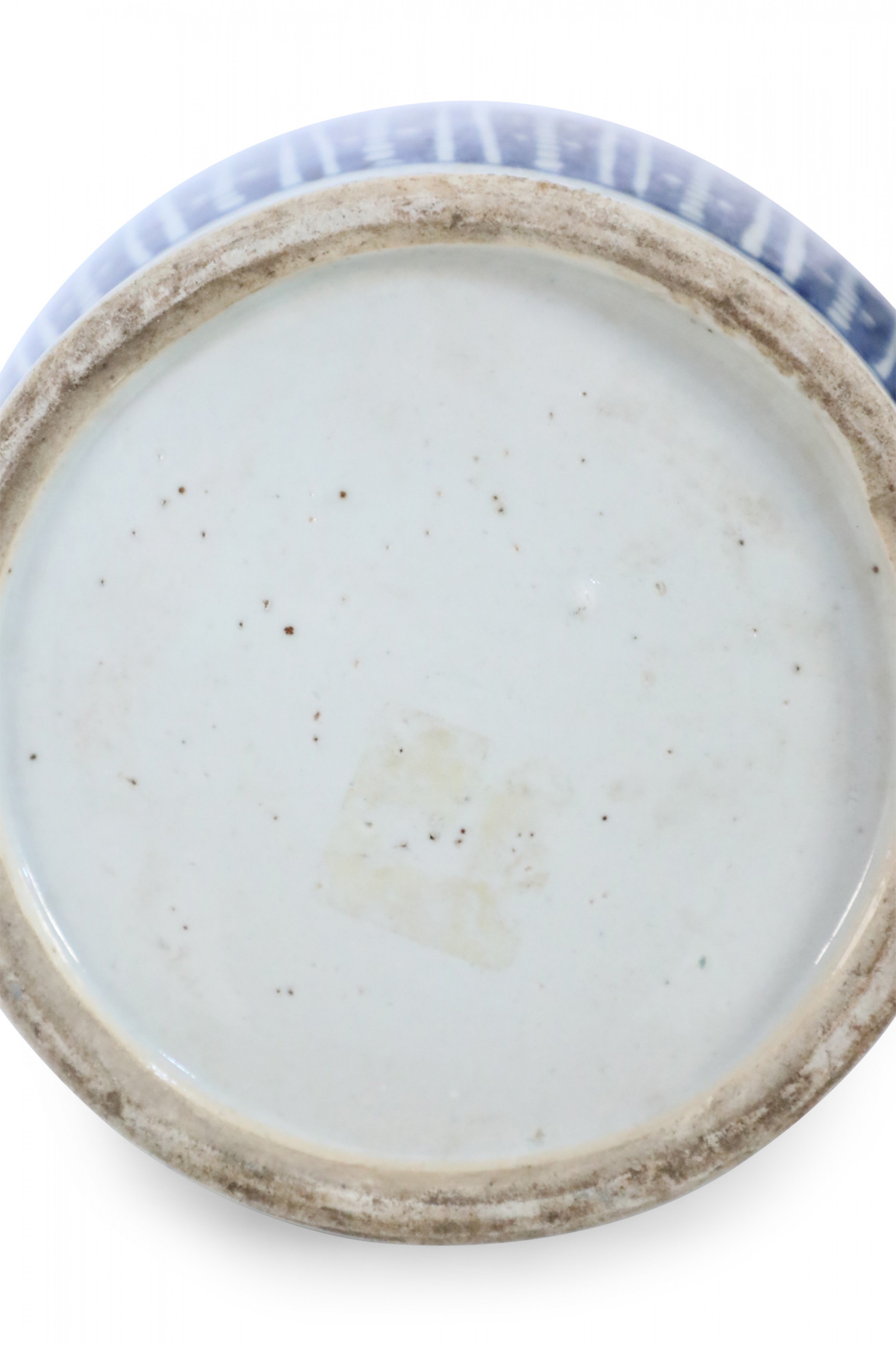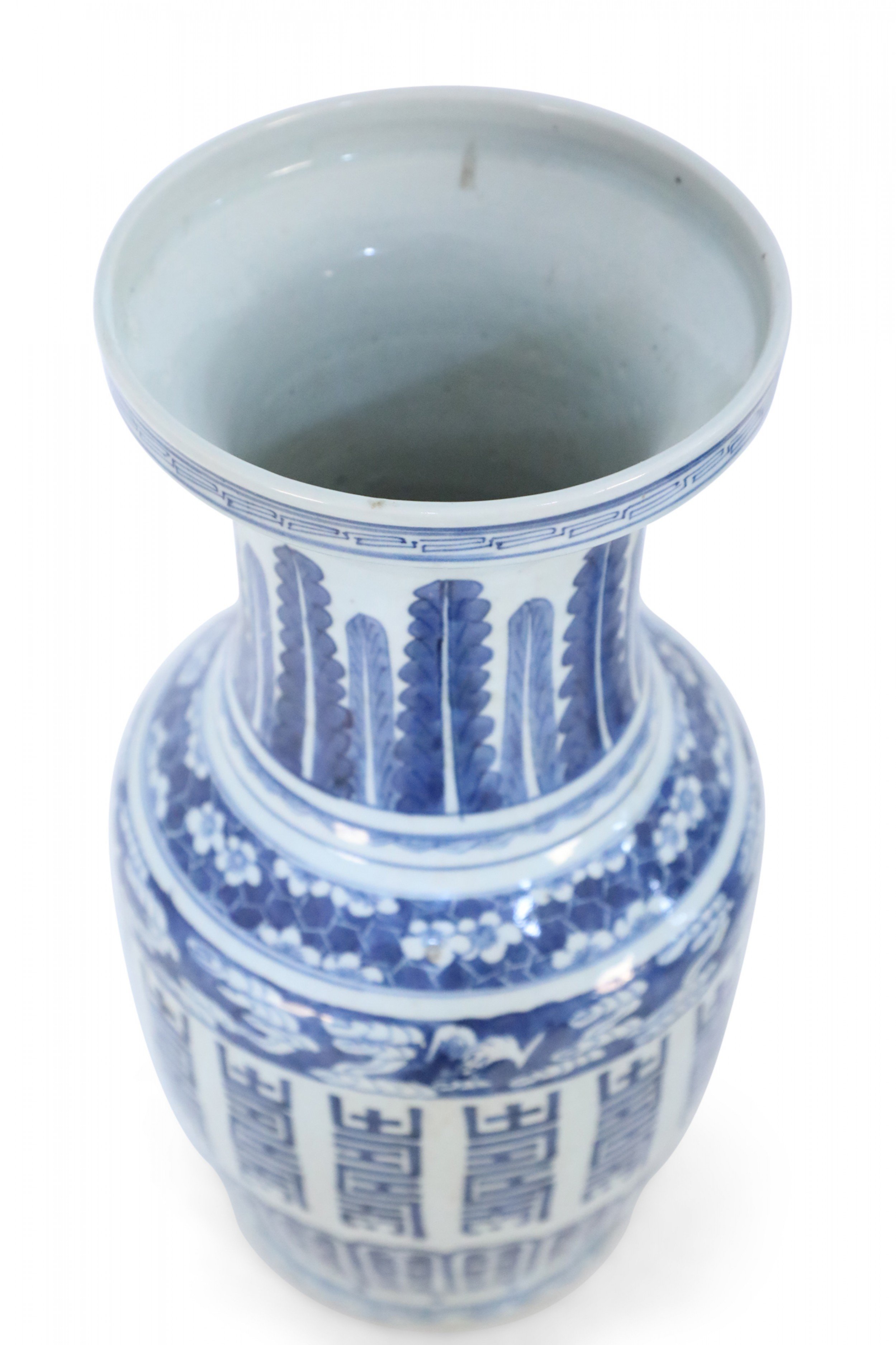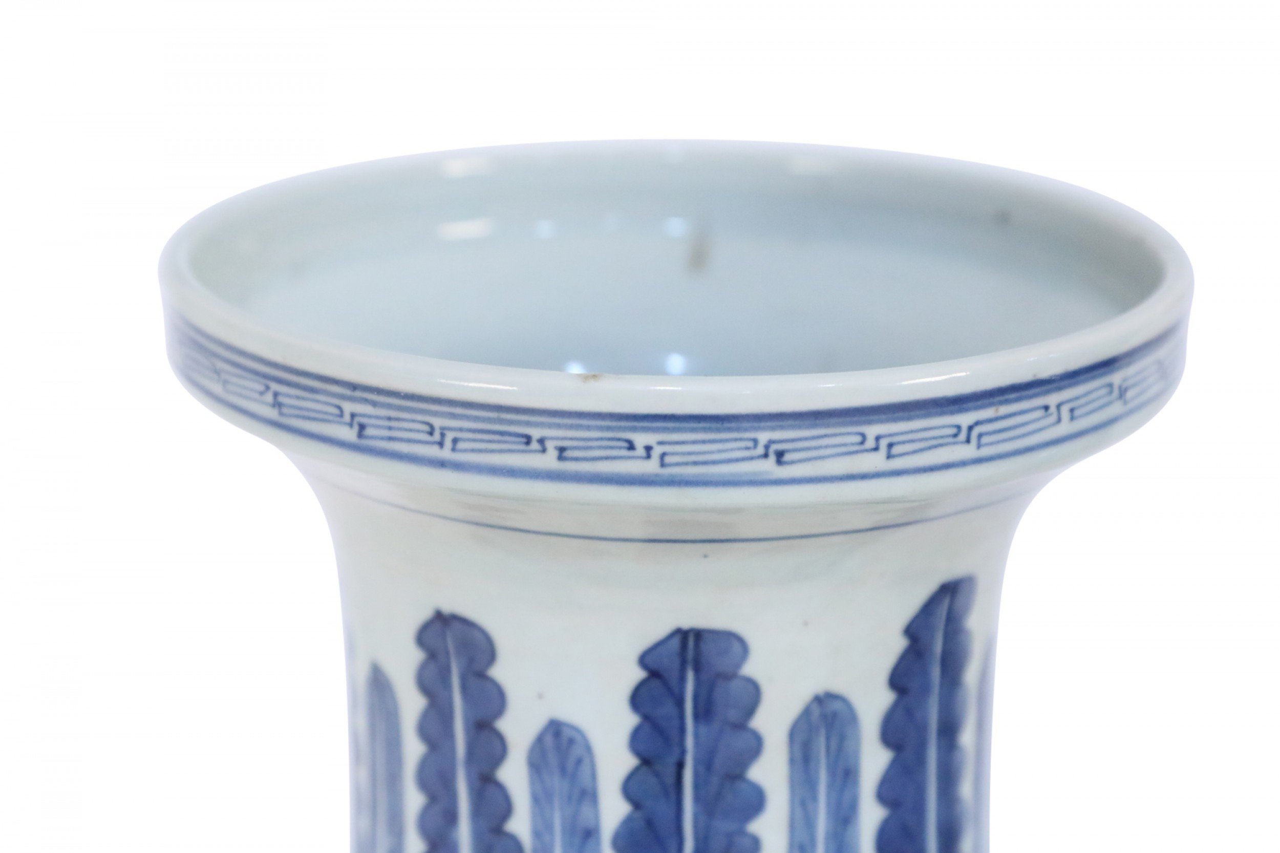 Chinese white porcelain urn painted with a variety of blue, decorative patterns, including feathers and bold vertical markings, that are proportionally balanced to create a harmonious design..