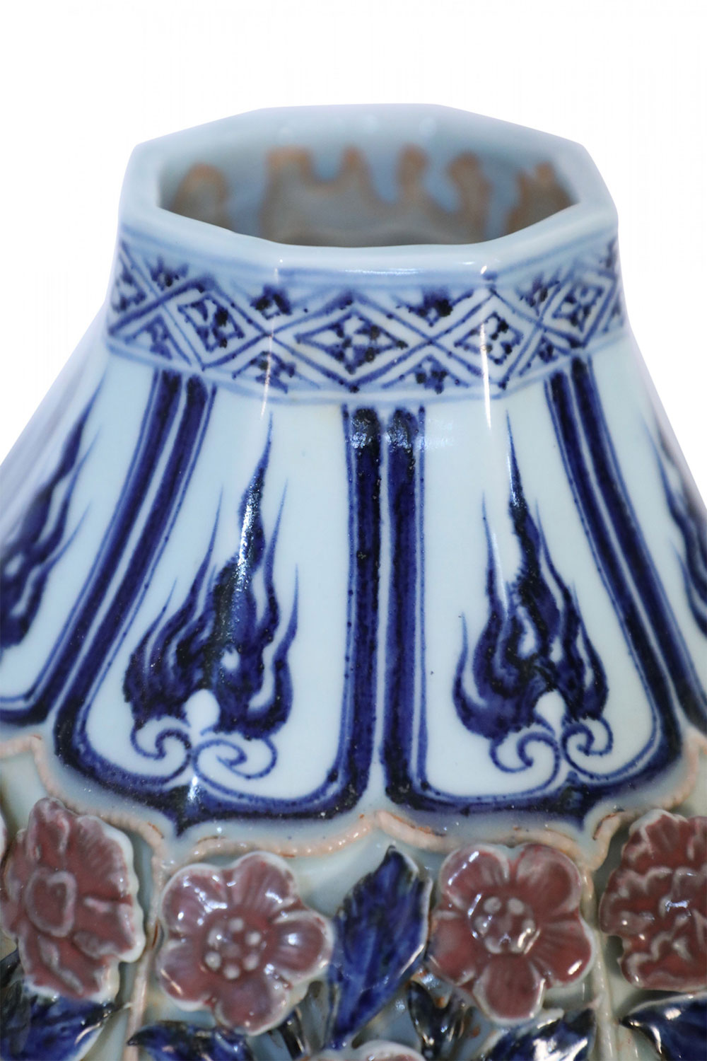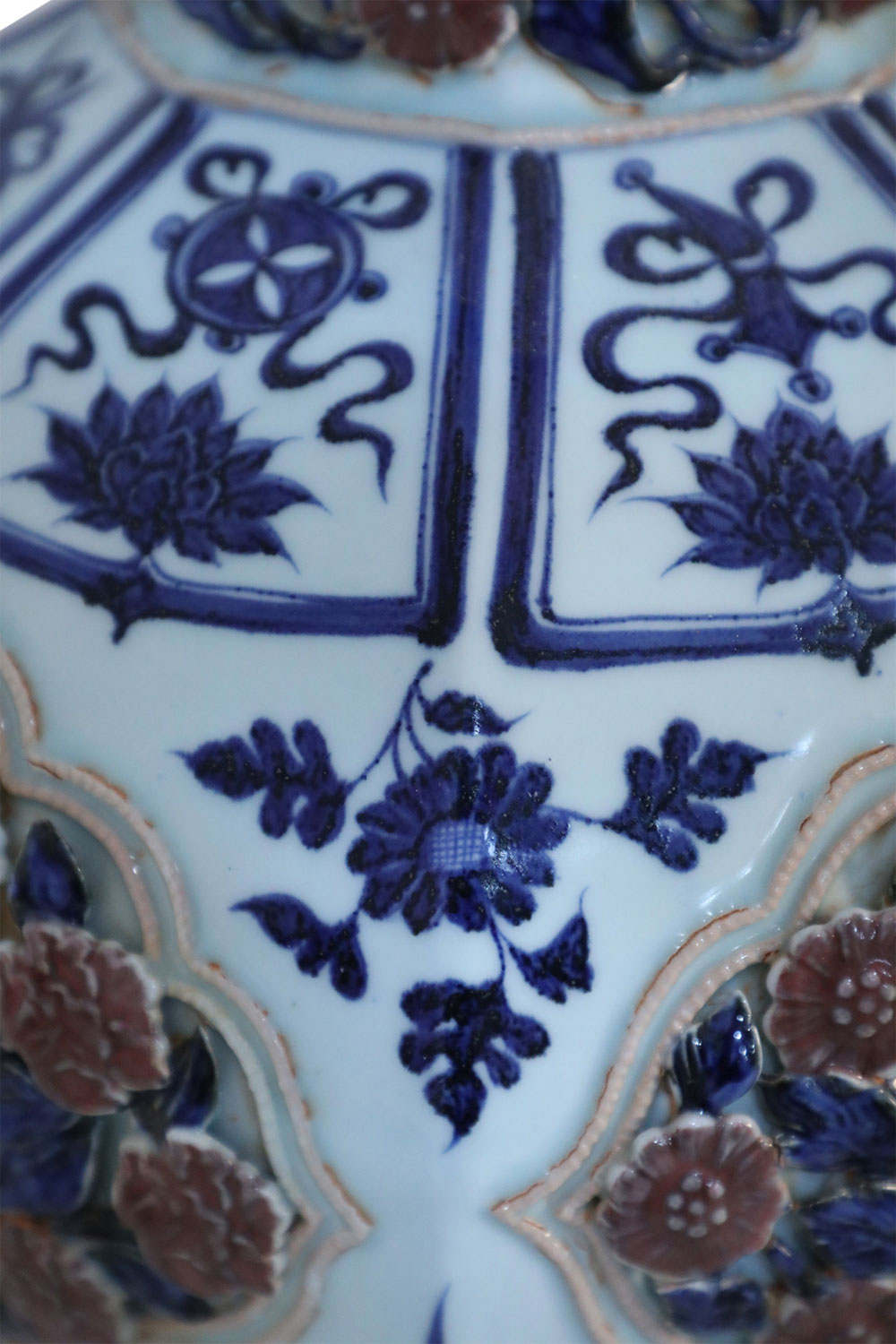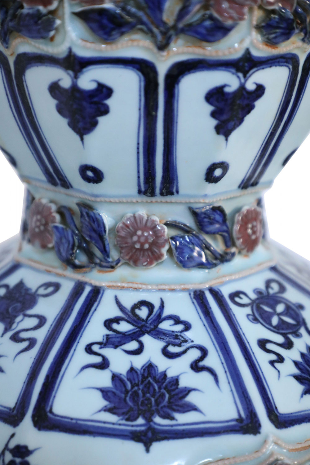 Chinese white and blue double-gourd porcelain vase decorated with bands of blue, framed iconography, and raised, pierced roses amid leaves wrapping the top and middle sections, and as the central motif around the bulbous bottom half.