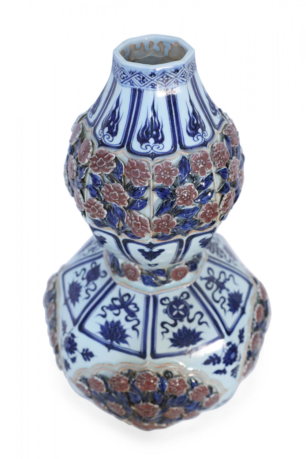 Chinese White and Blue and Raised Rose Design Double Gourd Porcelain Vase