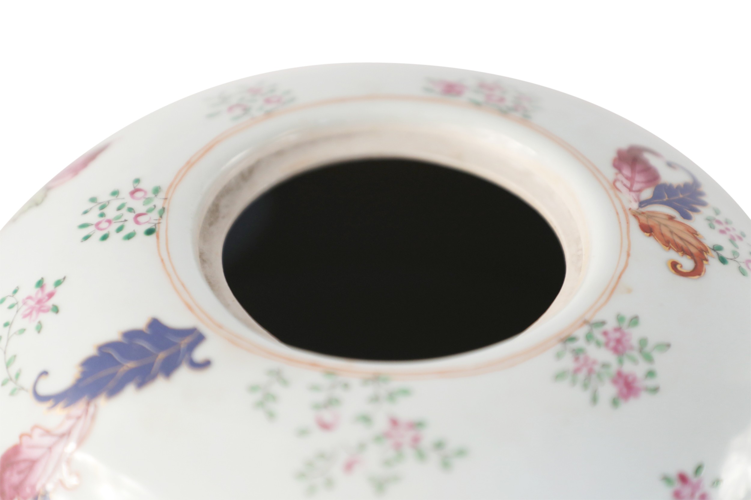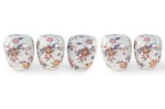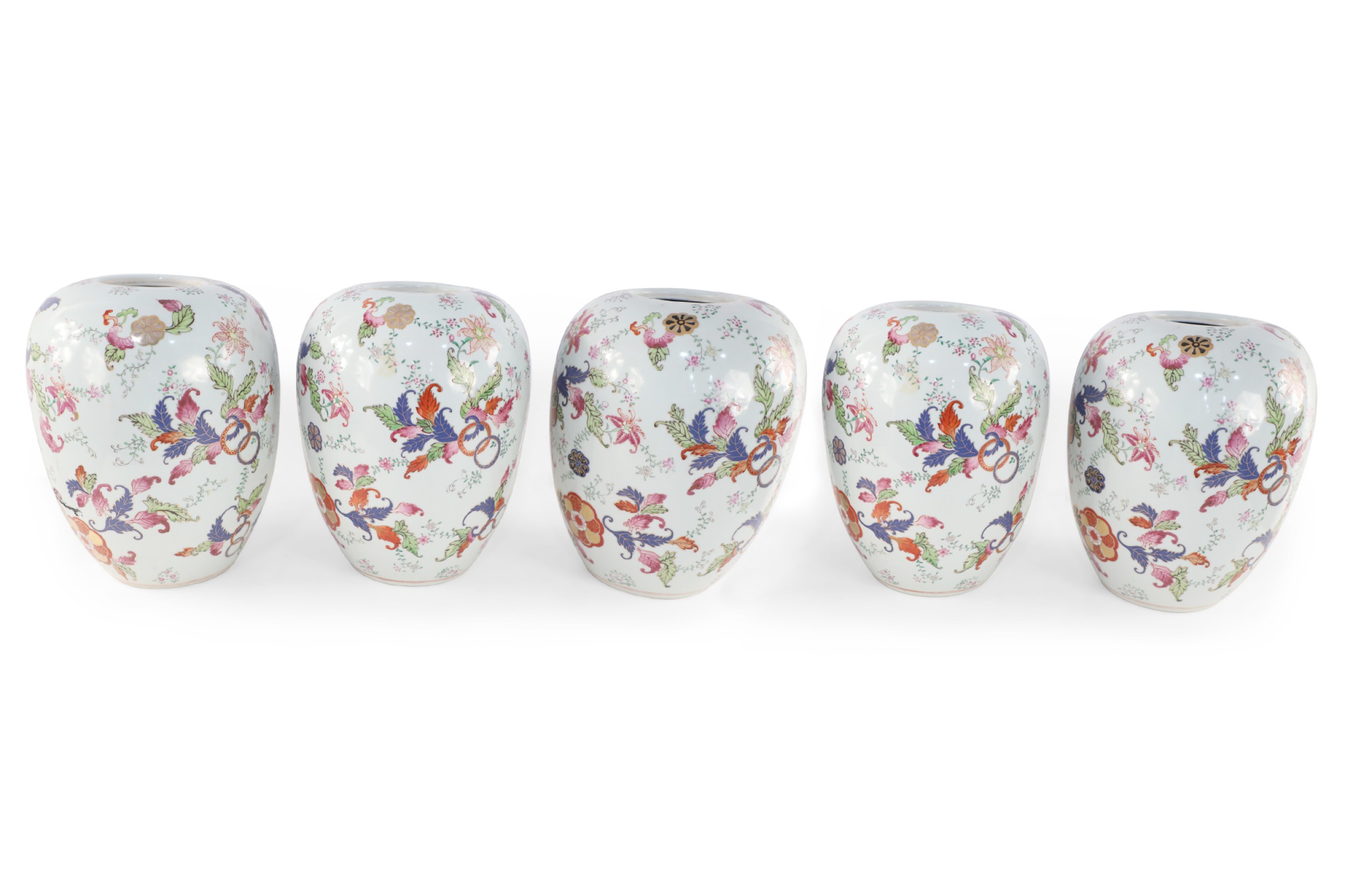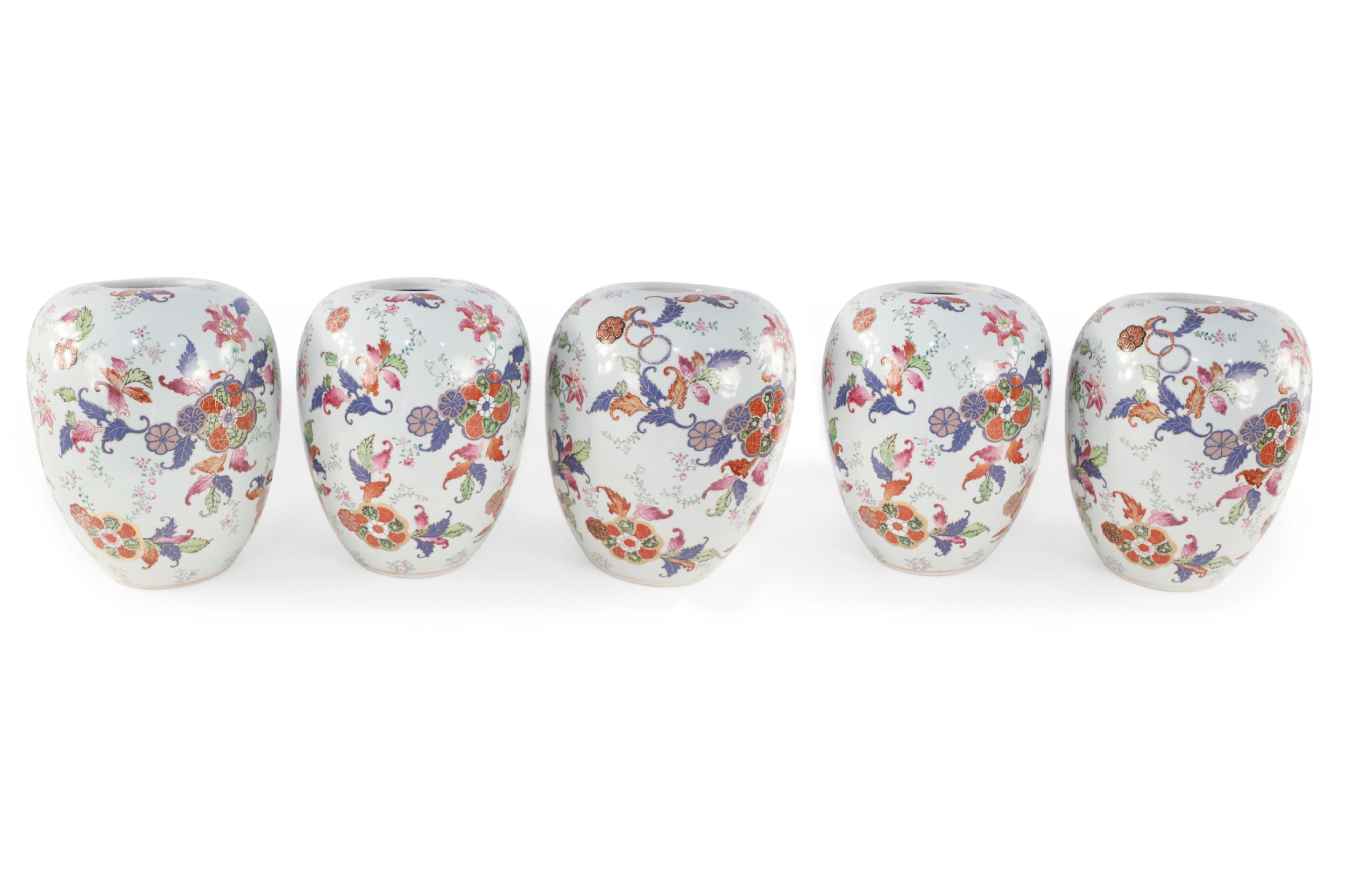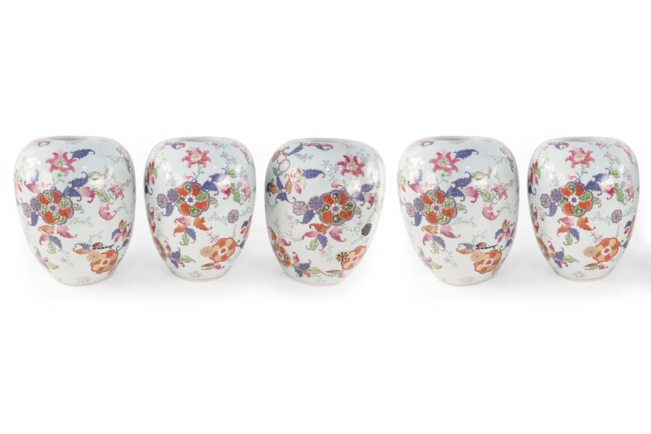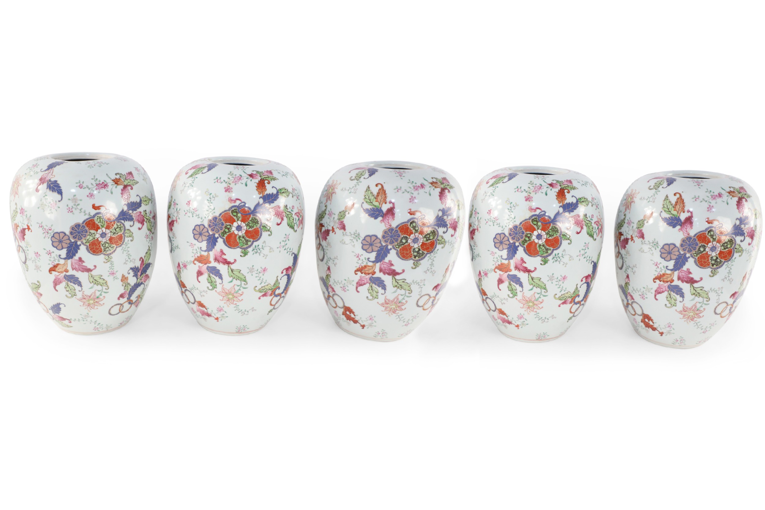 5 Chinese white porcelain, open-mouthed jars decorated in an all-over pattern of florals and foliage in purple, orange and green, accented with gold lotus flowers (PRICED EACH).