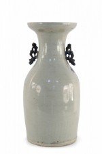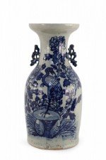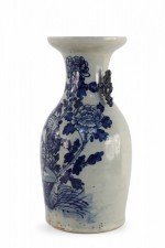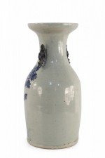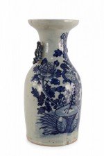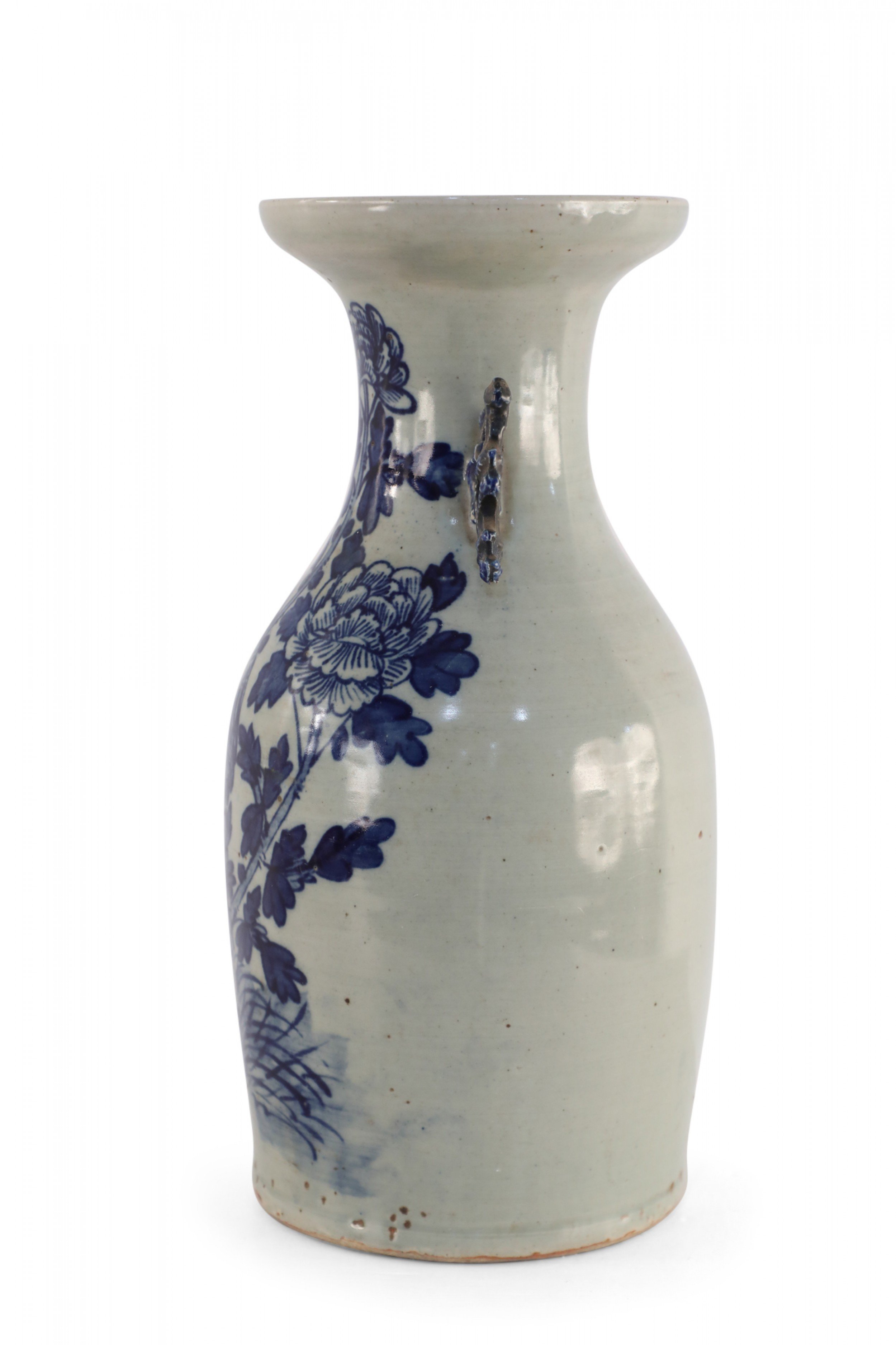 Antique Chinese (Late 19th Century) white, porcelain urn with a navy egret amid florals and two blue scrolled handles along the neck.