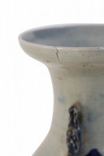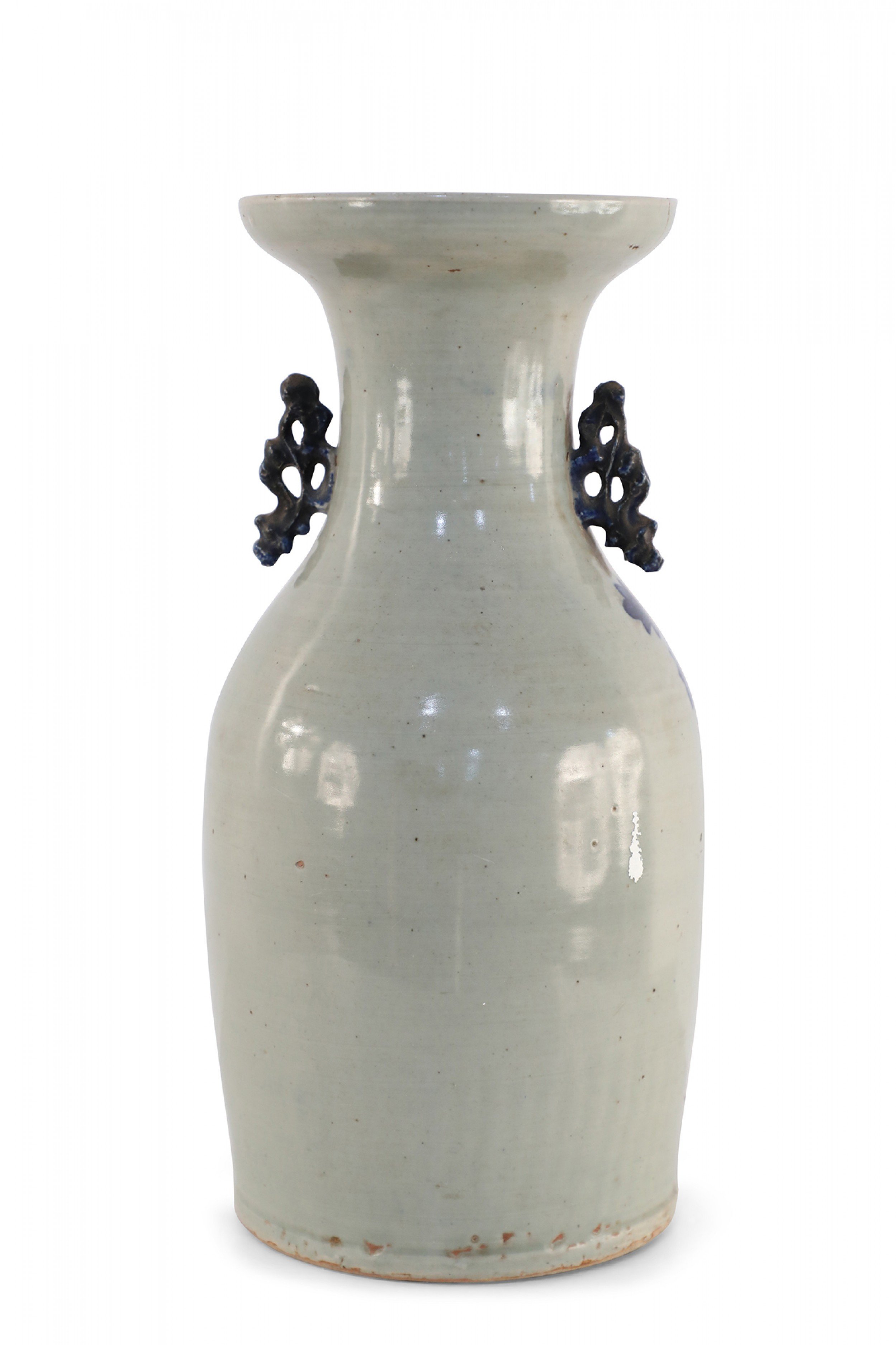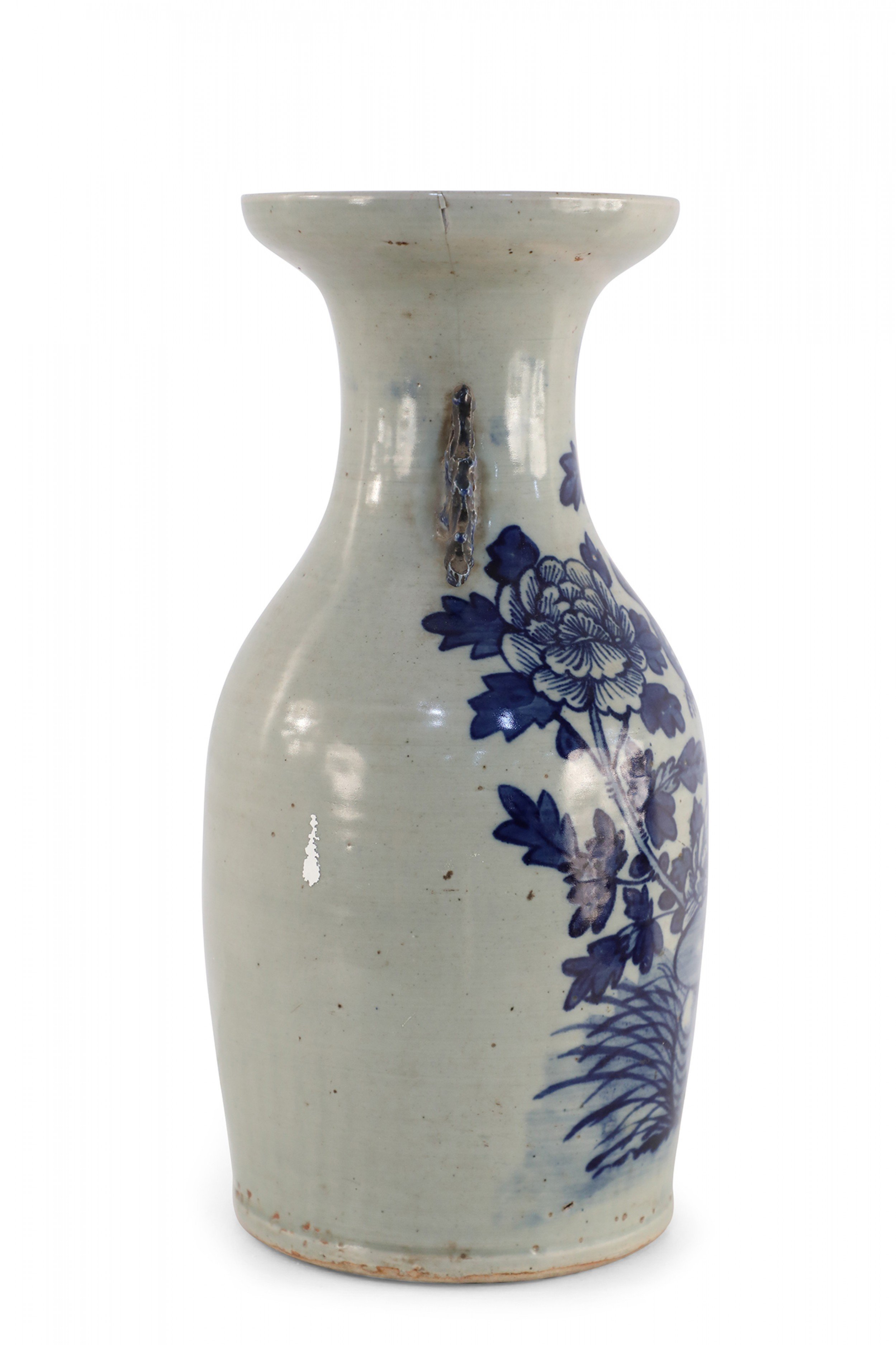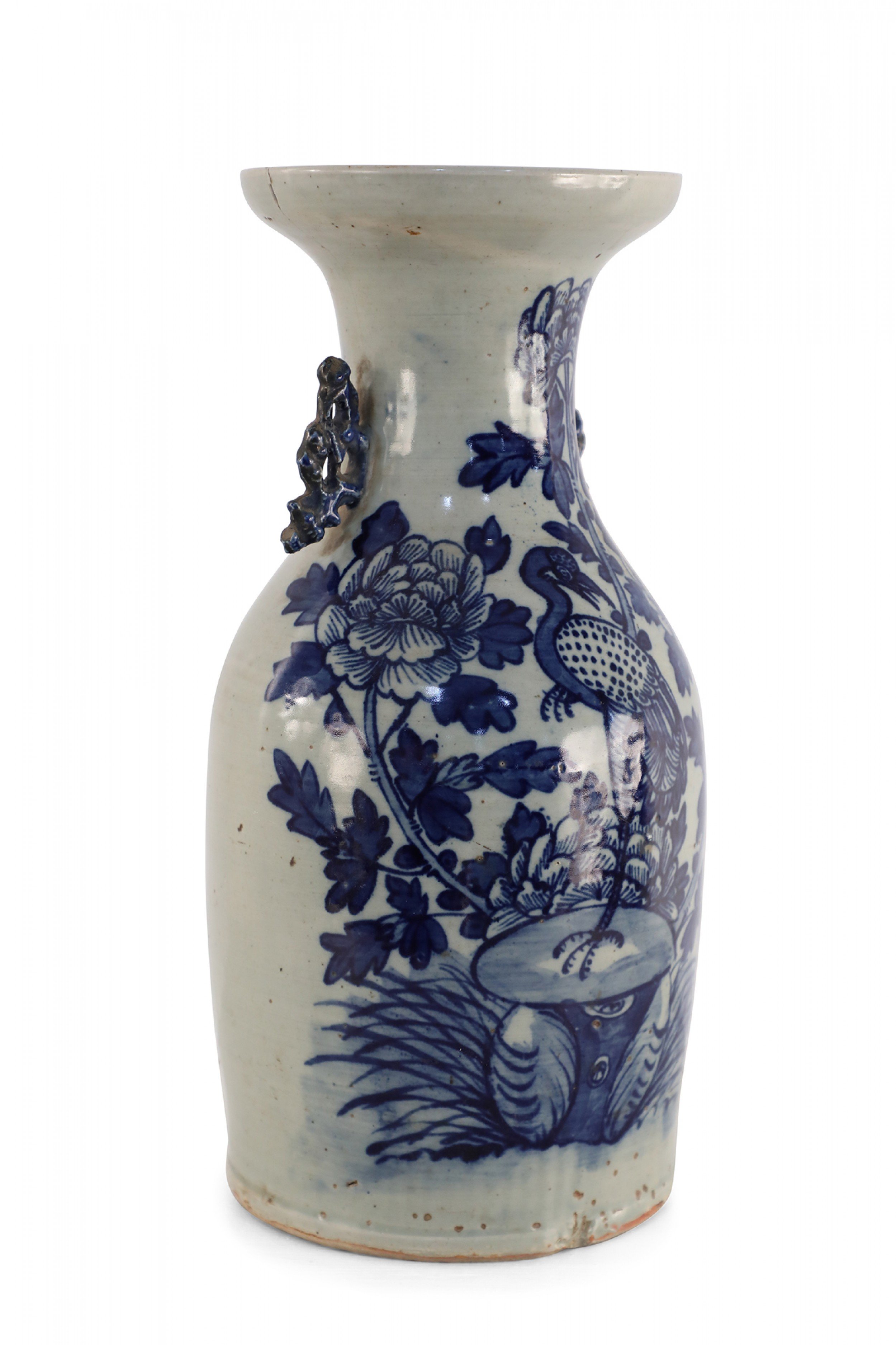 Antique Chinese (Late 19th Century) white, porcelain urn with a navy egret amid florals and two blue scrolled handles along the neck..