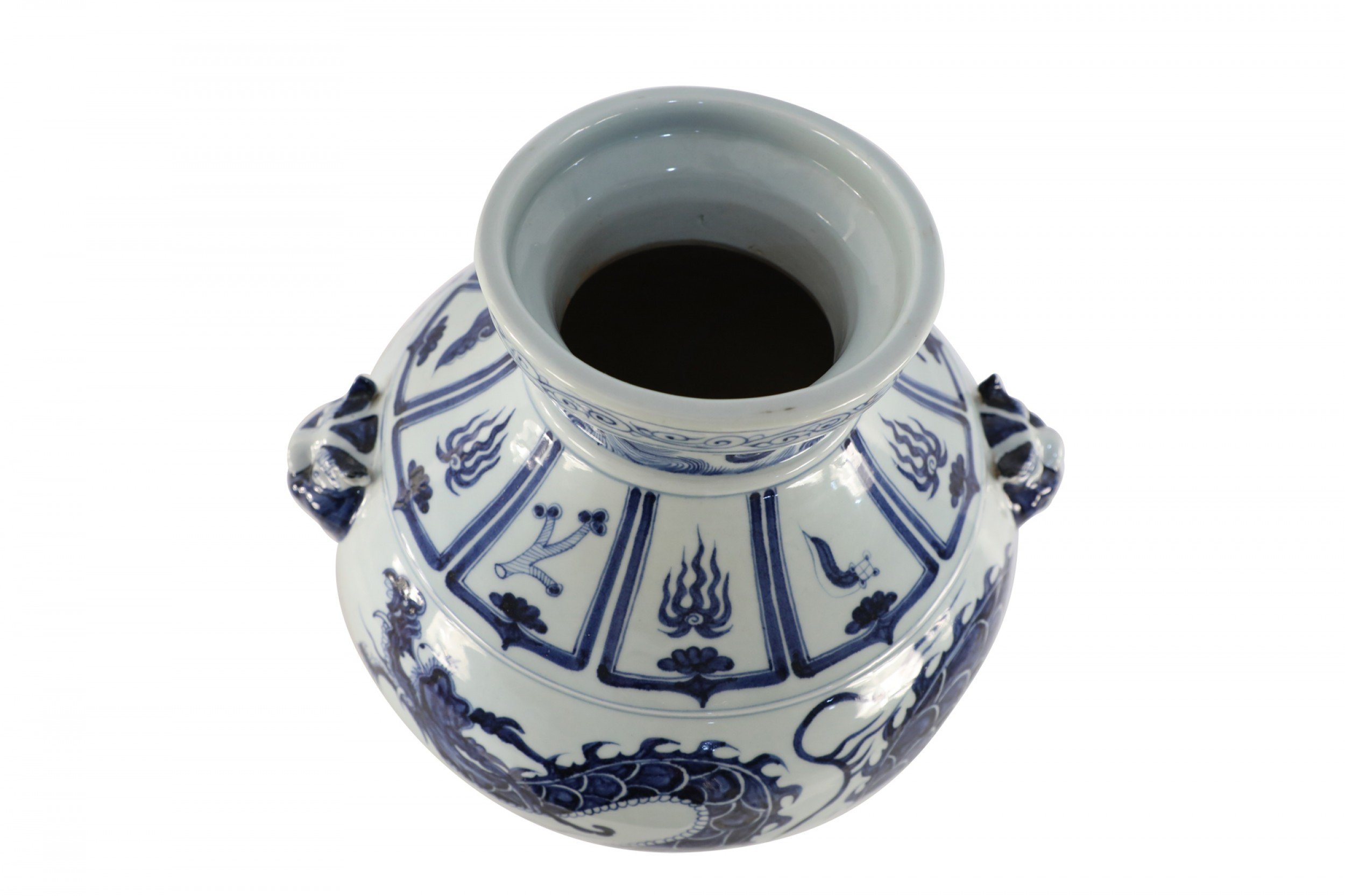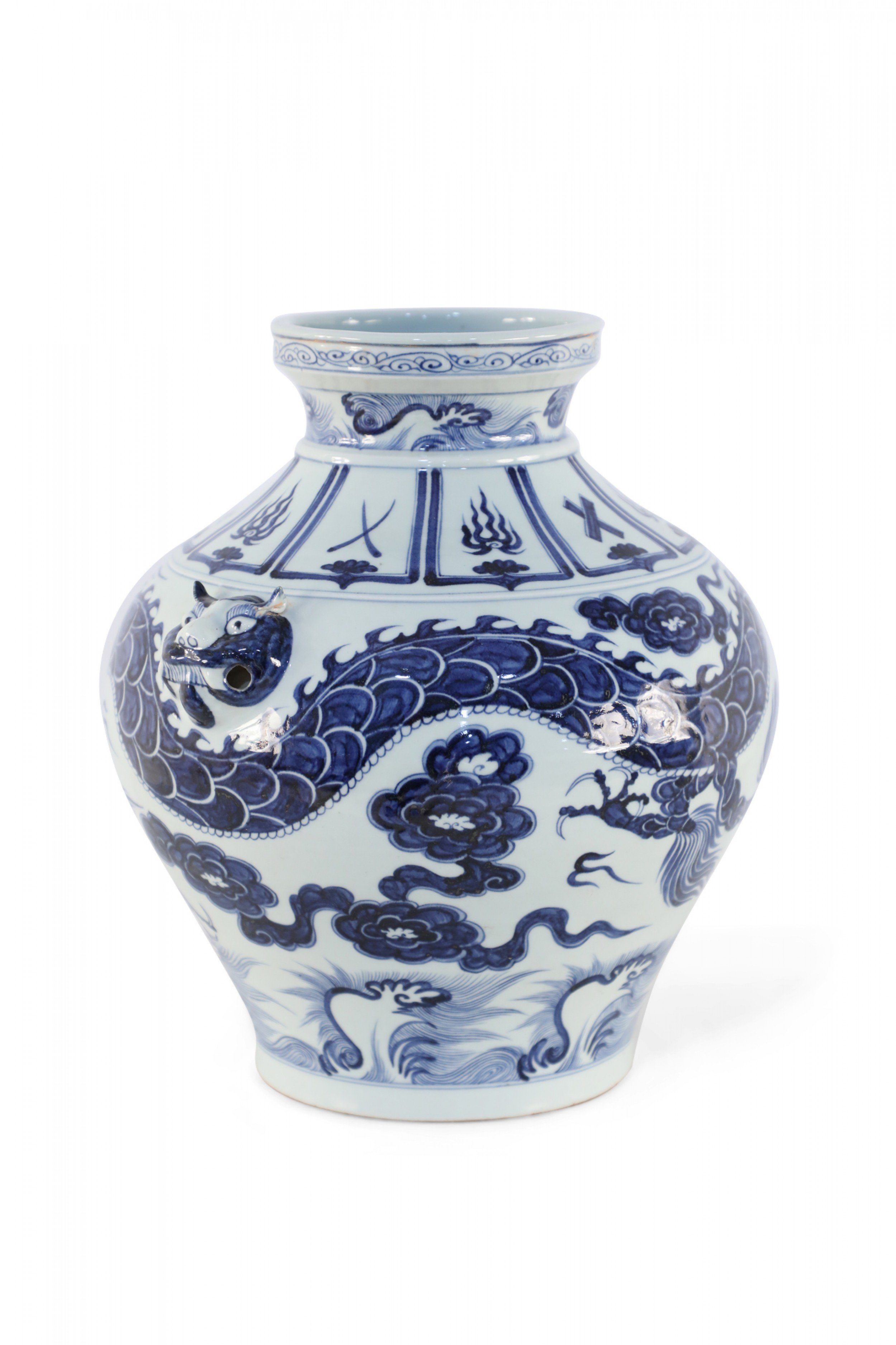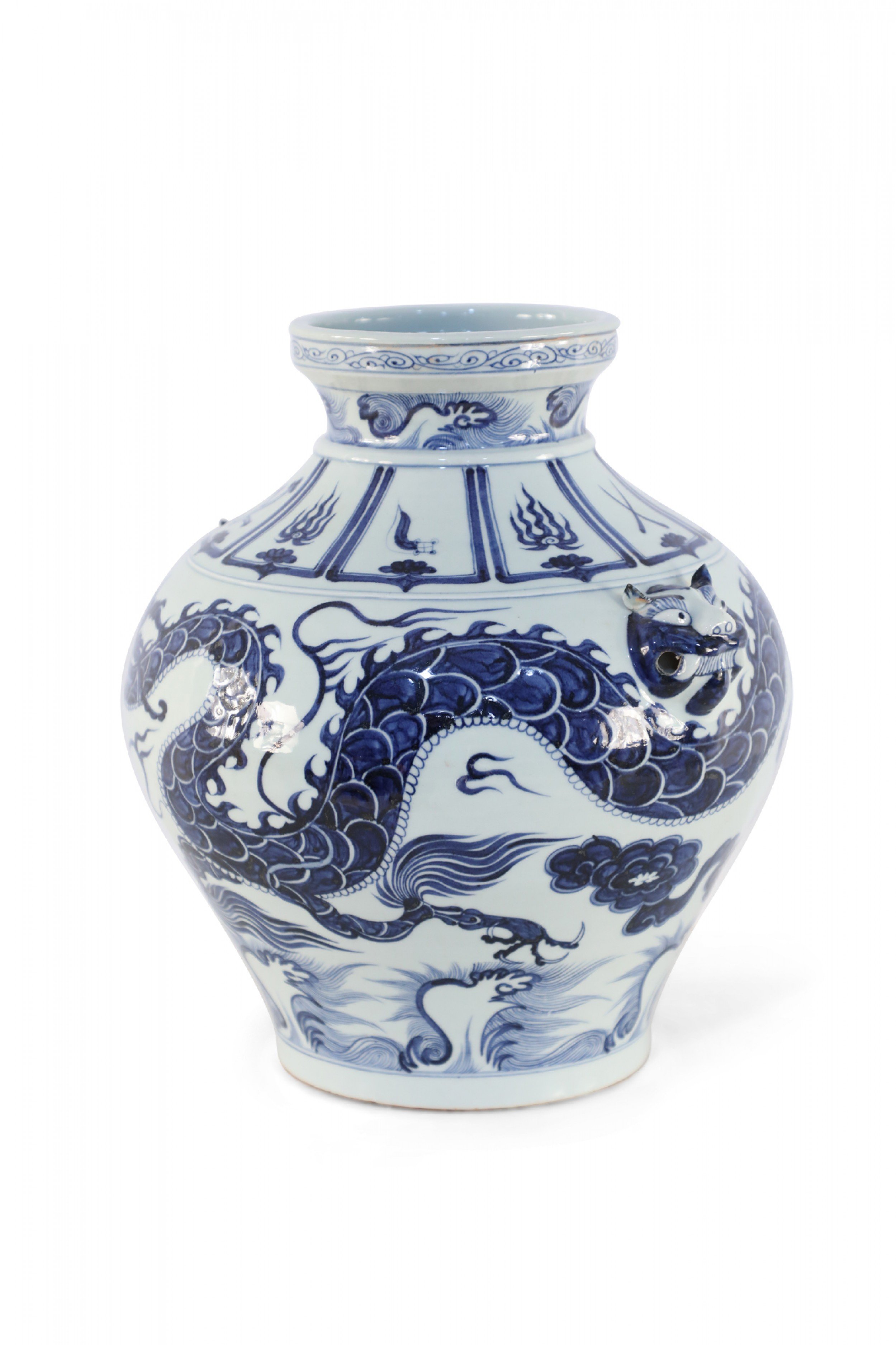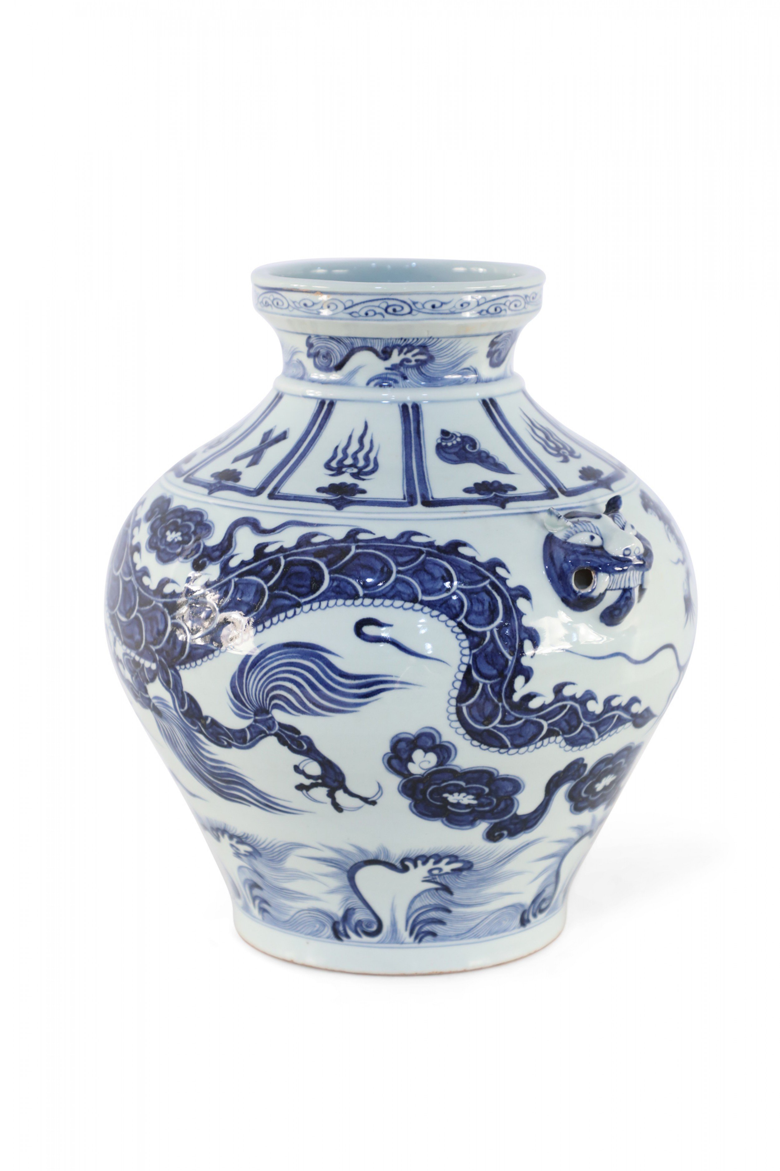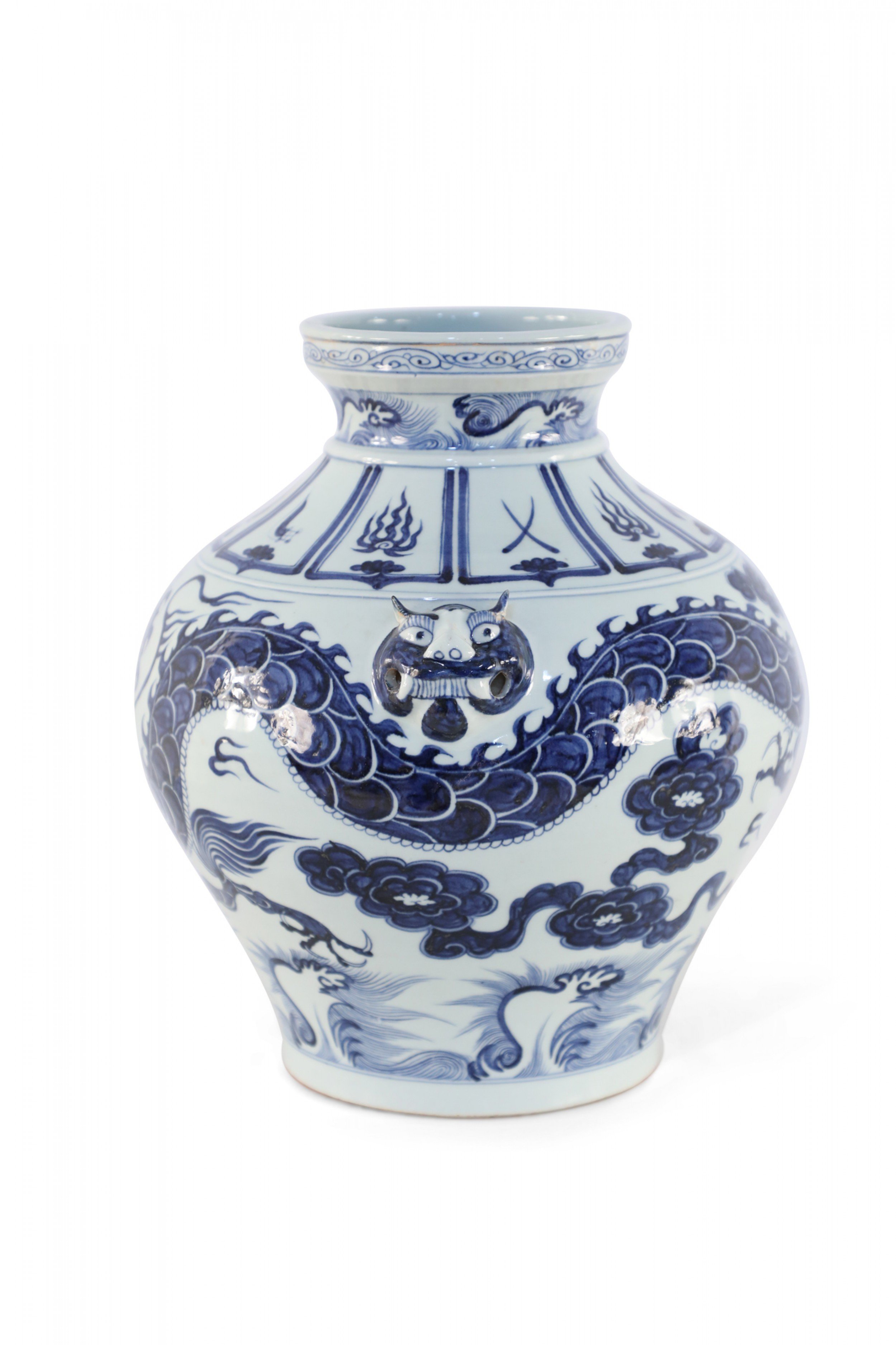 Chinese (late 19th Century) bulbous, white porcelain pot crafted in the Yuan Dynasty style, wrapped in a large scaled blue dragon on the body and decorative symbols around the neck, and accented with foo dog doorknocker ornamentation along the sides.