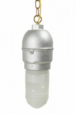 Contemporary industrial hanging light fixture with a silver painted steel fixture supporting a thick ribbed glass globe. (Similar fixture: 062966)