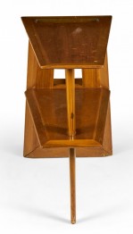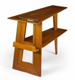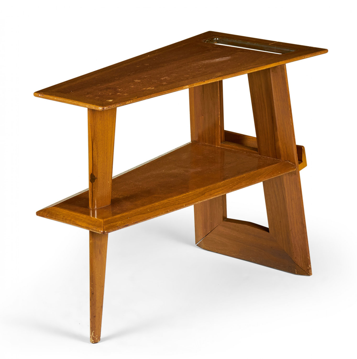 Danish Mid-Century walnut end table with a wedge-shaped top with a rectangular cut-out and a lower shelf having a small magazine holder supported by a tapered leg on the narrow side and a double leg on the opposite side (manner of JENS RISOM)(Available in blond mahogany: DUF0117A).