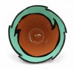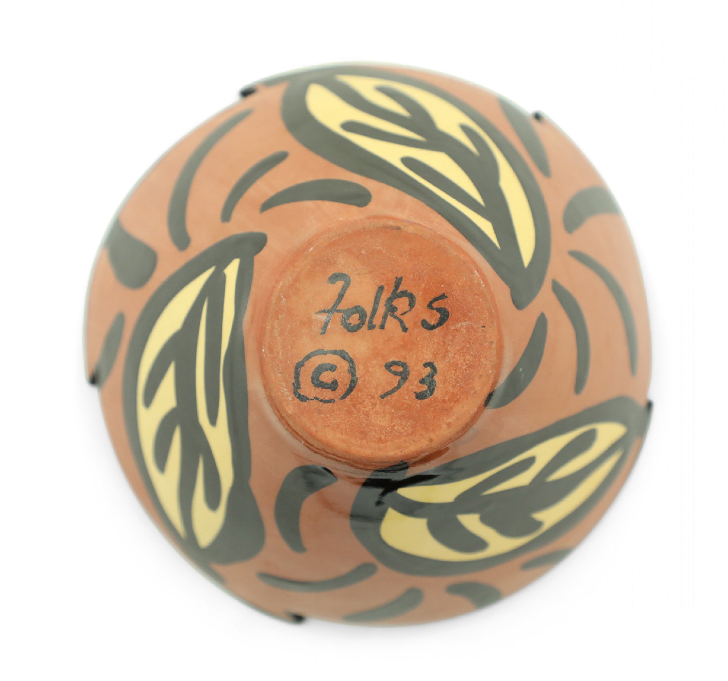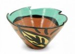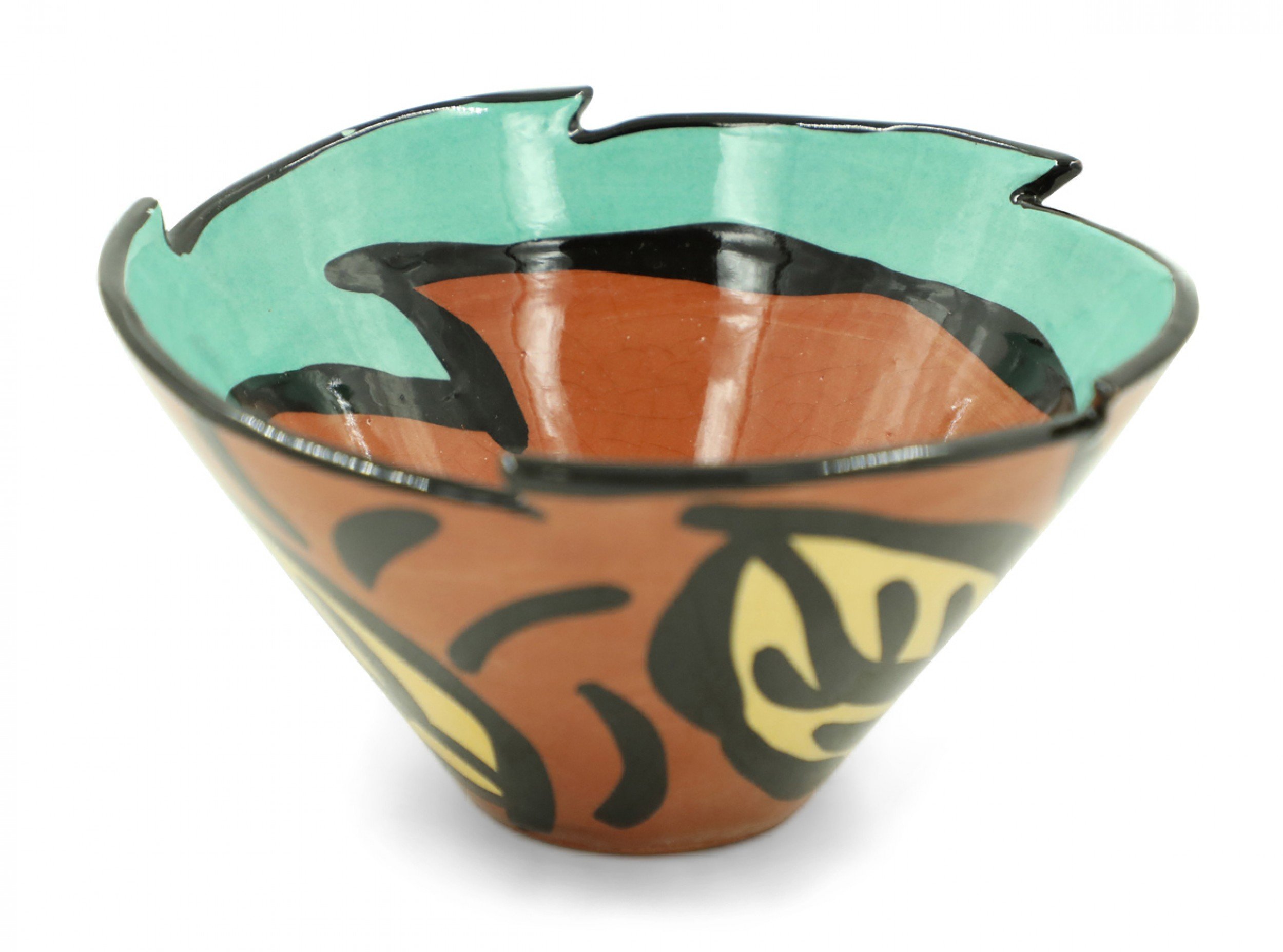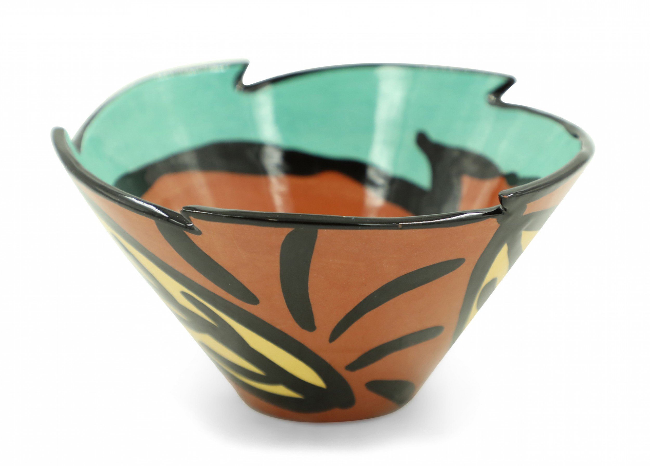 Contemporary decorative ceramic bowl with a wave shaped abstract rim, tapered sides, and a turquoise, terra-cotta, black, and yellow leaf design decorative glaze.
