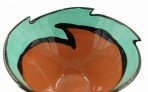 Contemporary decorative ceramic bowl with a wave shaped abstract rim, tapered sides, and a turquoise, terra-cotta, black, and yellow leaf design decorative glaze..