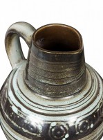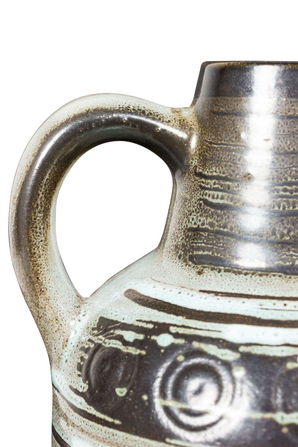 East German Mid-Century ceramic pitcher with a light blue horizontal stripe pattern with a band of circular stripes around the top of the pitcher body and the base of the handle. (possibly STREHLA KERAMIK, numbered 999)(Similar vessel: 063125).