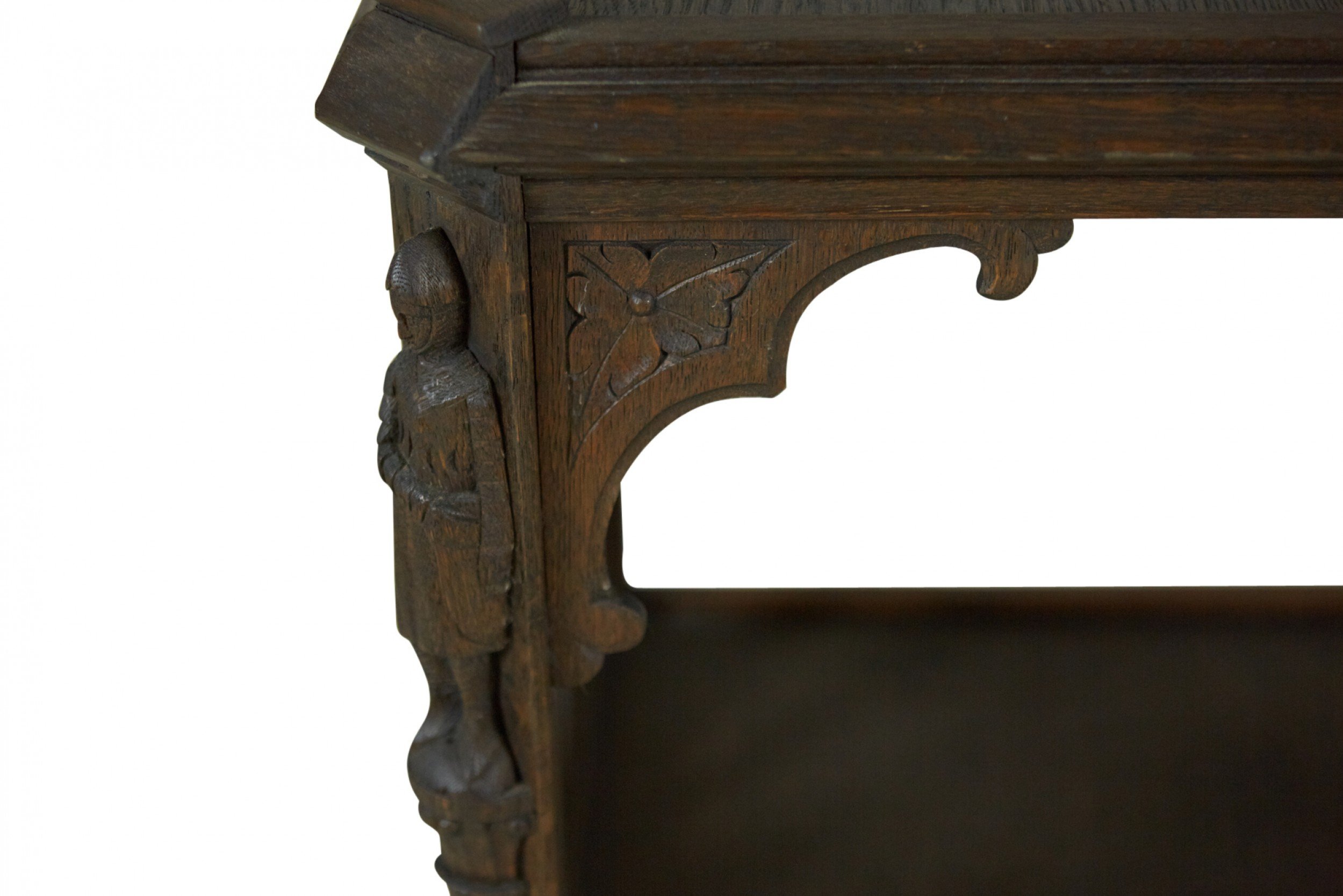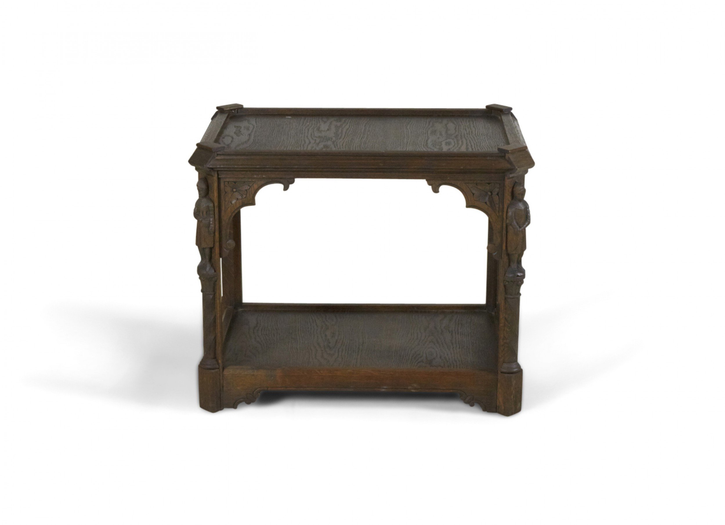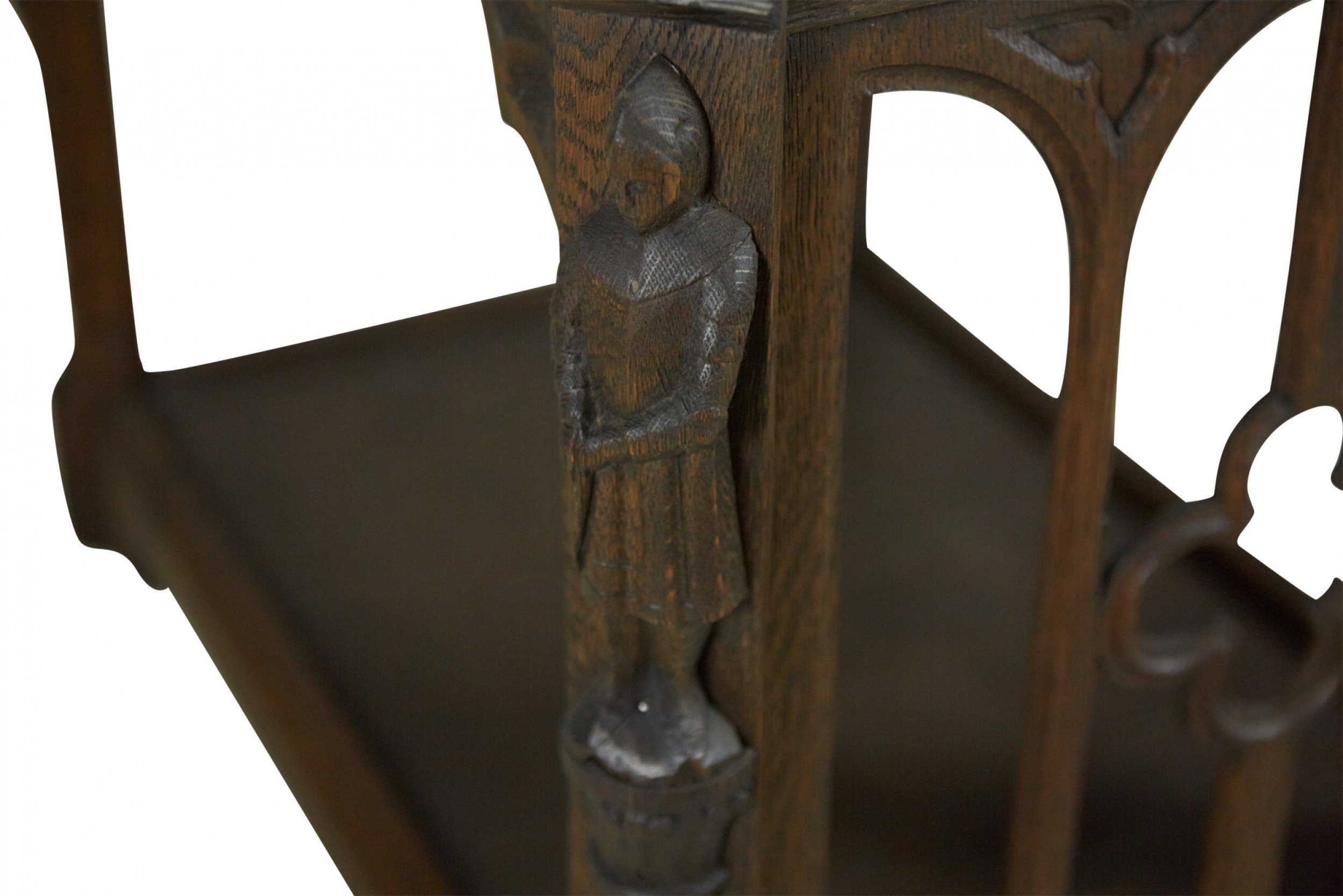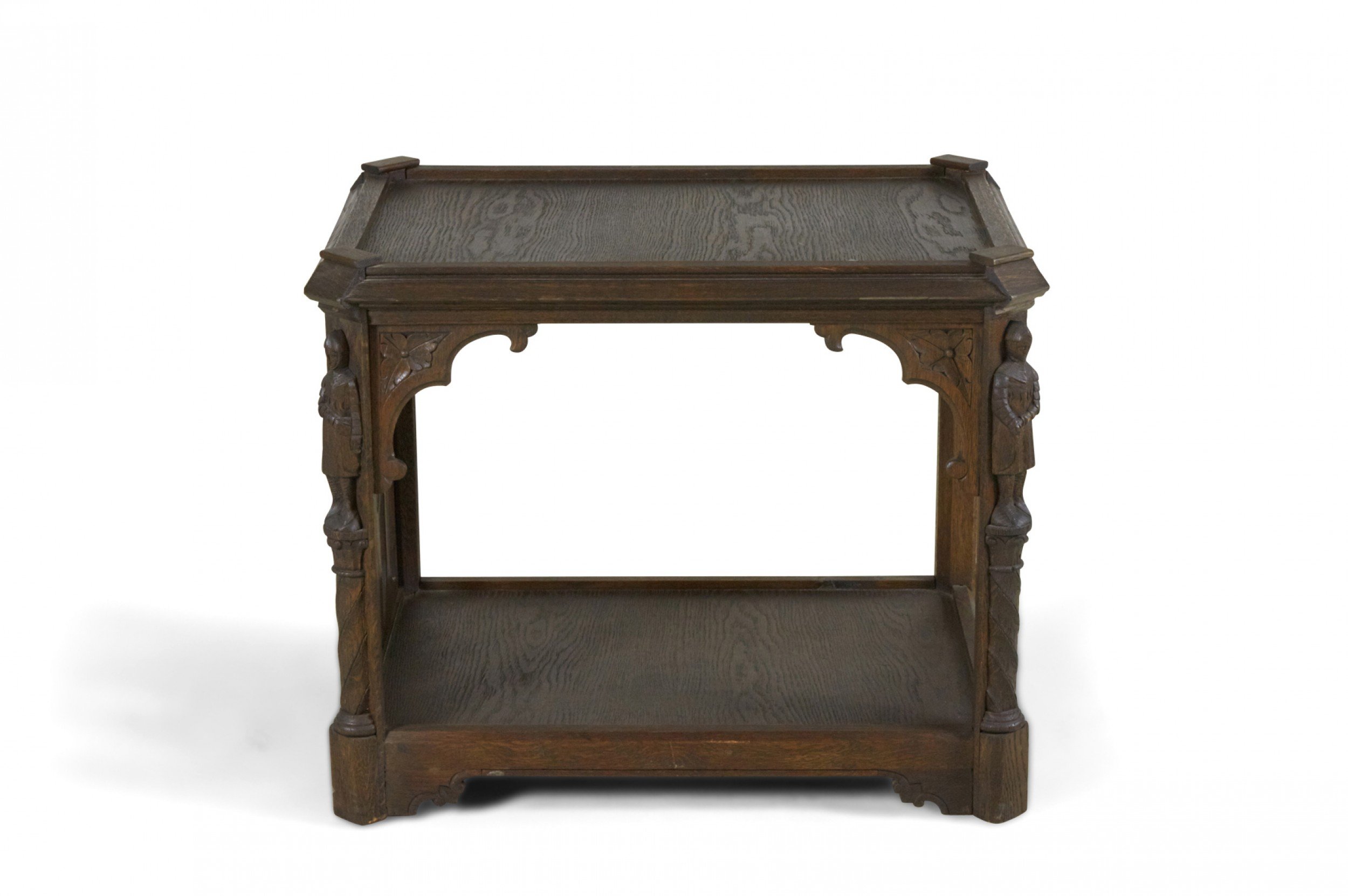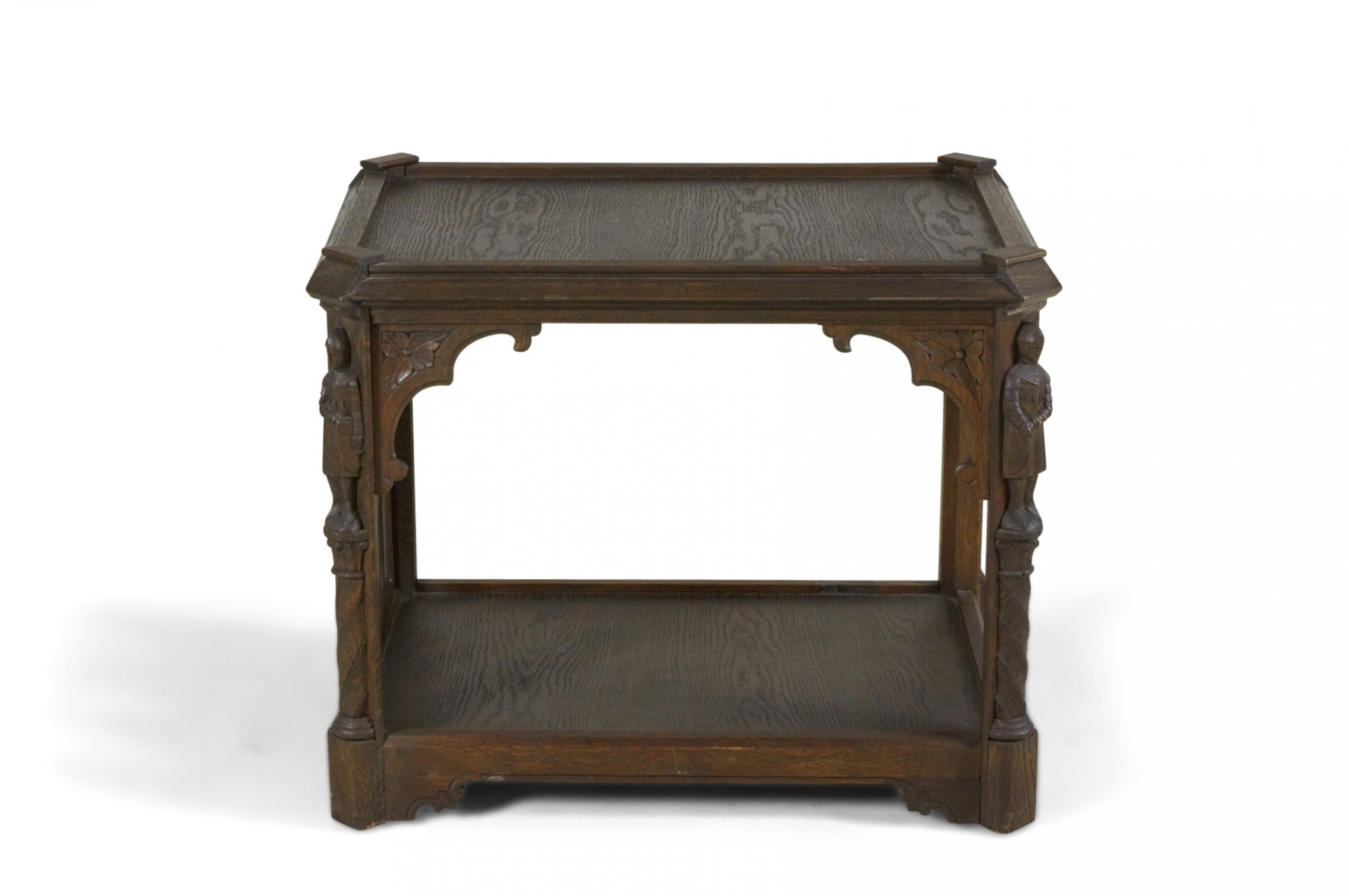 English Gothic style (early 20th century) oak end table with twisted pilaster corners surmounted by carved knight figures (marked: BELGIUM)