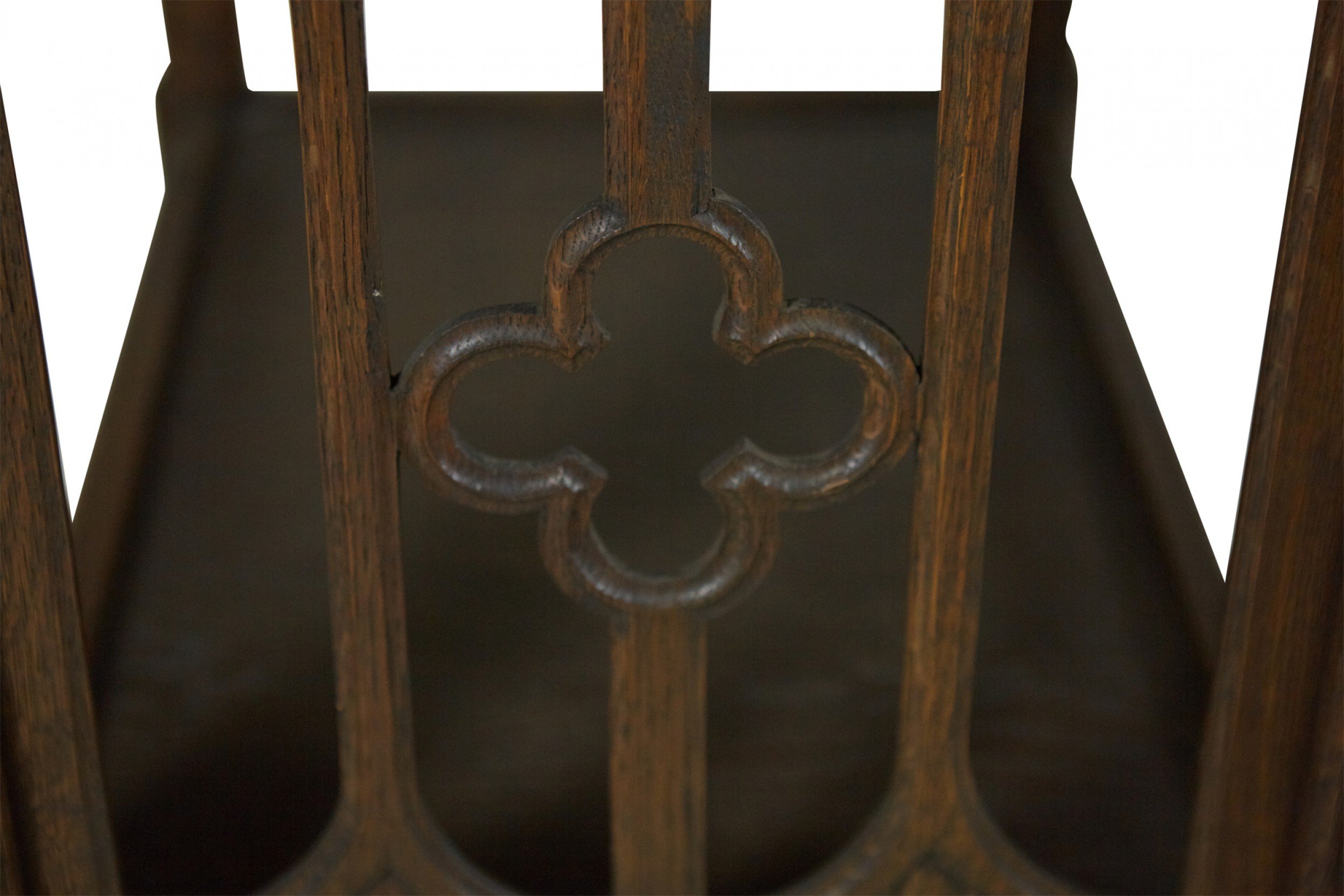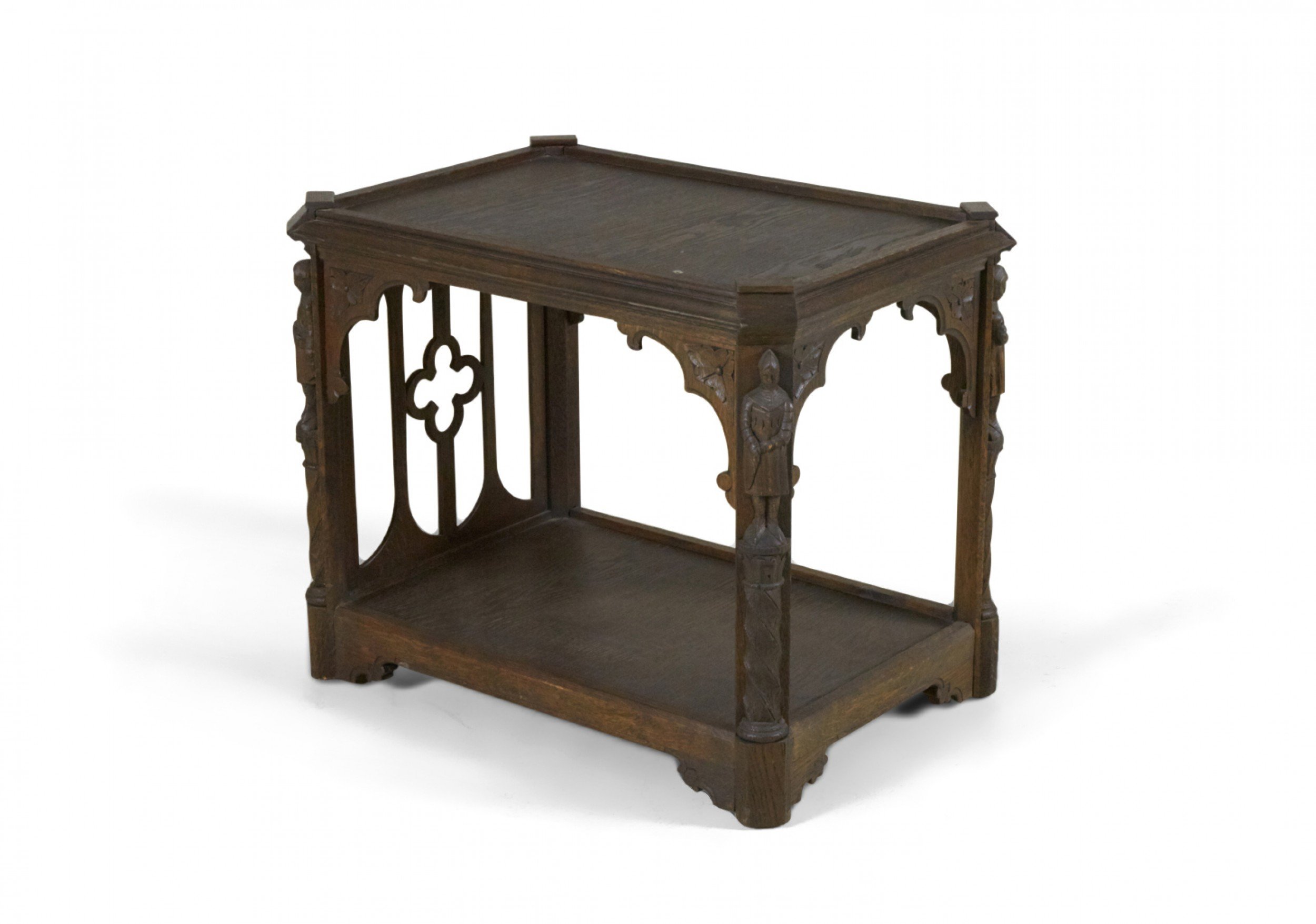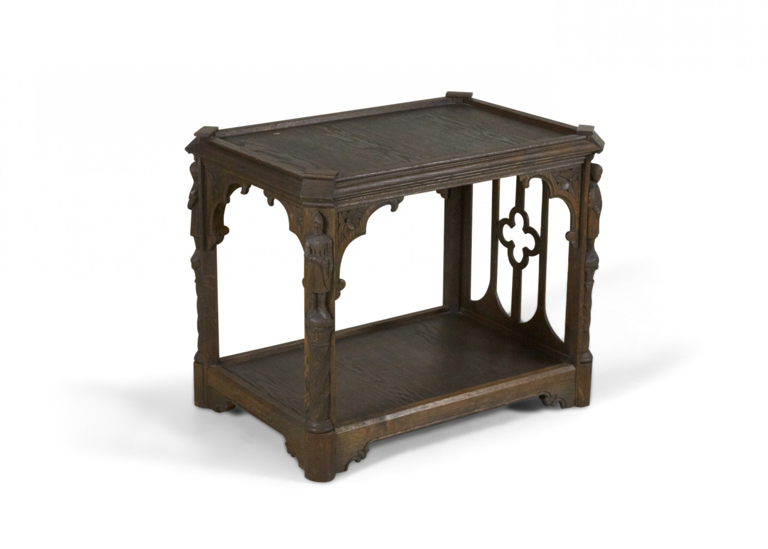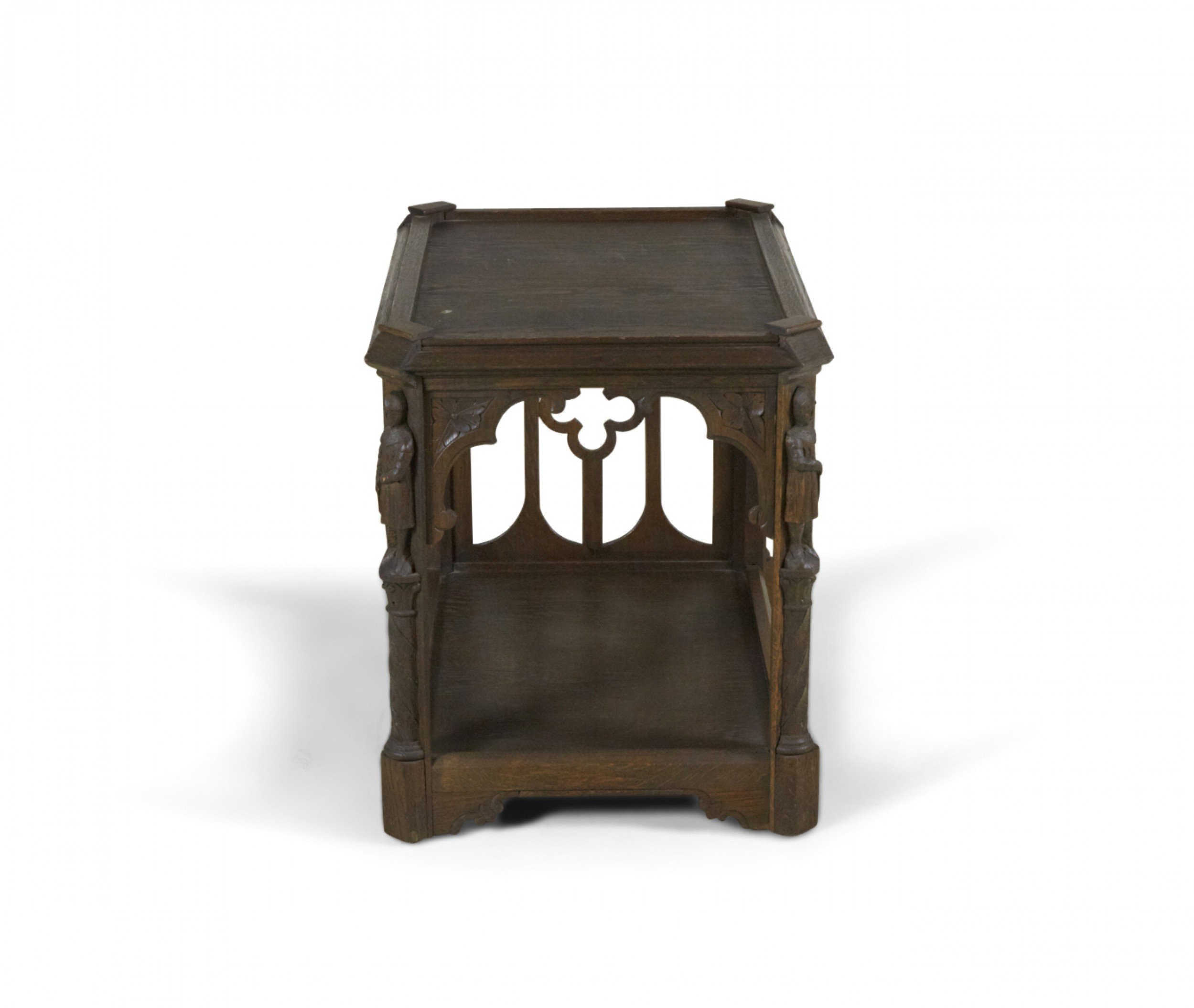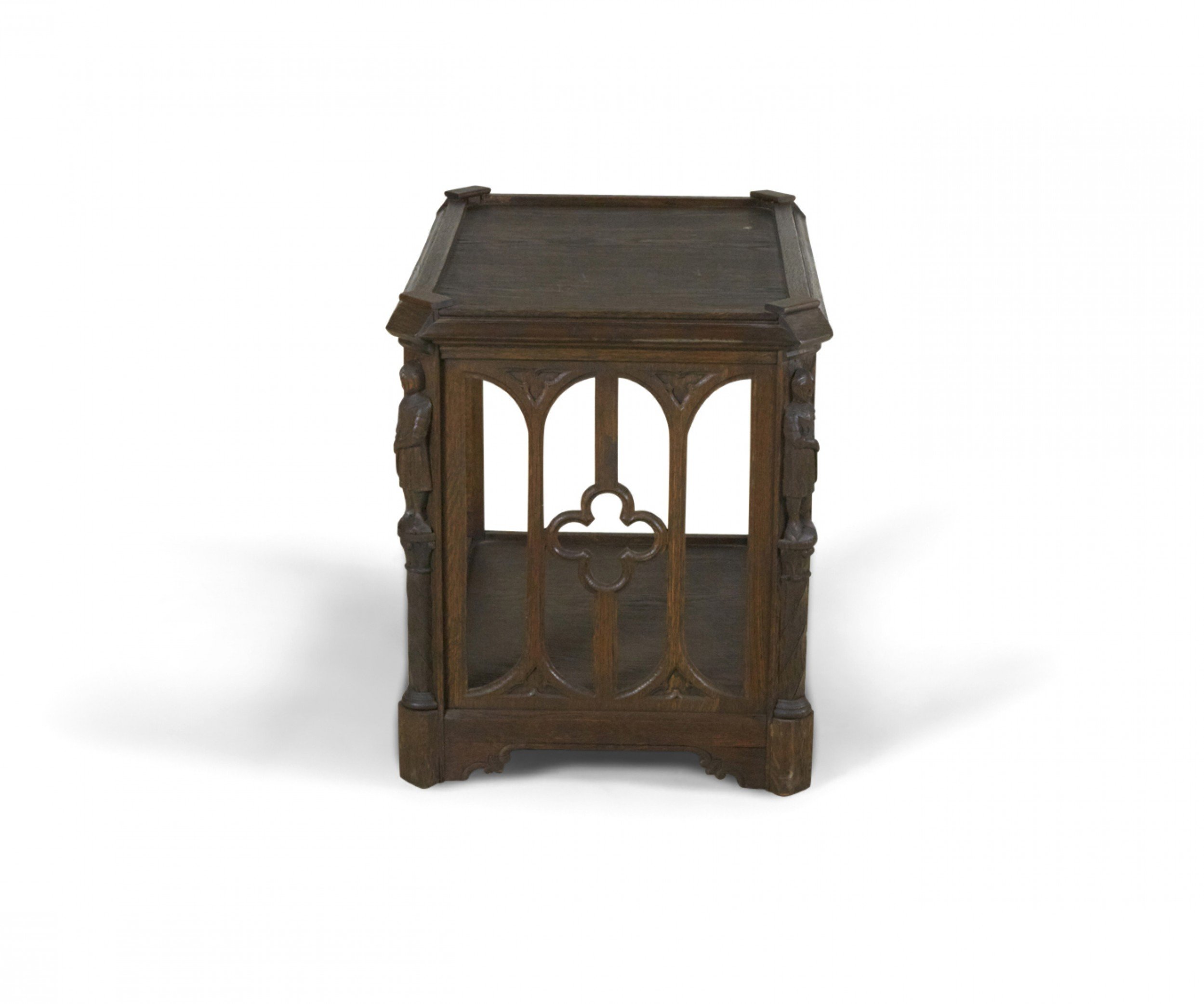 English Gothic style (early 20th century) oak end table with twisted pilaster corners surmounted by carved knight figures (marked: BELGIUM)