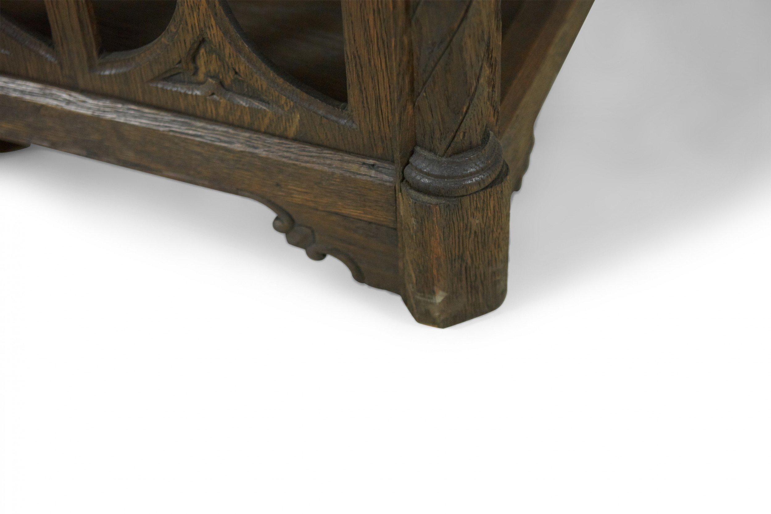 English Gothic style (early 20th century) oak end table with twisted pilaster corners surmounted by carved knight figures (marked: BELGIUM).