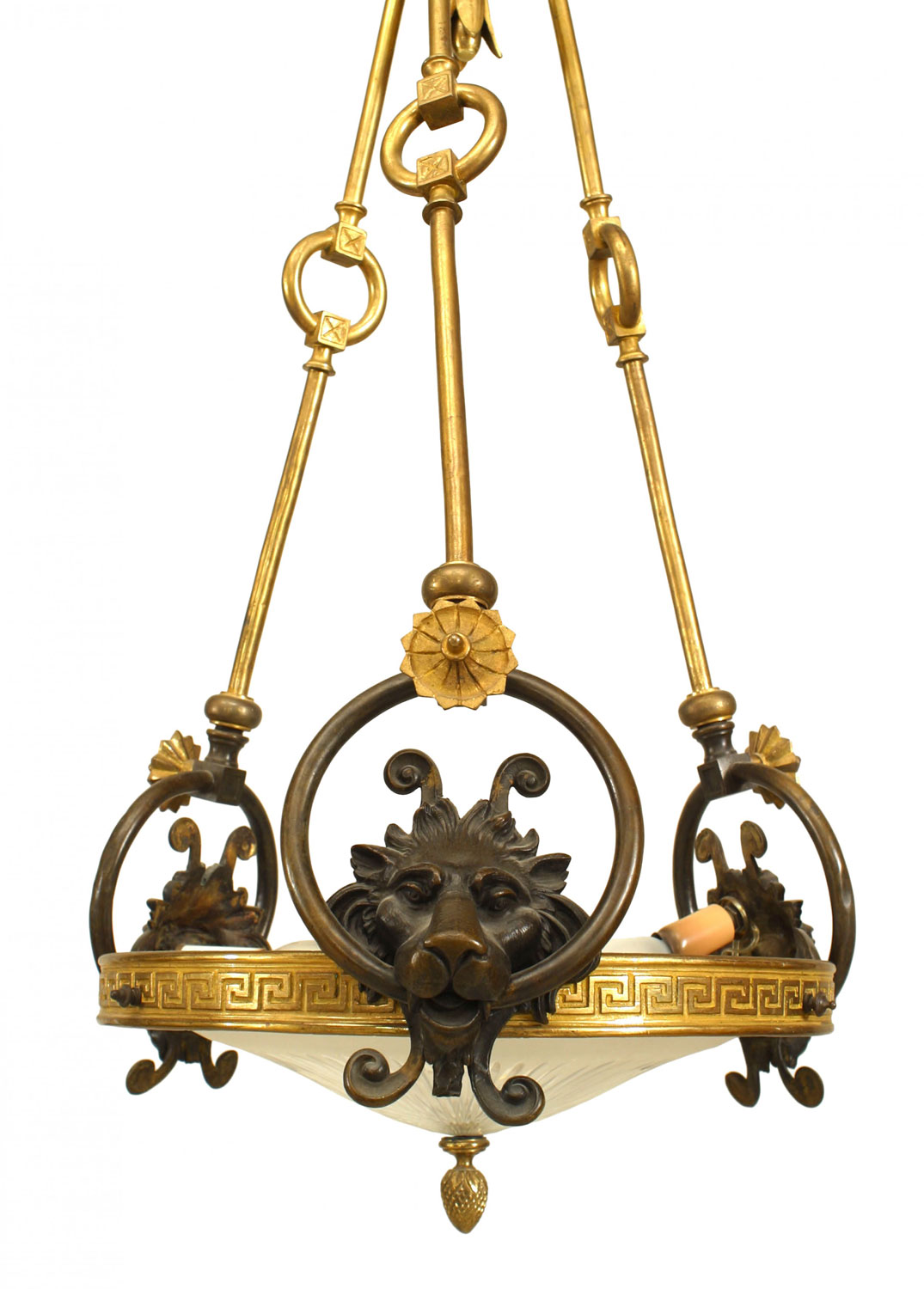 English Regency bronze circular cut glass shade placed within a Greek key frame and suspended from decorative rods featuring three lion heads support links.