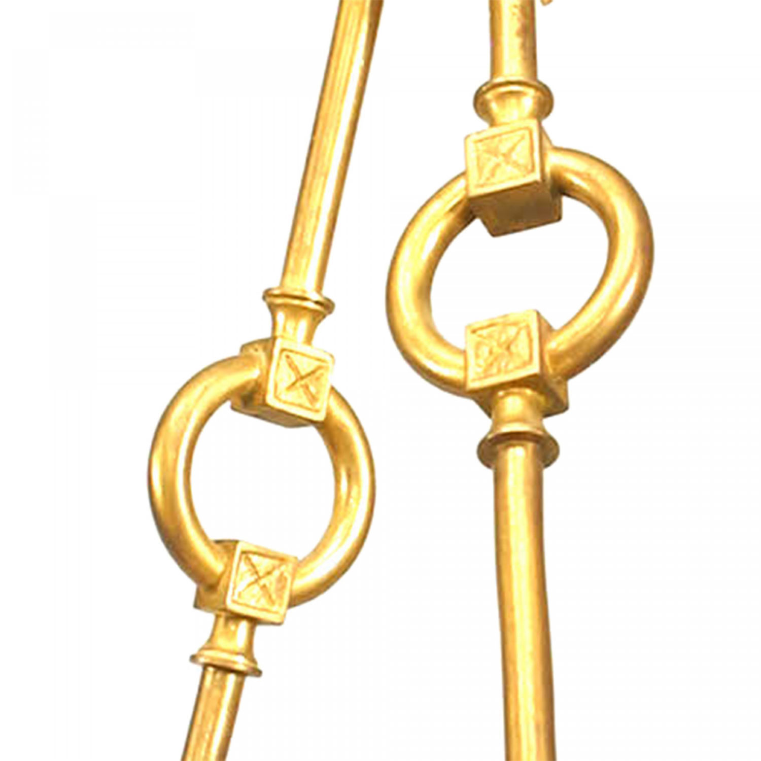 English Regency bronze circular cut glass shade placed within a Greek key frame and suspended from decorative rods featuring three lion heads support links..