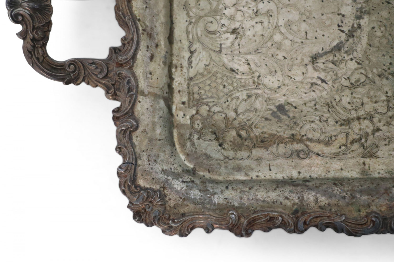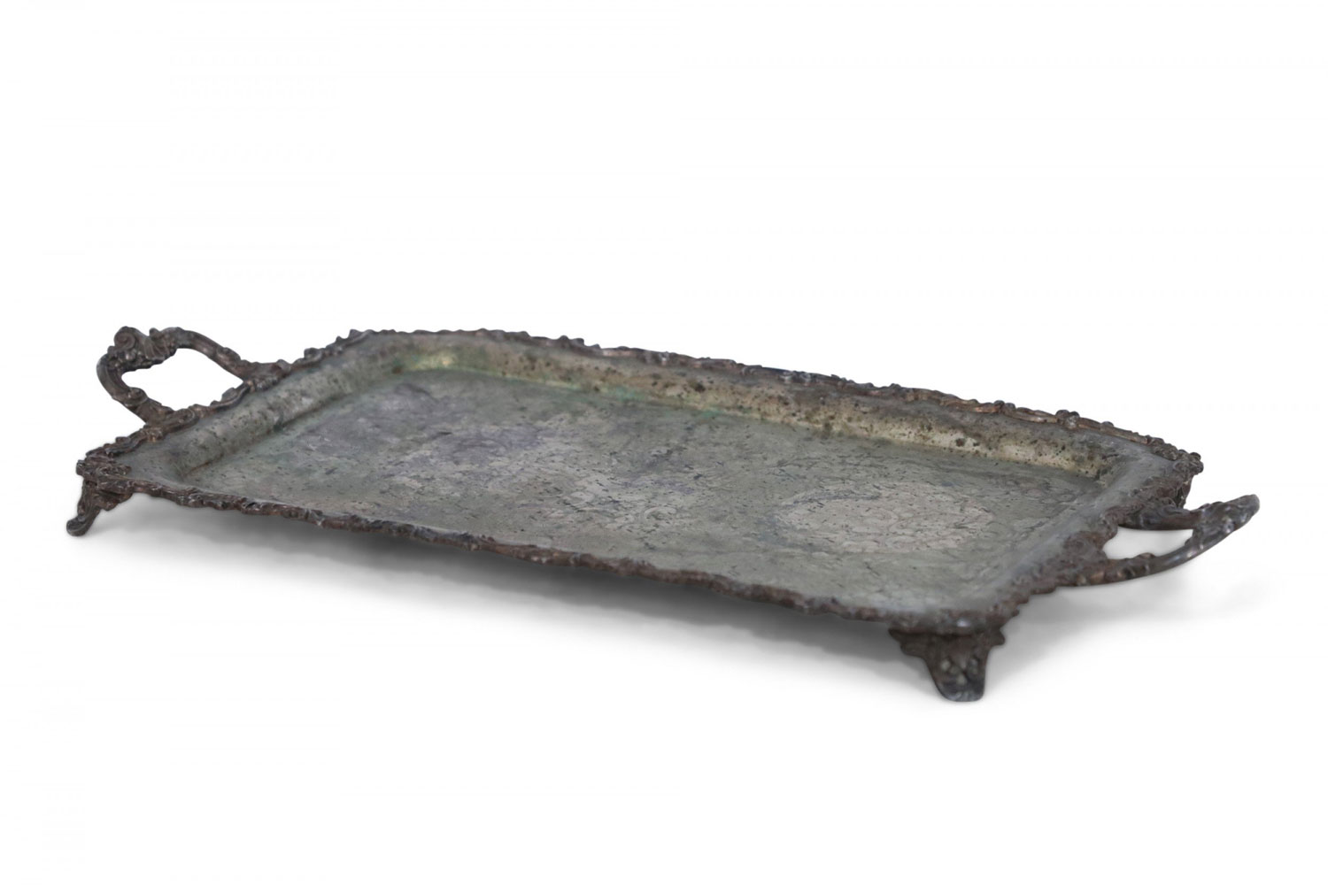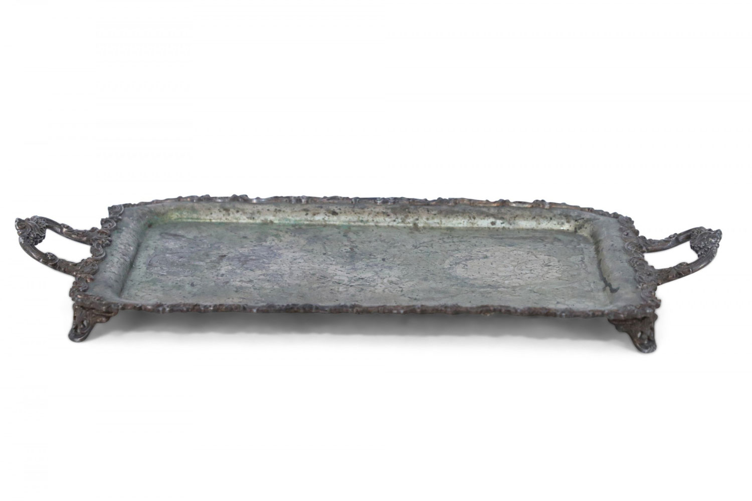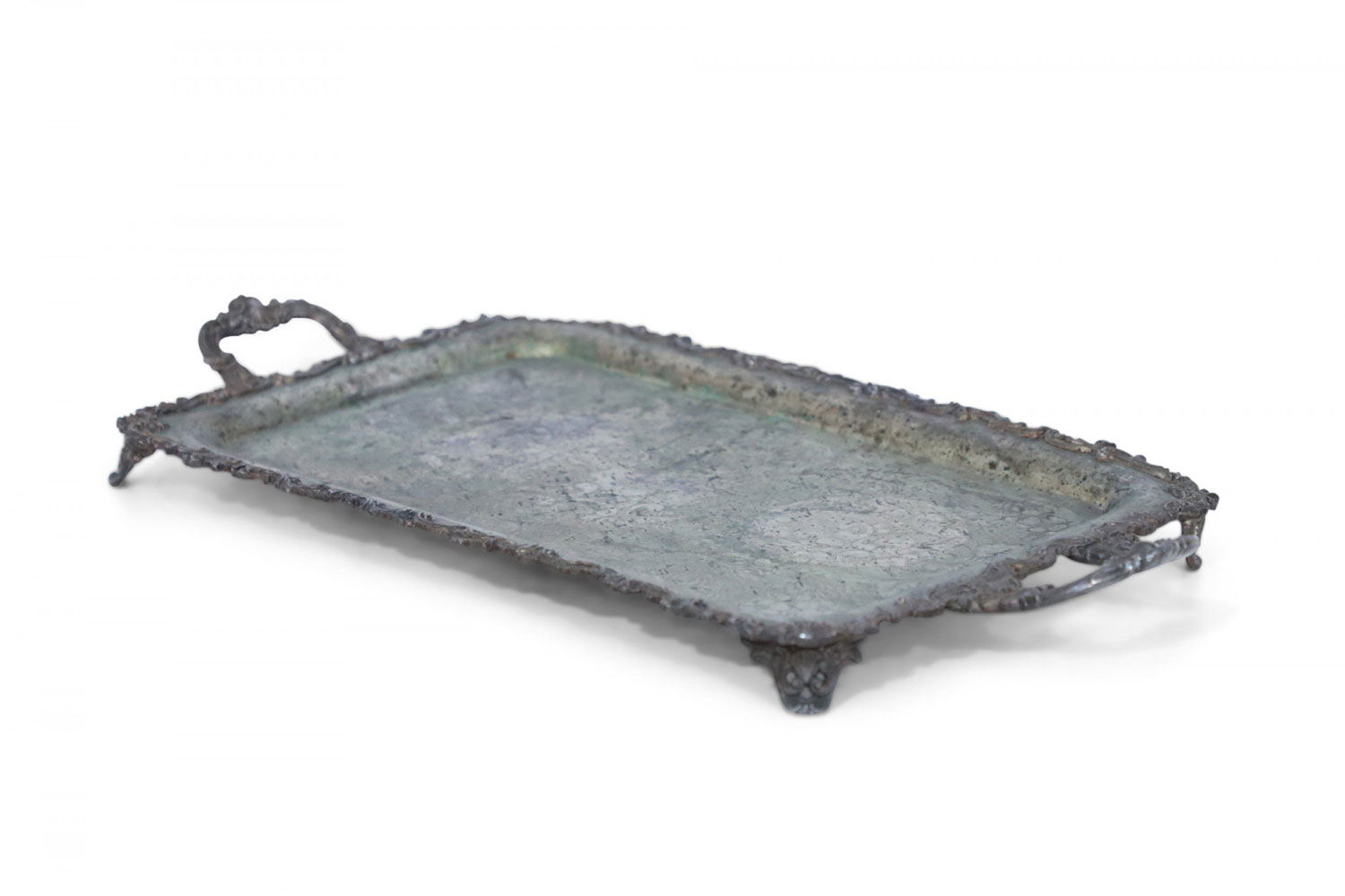English Victorian silver plate rectangular serving tray with a heavy patina, engraved surface, and ornate handles, border, and four feet..