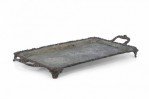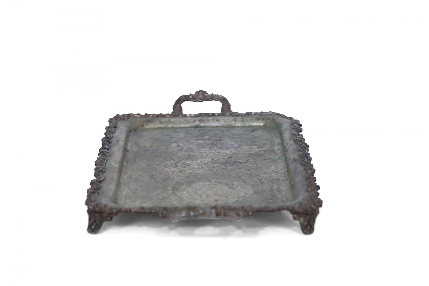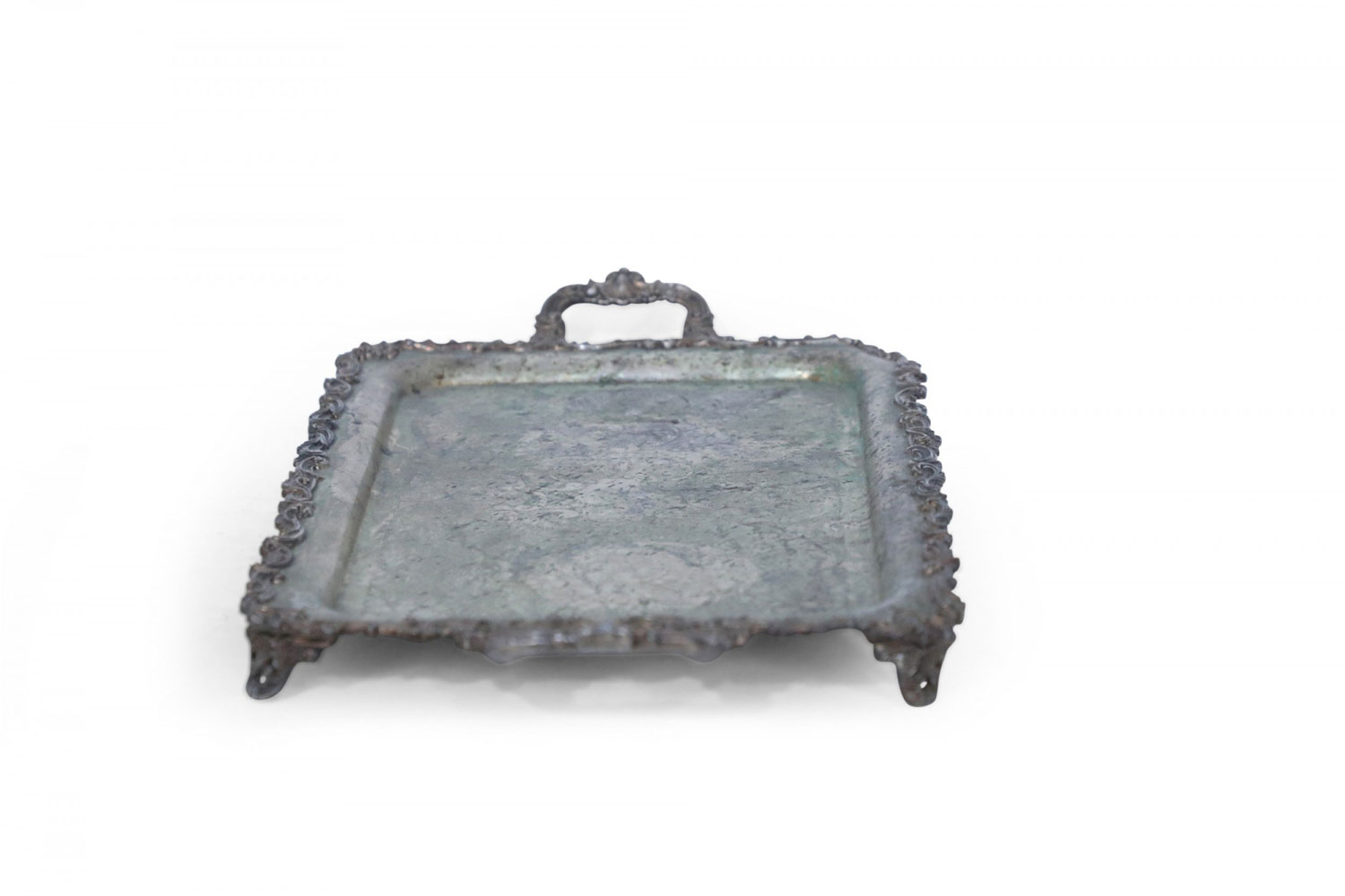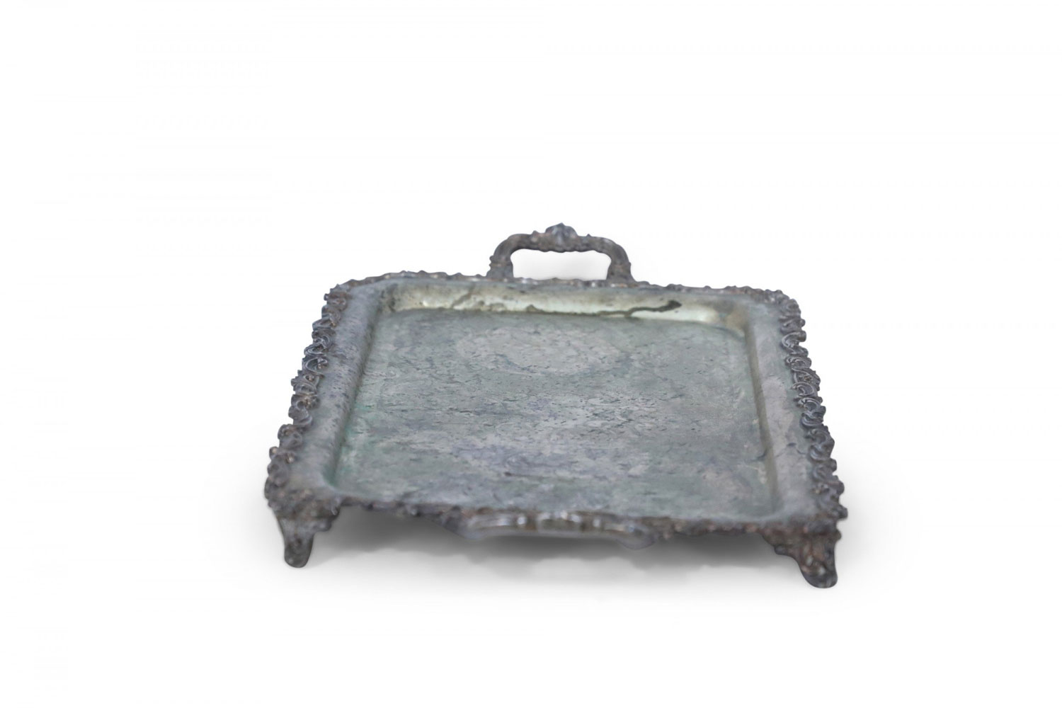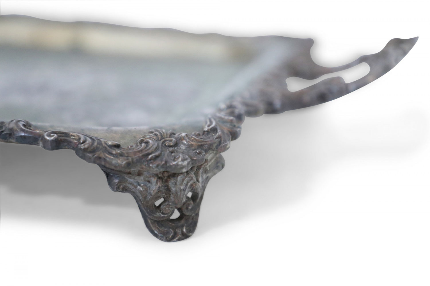 English Victorian silver plate rectangular serving tray with a heavy patina, engraved surface, and ornate handles, border, and four feet..