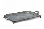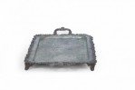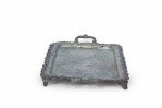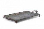 English Victorian silver plate rectangular serving tray with a heavy patina, engraved surface, and ornate handles, border, and four feet.