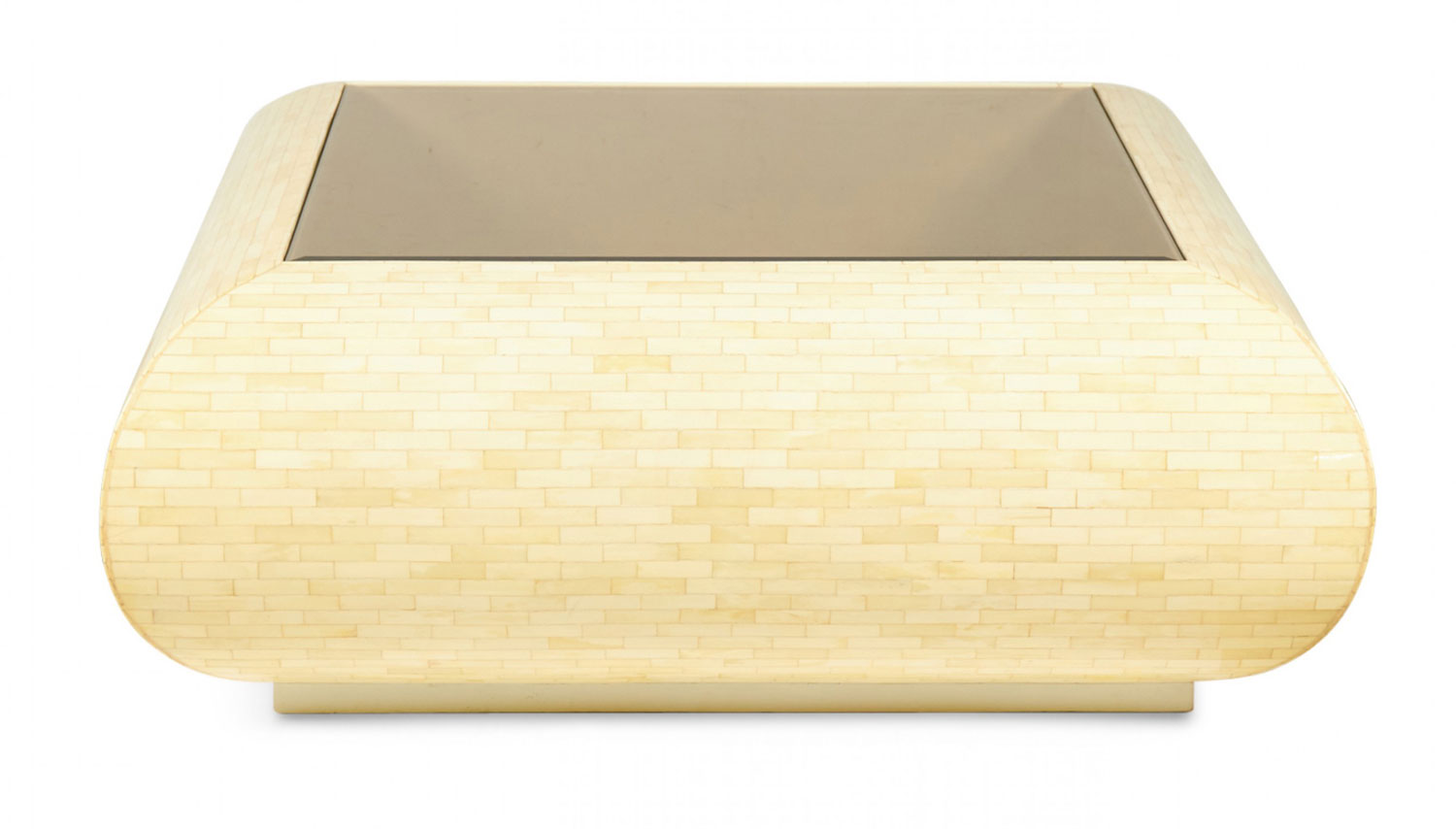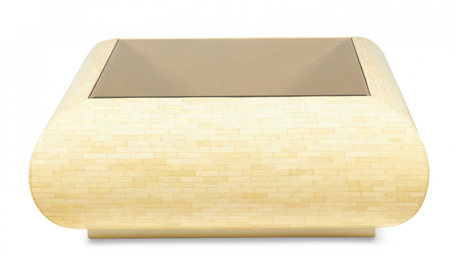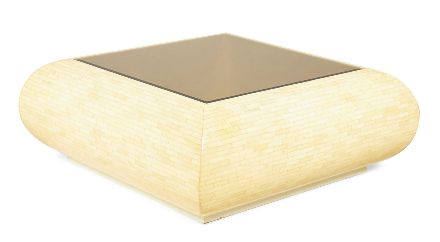 Columbian High Style (circa 1980) 'bull nose' coffee / cocktail table with rectangular tiled bone veneer over its rounded square form with a square inset smoked glass table top. (clear glass insert also available)(ENRIQUE GARCES)