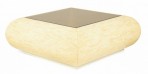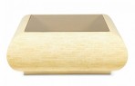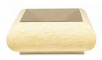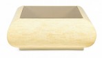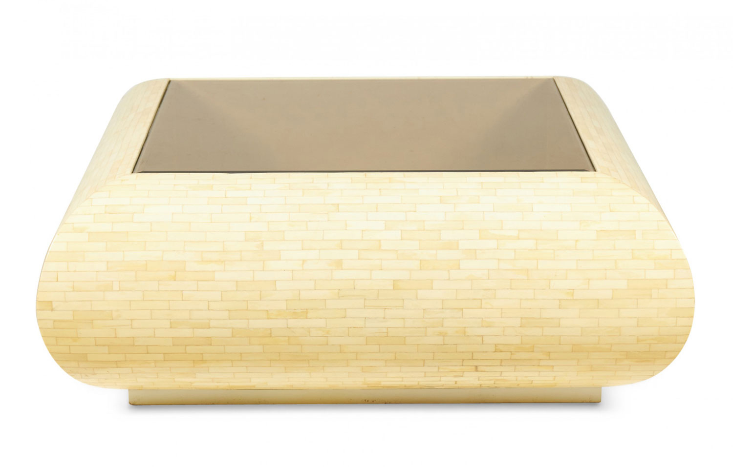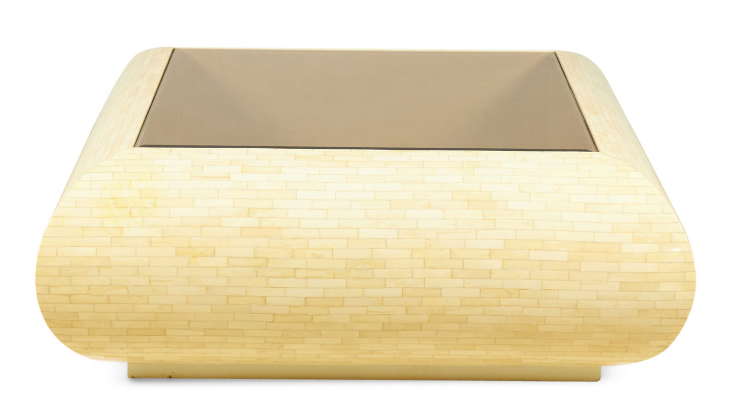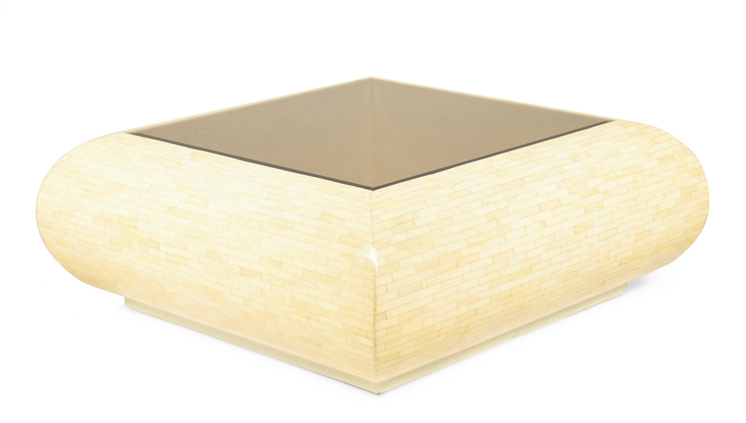 Columbian High Style (circa 1980) 'bull nose' coffee / cocktail table with rectangular tiled bone veneer over its rounded square form with a square inset smoked glass table top. (clear glass insert also available)(ENRIQUE GARCES)