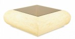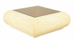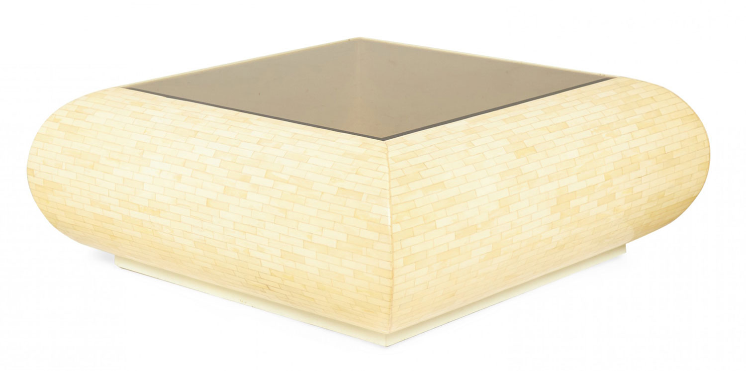 Columbian High Style (circa 1980) 'bull nose' coffee / cocktail table with rectangular tiled bone veneer over its rounded square form with a square inset smoked glass table top. (clear glass insert also available)(ENRIQUE GARCES).