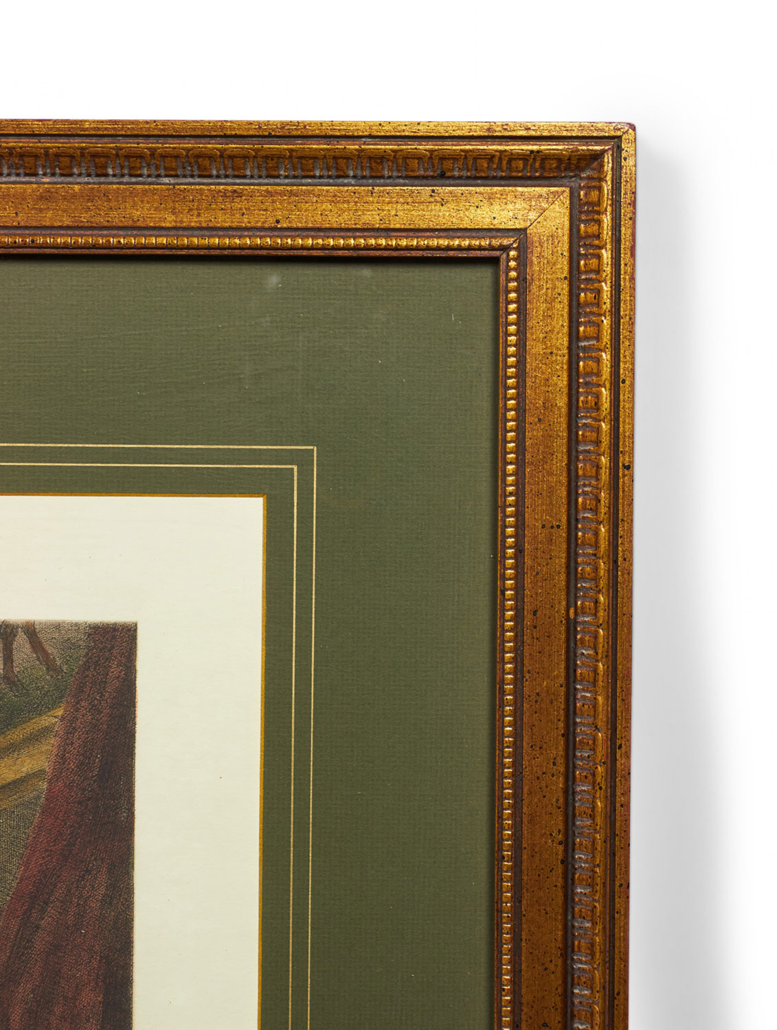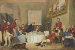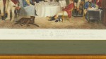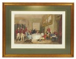 English Victorian-style lithograph print of a group of men, some in red tailcoats, gathering in a well-appointed parlor for breakfast in a rectangular wooden frame and dark green mat. (similar items 062902-062921).