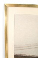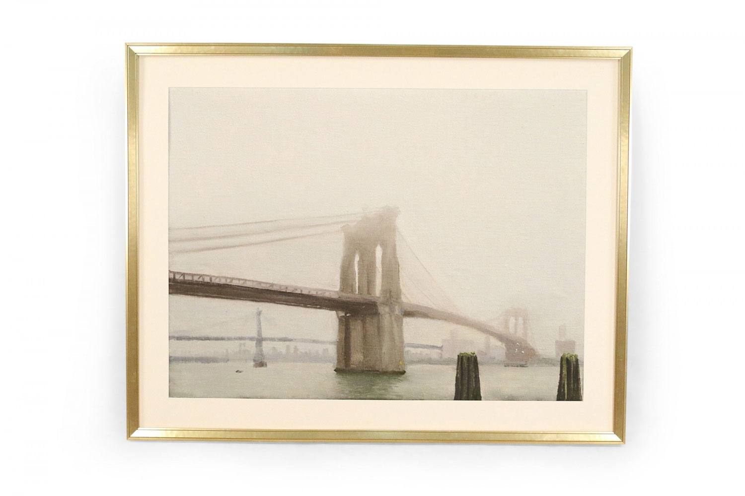 Contemporary watercolor painting of an urban bridge in fog in a gilt metal rectangular frame with a beige mat..